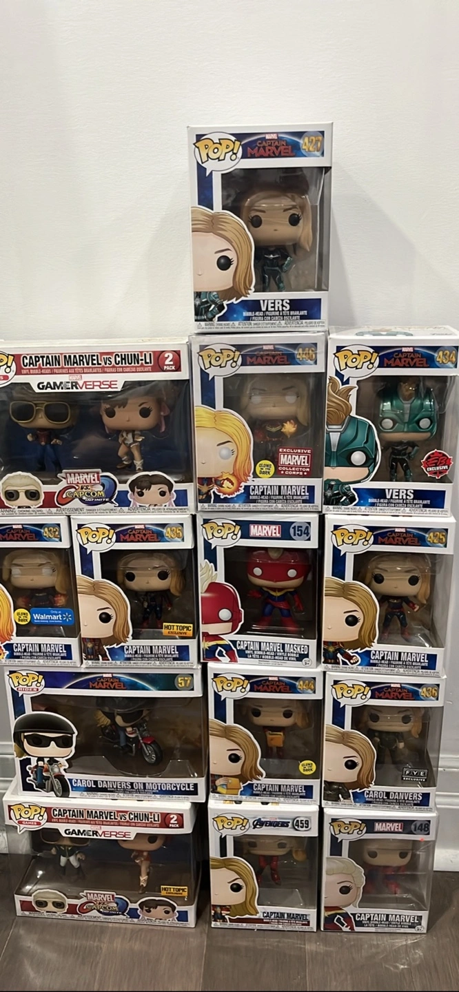 Collection of Captain Marvel Funko Pop! vinyl figures. Includes various versions and exclusives. Some are from Walmart and Hot Topic. Gamerverse figures included. 50 for ALL