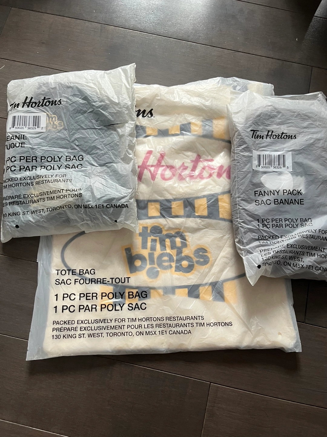 New Tim Hortons beanie, tote bag and fanny pack. Both items individually packaged. Sold as a set. Limited editions brand new tim biebs