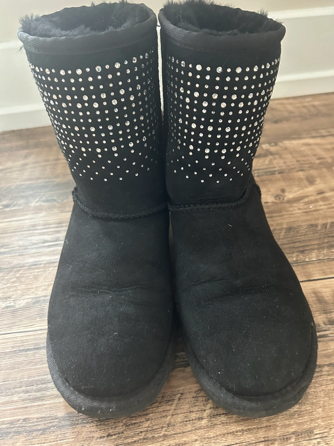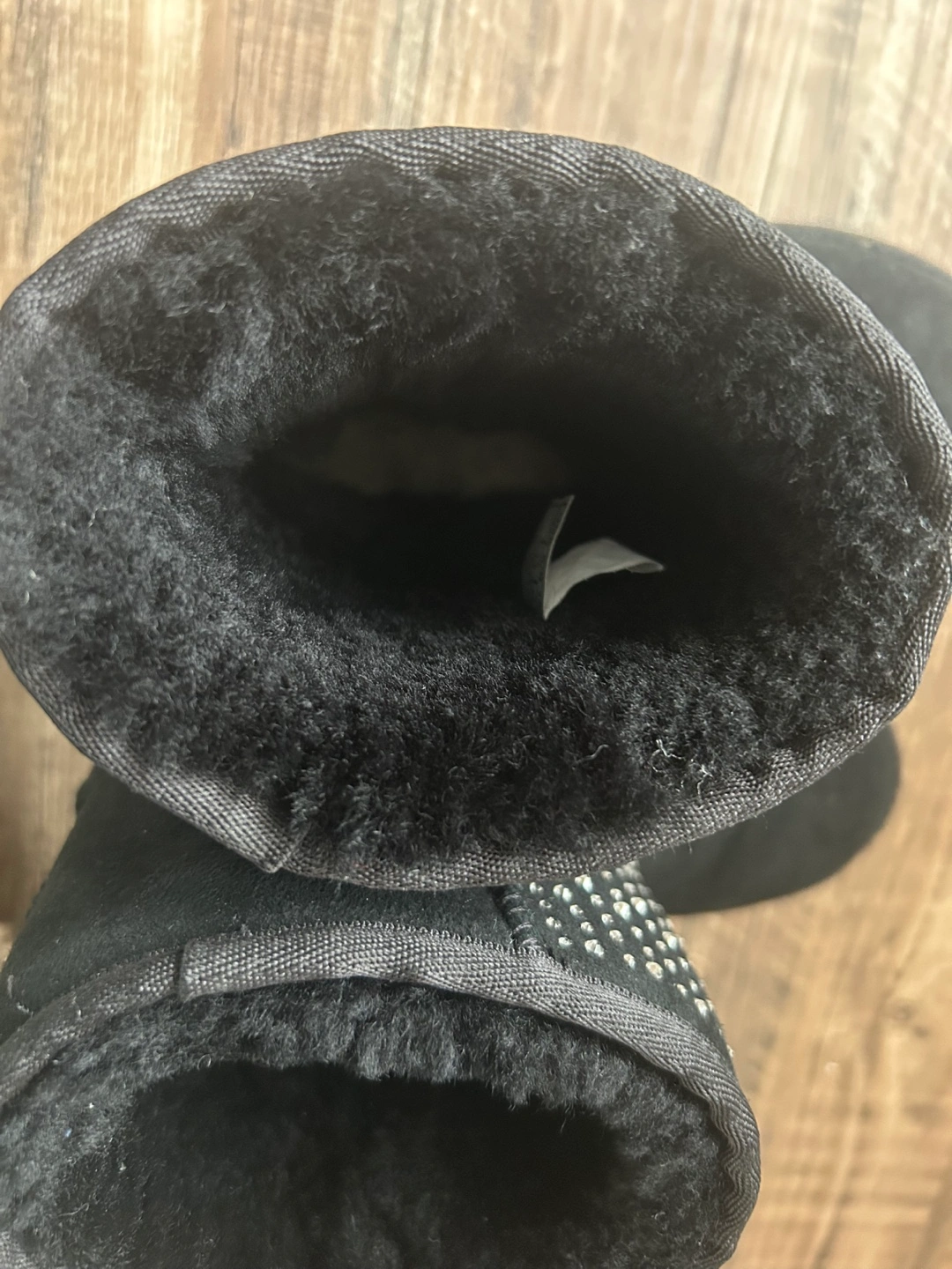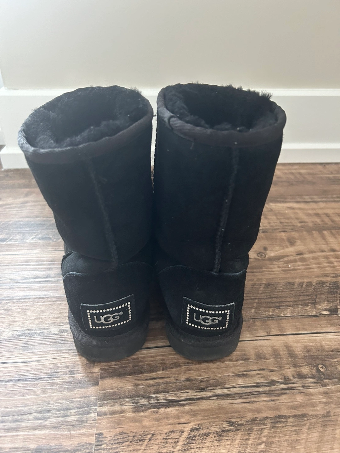 Black suede UGG mini boots. Features a rhinestone embellishment on the shaft. Women's size 6 EU37.