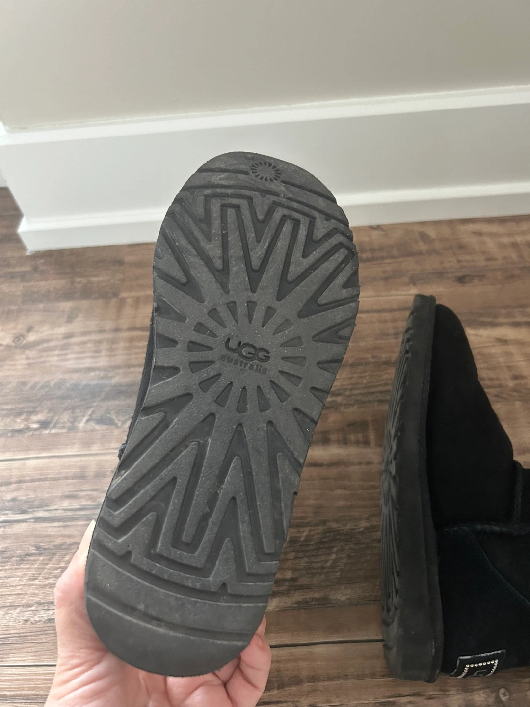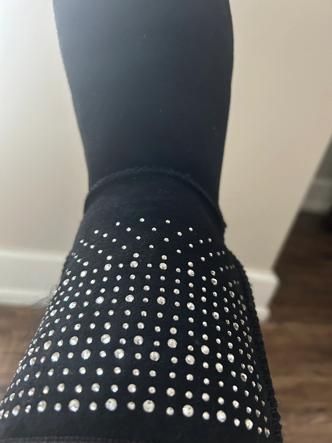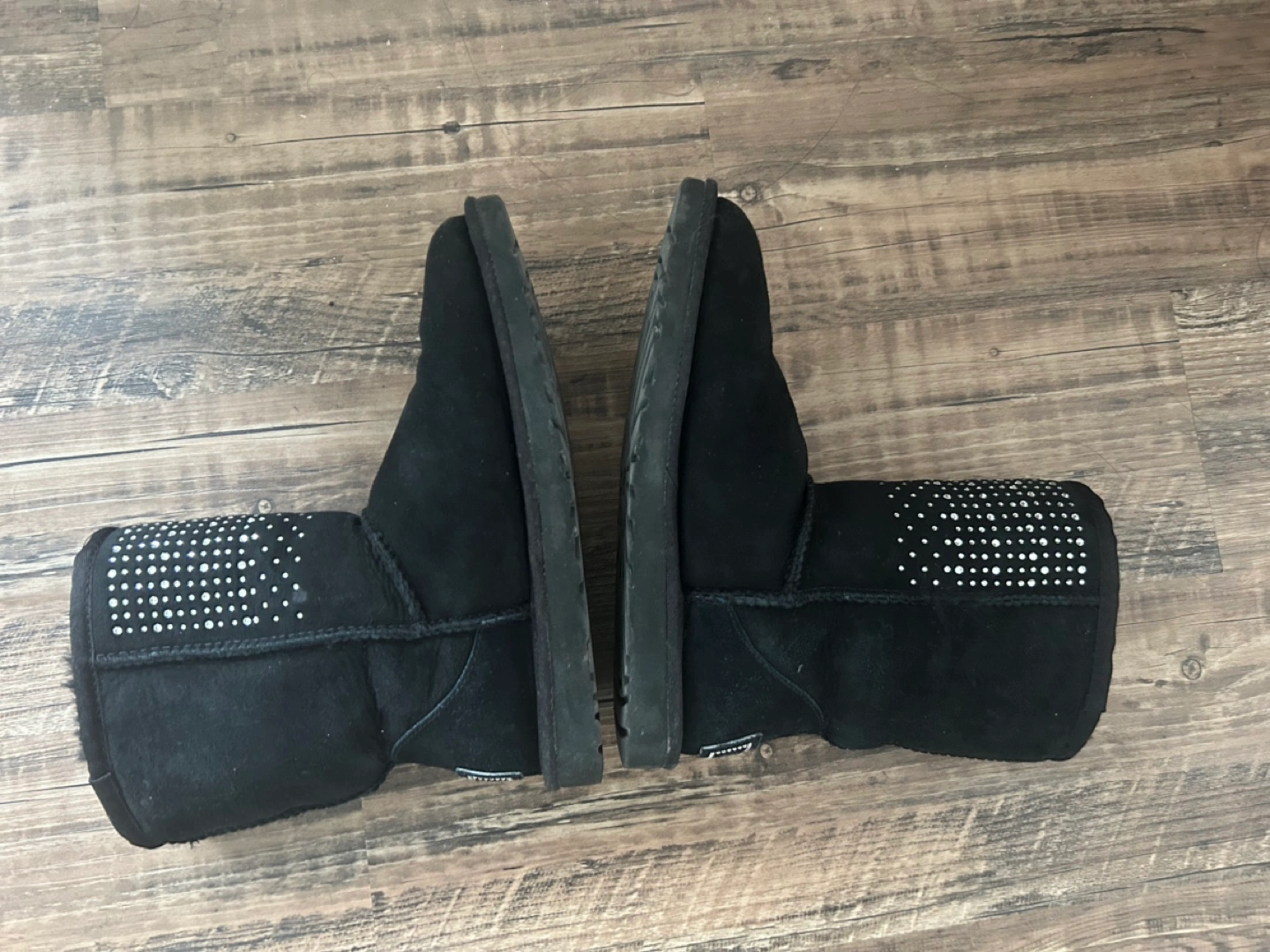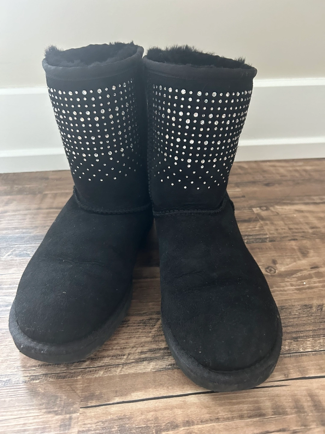 Black suede UGG mini boots. Features a rhinestone embellishment on the shaft. Women's size 6 EU37.