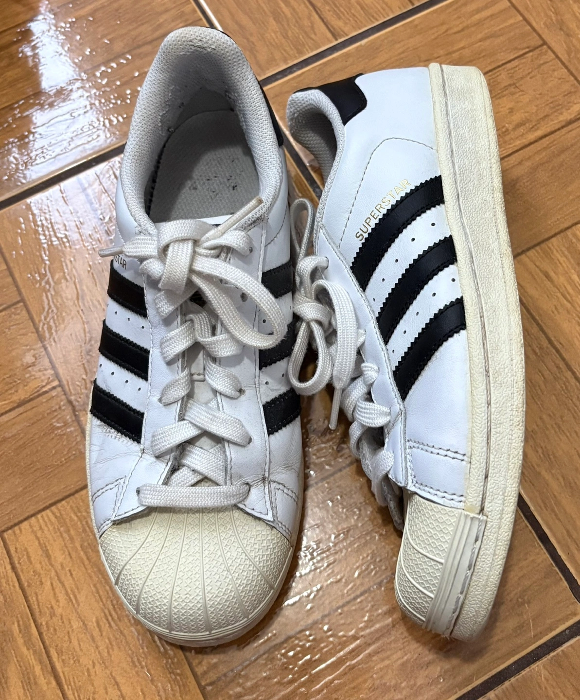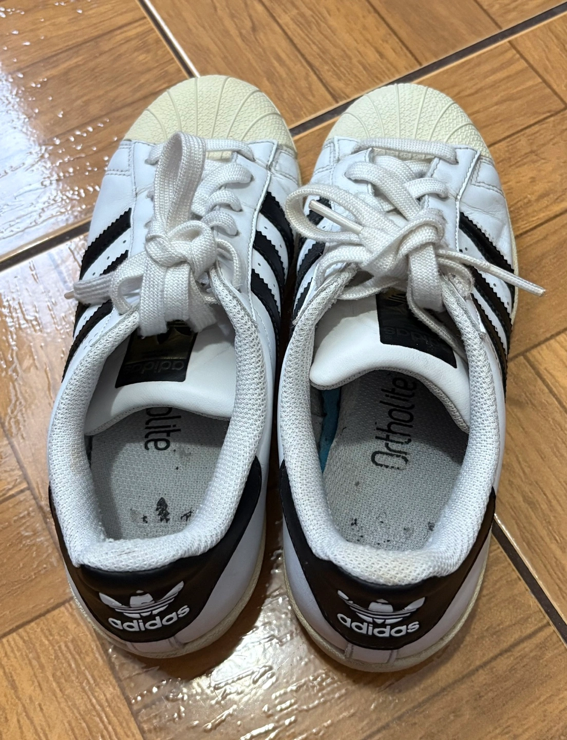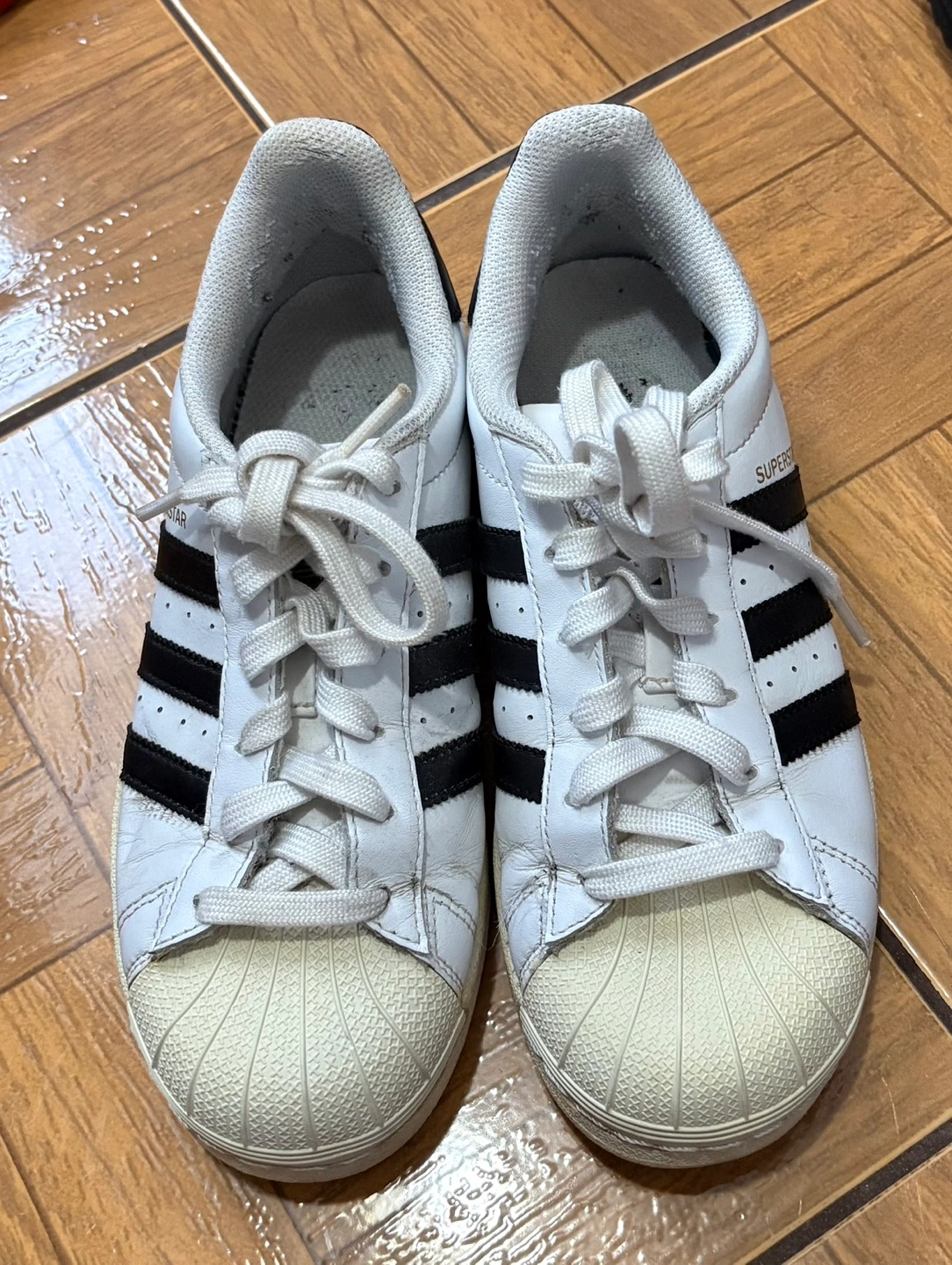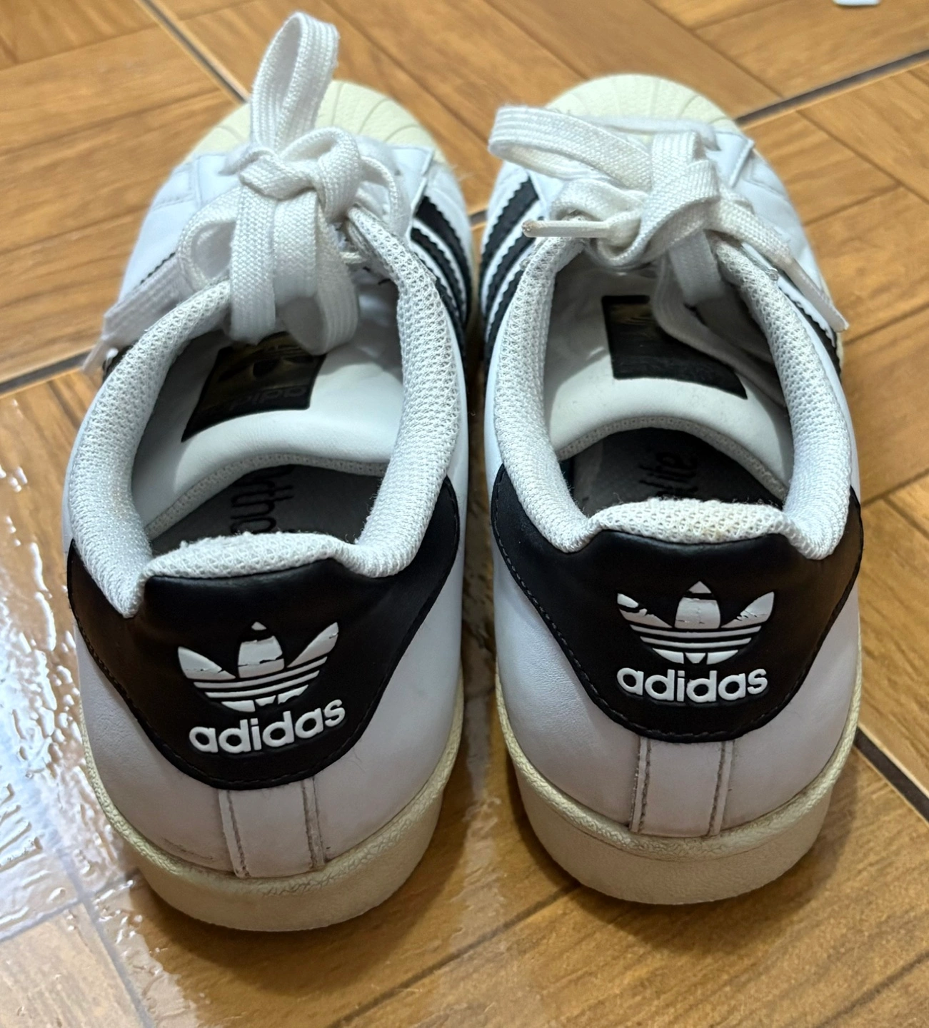 White leather Adidas Superstar sneakers. Black stripes. Classic style. Pre-owned. No Box.