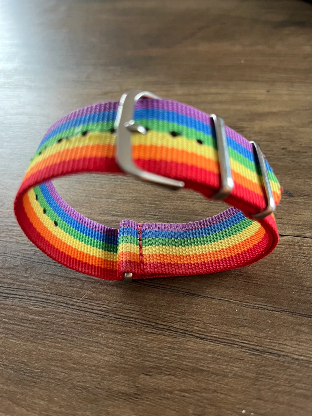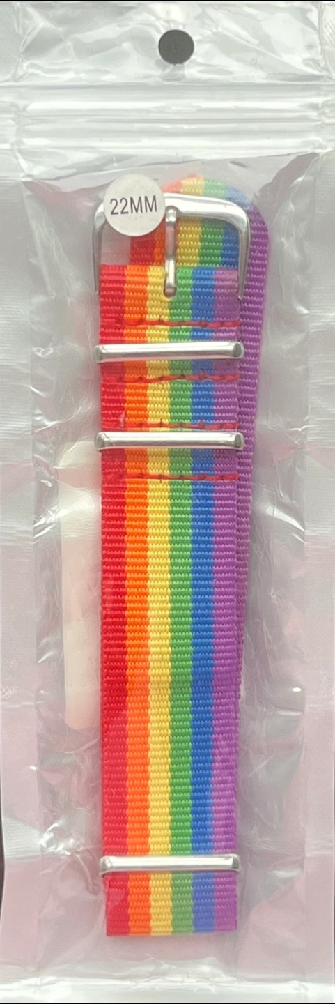 Durable rainbow-striped nylon watch band. Silver-toned buckle. Great for adding a pop of colour to your watch.