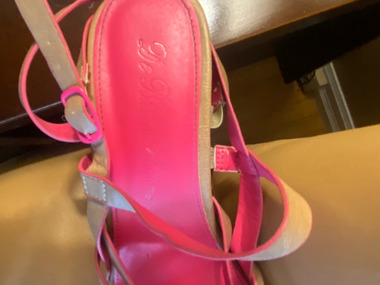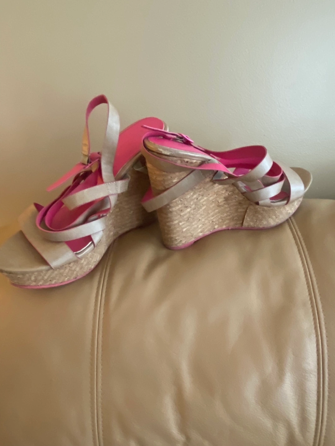 Stylish beige and pink wedge sandals. Adjustable ankle strap. Cork wedge heel. Great for summer.