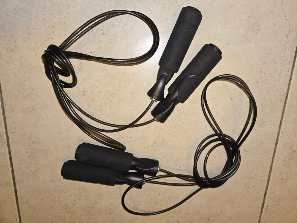 Two high quality fitness jump ropes, black foam handles, strong cable. Good for exercise. $12 for the one with no damage, $10 for the one with the split in the foam (does not affect feeling or functionality). $20 for both.