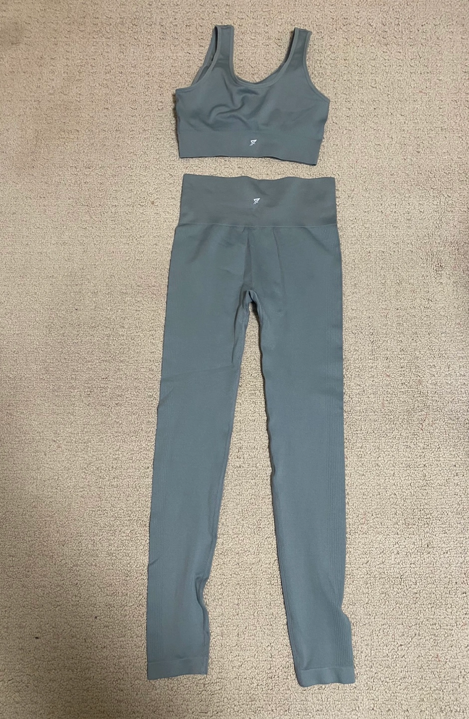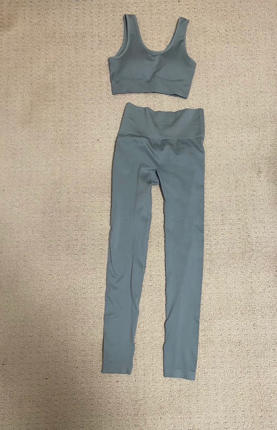 Workout set includes a sports bra and leggings. Sage green colour. Size XS. Perfect for yoga, pilates, or the gym. Activewear