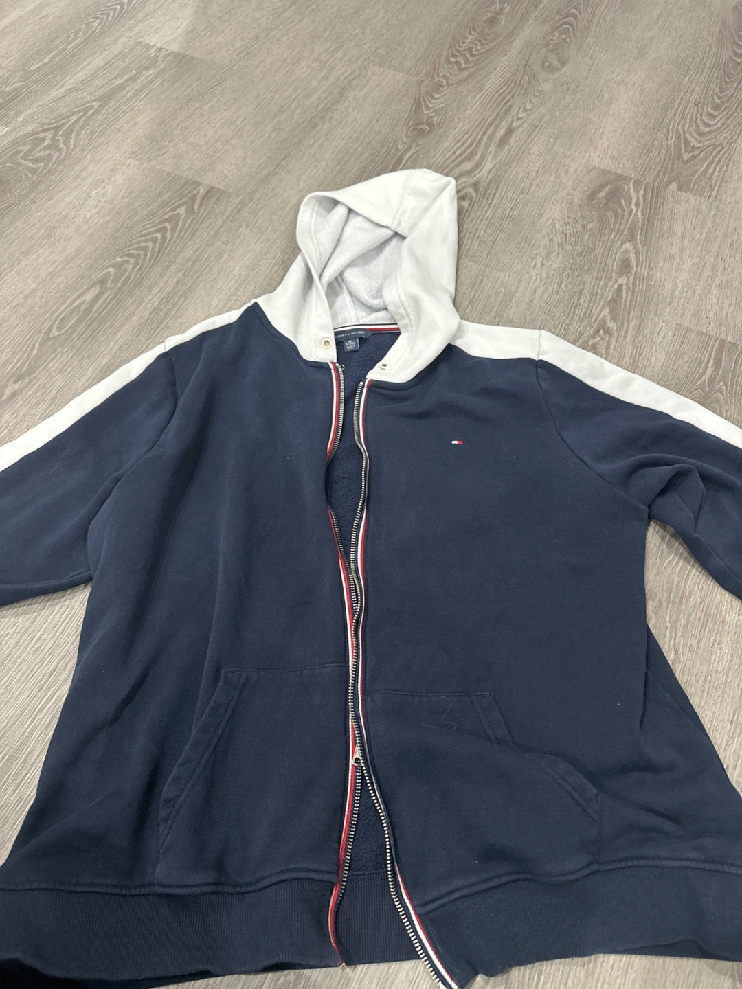 navy blue zip-up hoodie. Features a grey hood and red, white, and navy stripes along the zipper. Front pouch pocket. Size XL. *cash only*