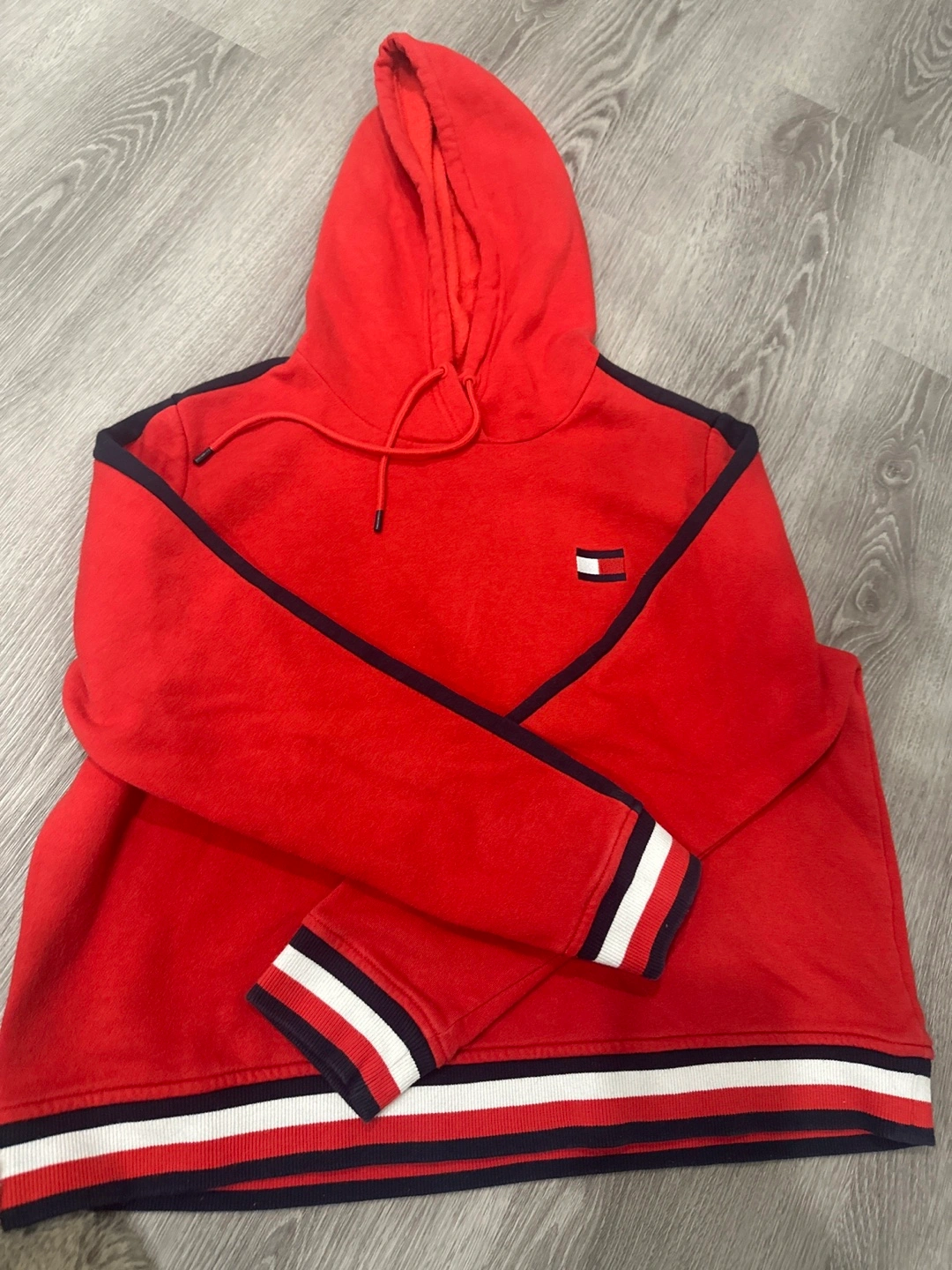Red hoodie, drawstring hood. Features navy and white stripes at cuffs and hem. Large Tommy Hilfiger logo on chest. Cash only