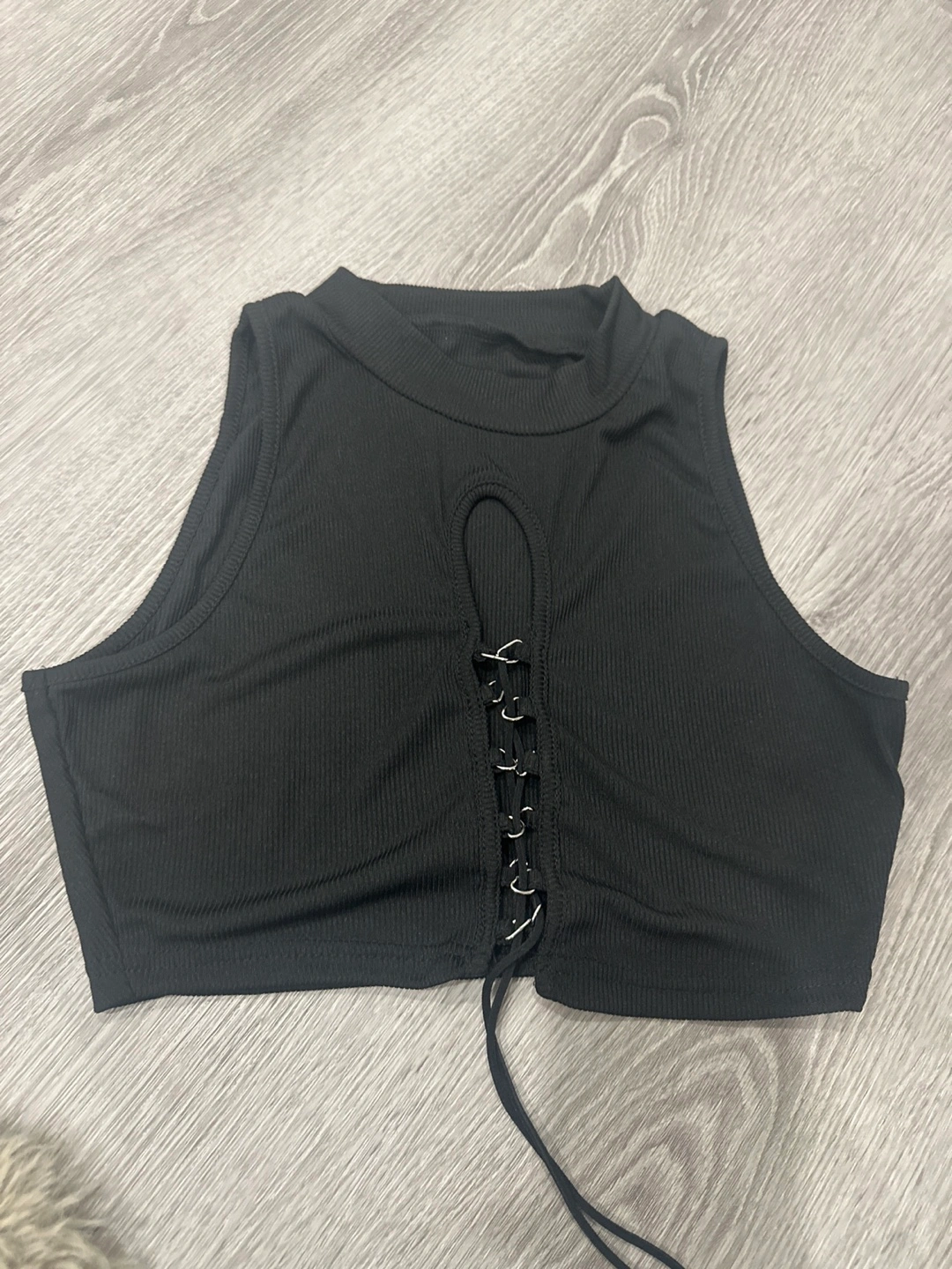 Sleeveless black crop top. Ribbed material. Features a lace-up detail at the front. Good for layering or wearing alone. Cash only