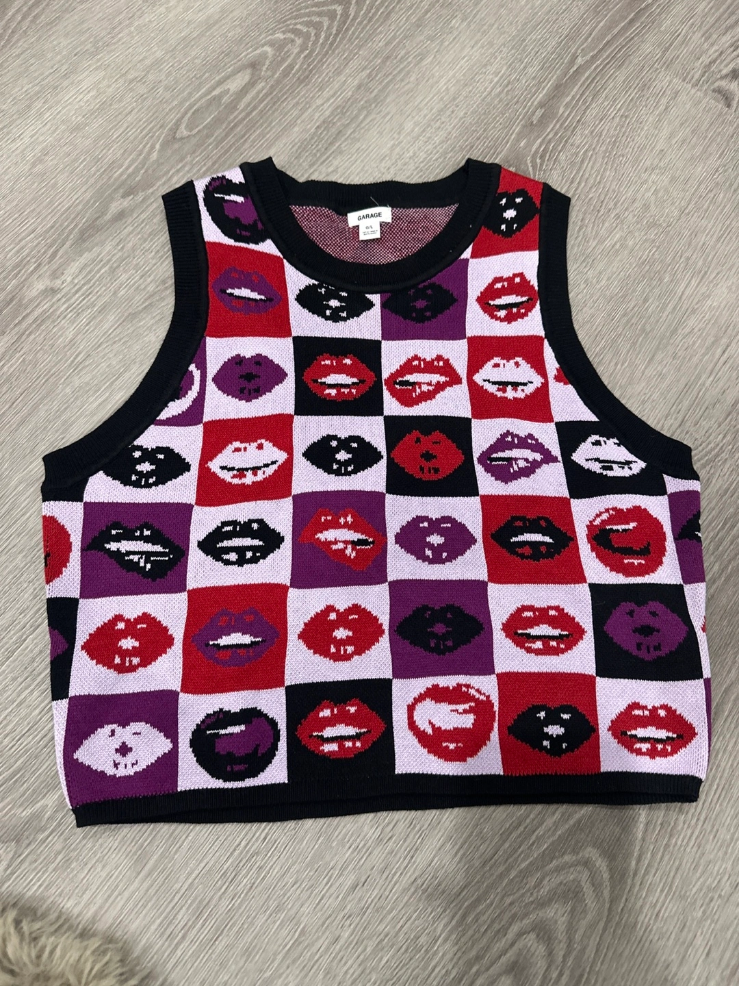 Women's sleeveless knit top. Checkered pattern featuring lips in various colours. Size large. Cash only