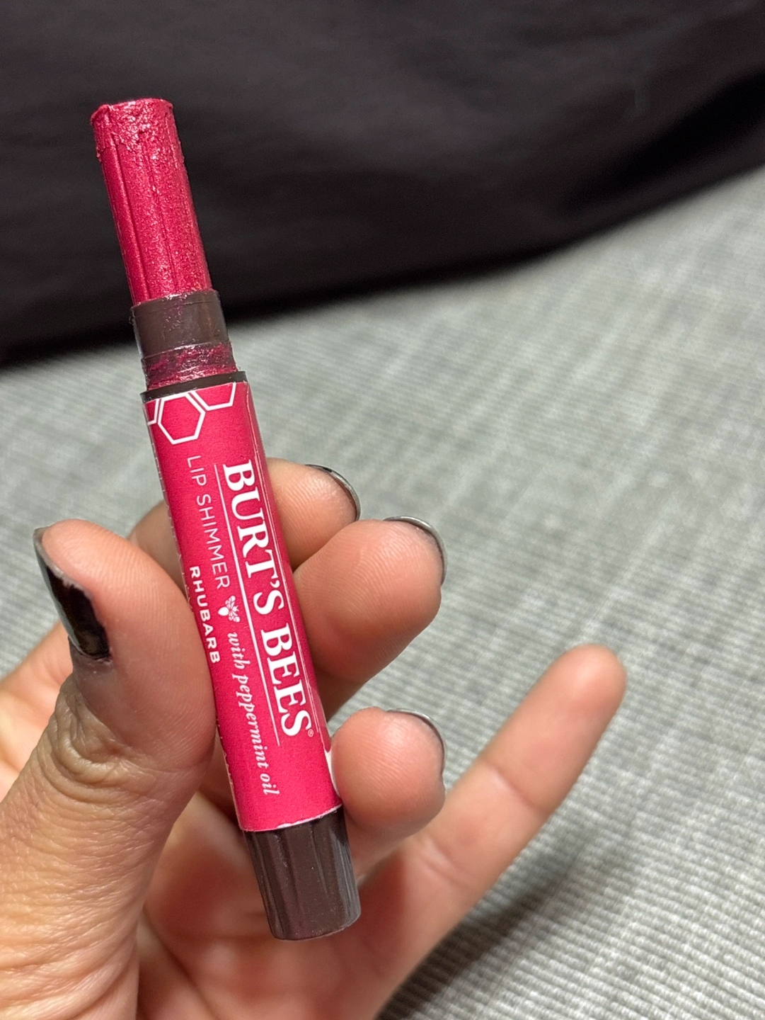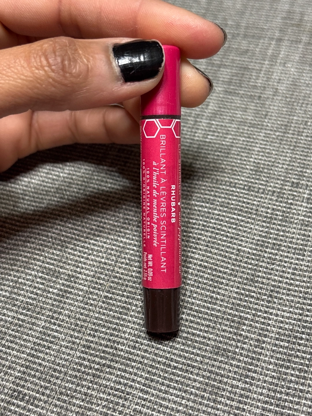 Rhubarb-flavoured lip shimmer. Convenient stick applicator. Peppermint oil. I used not but I don’t like the shade