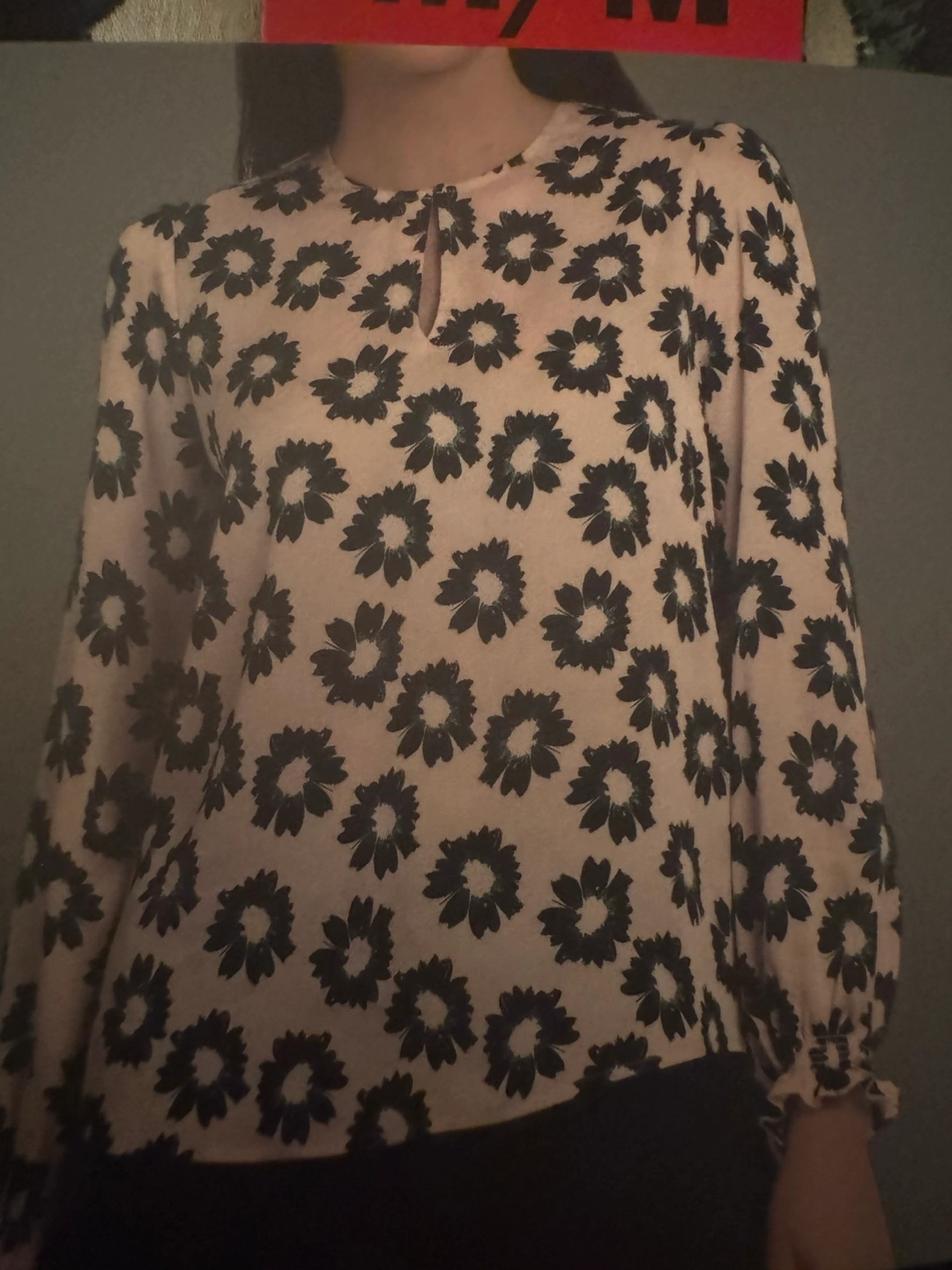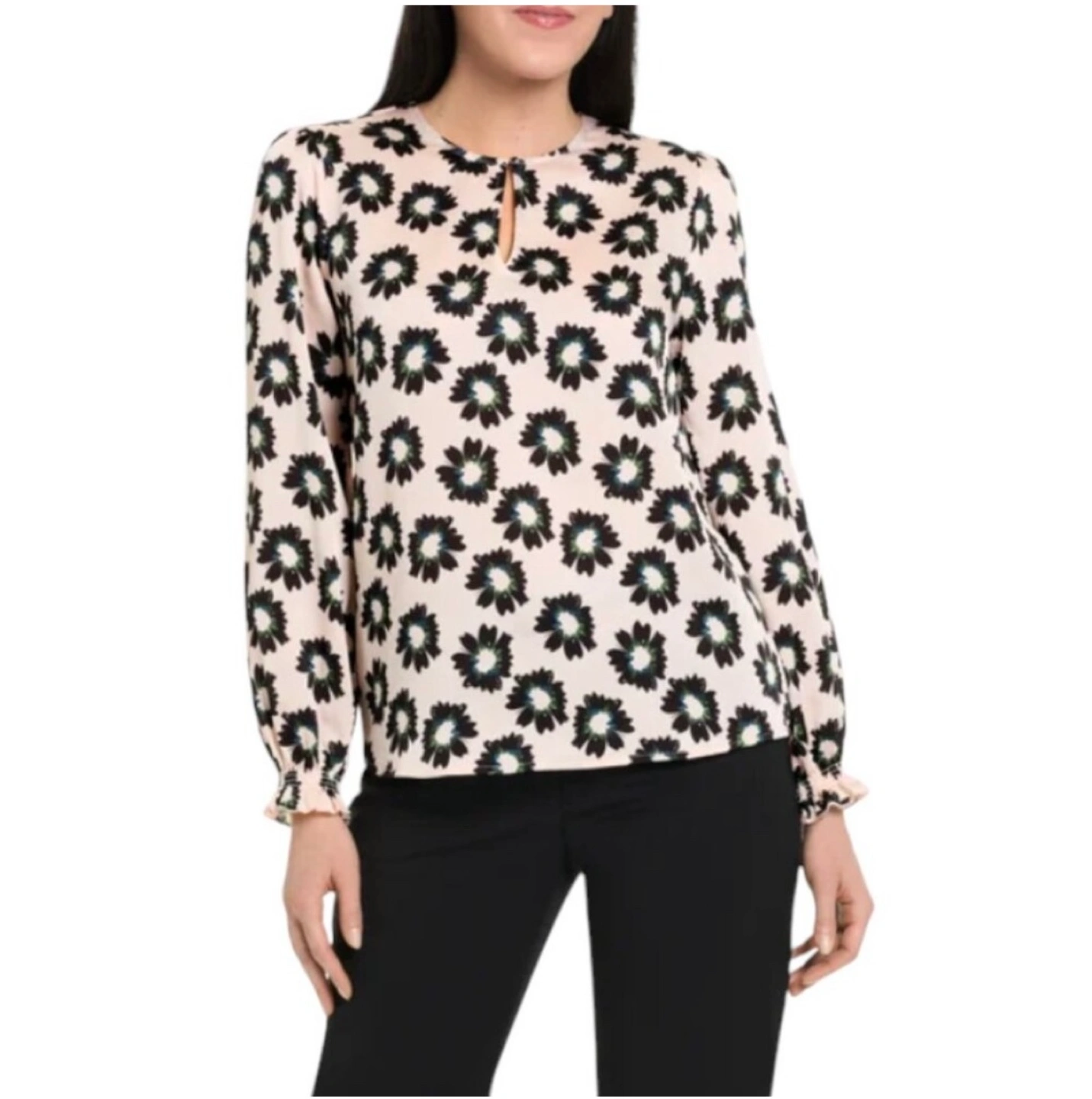 Beautiful Ted Baker blouse. Features a floral print on a blush pink background. Long sleeves with ruffled cuffs. Keyhole neckline. NEW with tag