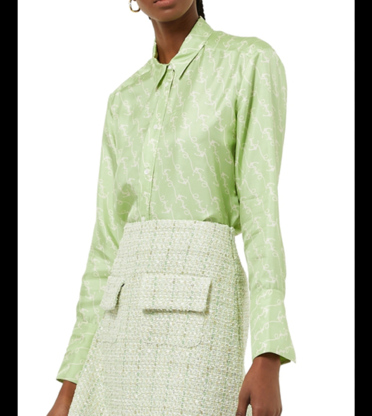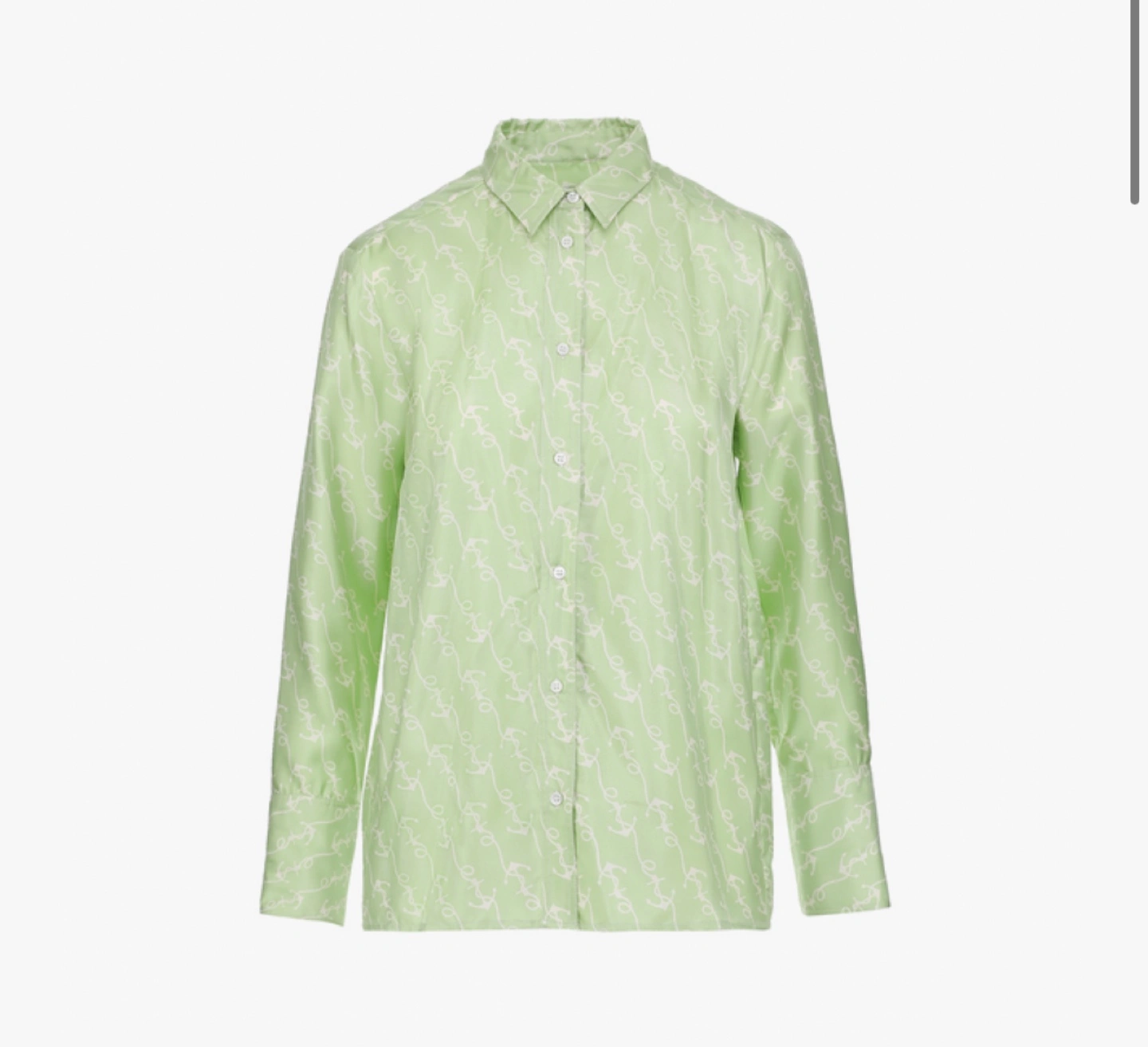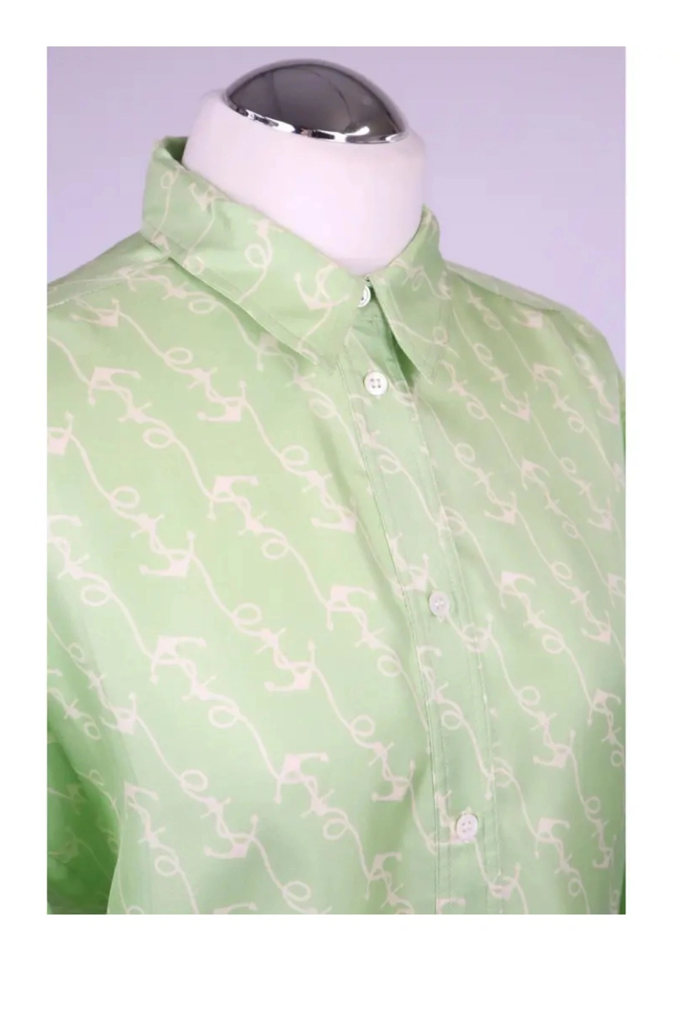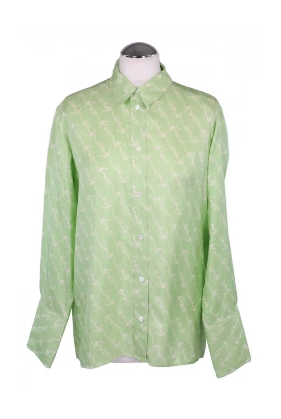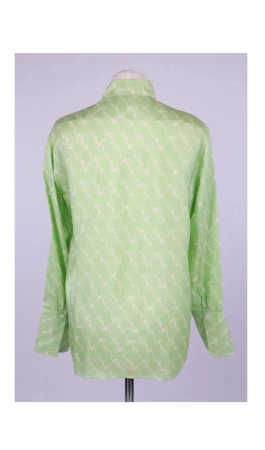 Beautiful light green silk blouse. Long sleeves, collared shirt. All-over print. Button closure. I also have lots of other new or lightly used women’s clothes for sale mostly size S, please contact if you want to come have a look at all of them, thank you.