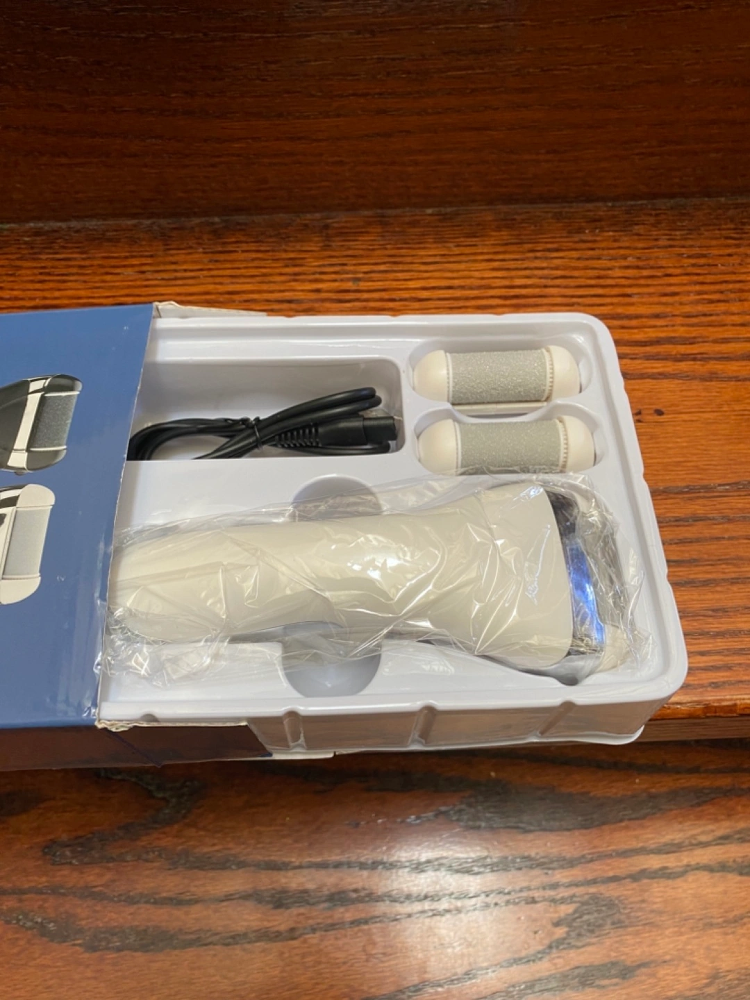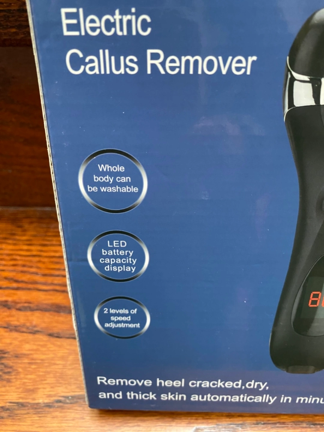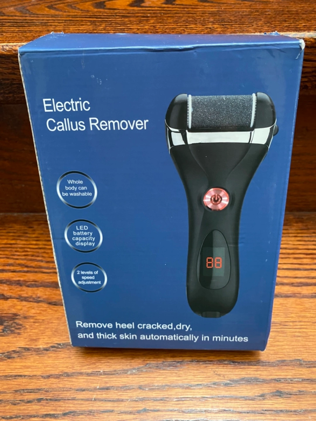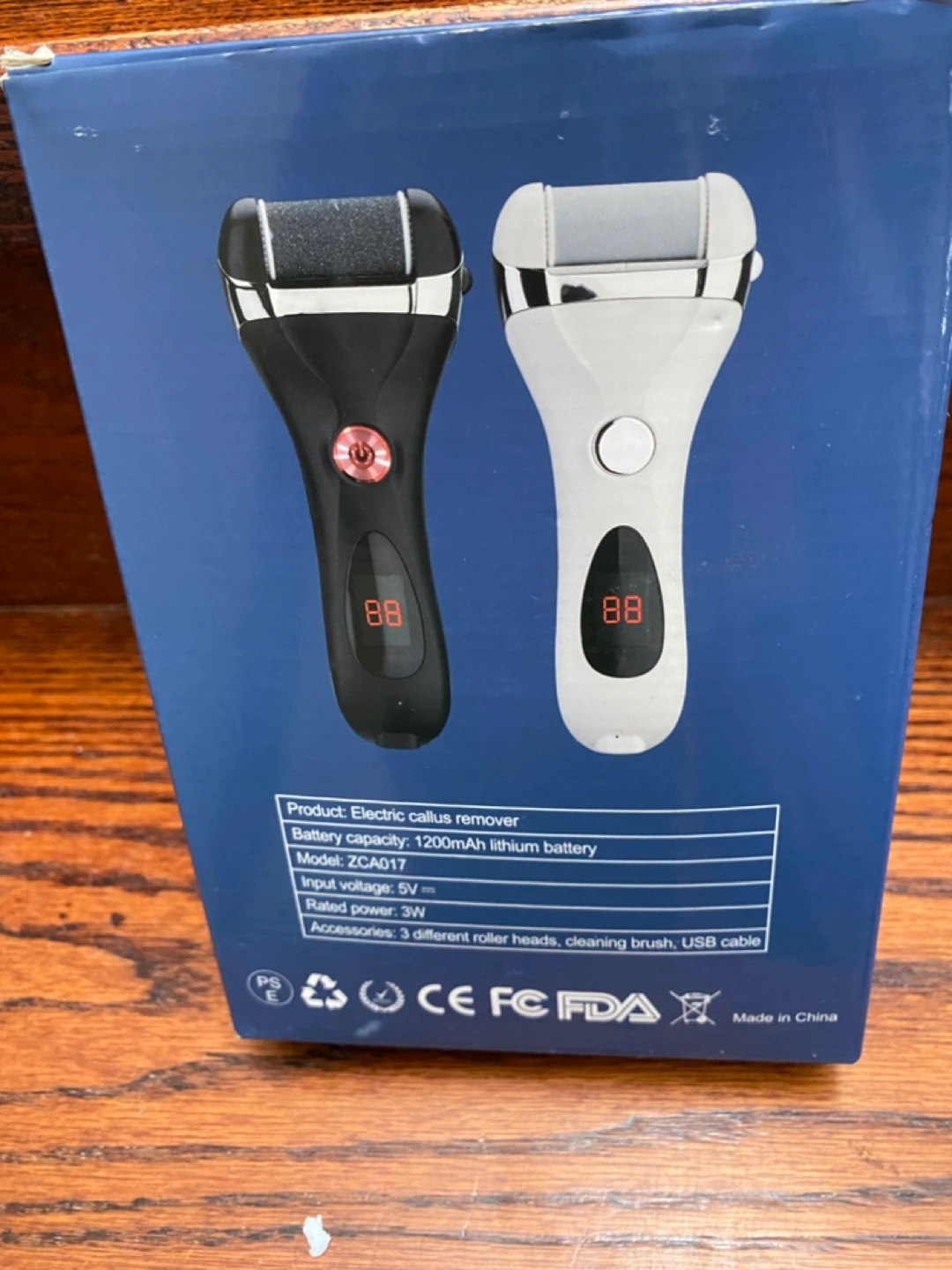 New Electric callus remover. Two speed settings. LED battery capacity display. Includes three roller heads, cleaning brush and USB cable. Removes cracked, dry, and thick skin. Whole body washable. Model ZCA017. 1200mAh lithium battery. Cash only