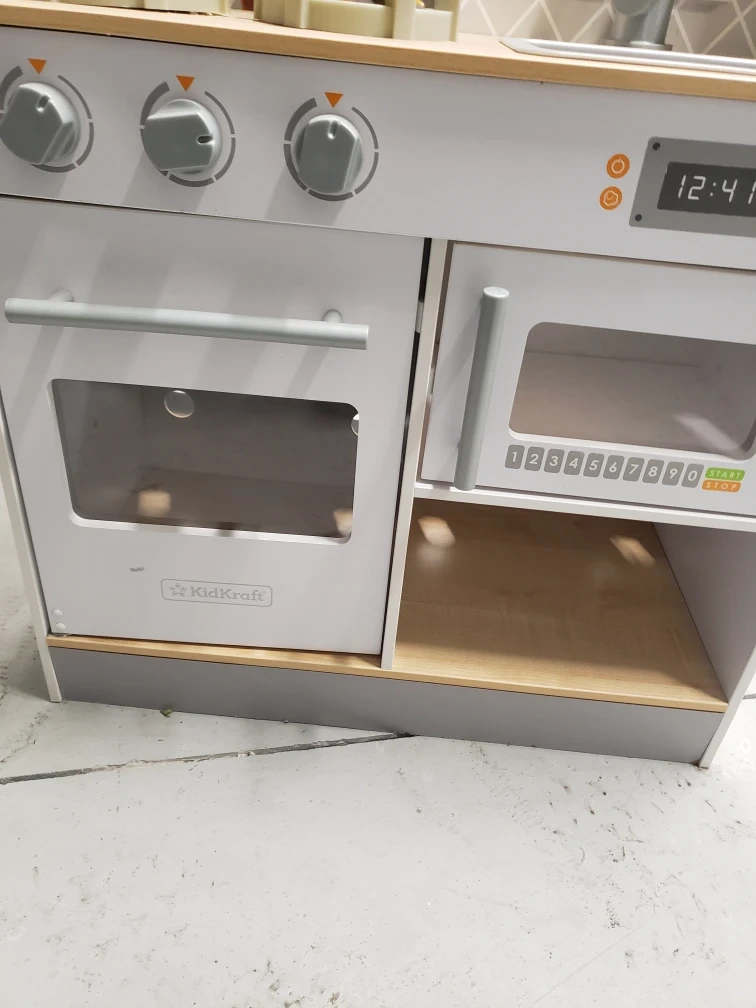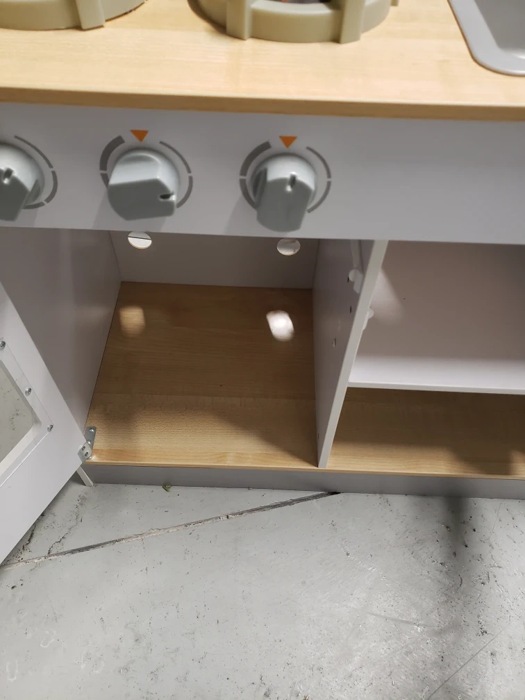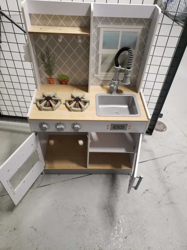 Children's pretend play kitchen. Features a sink, two burner stovetop, oven, and storage. Wooden construction. Neutral colours. Great for imaginative play.
