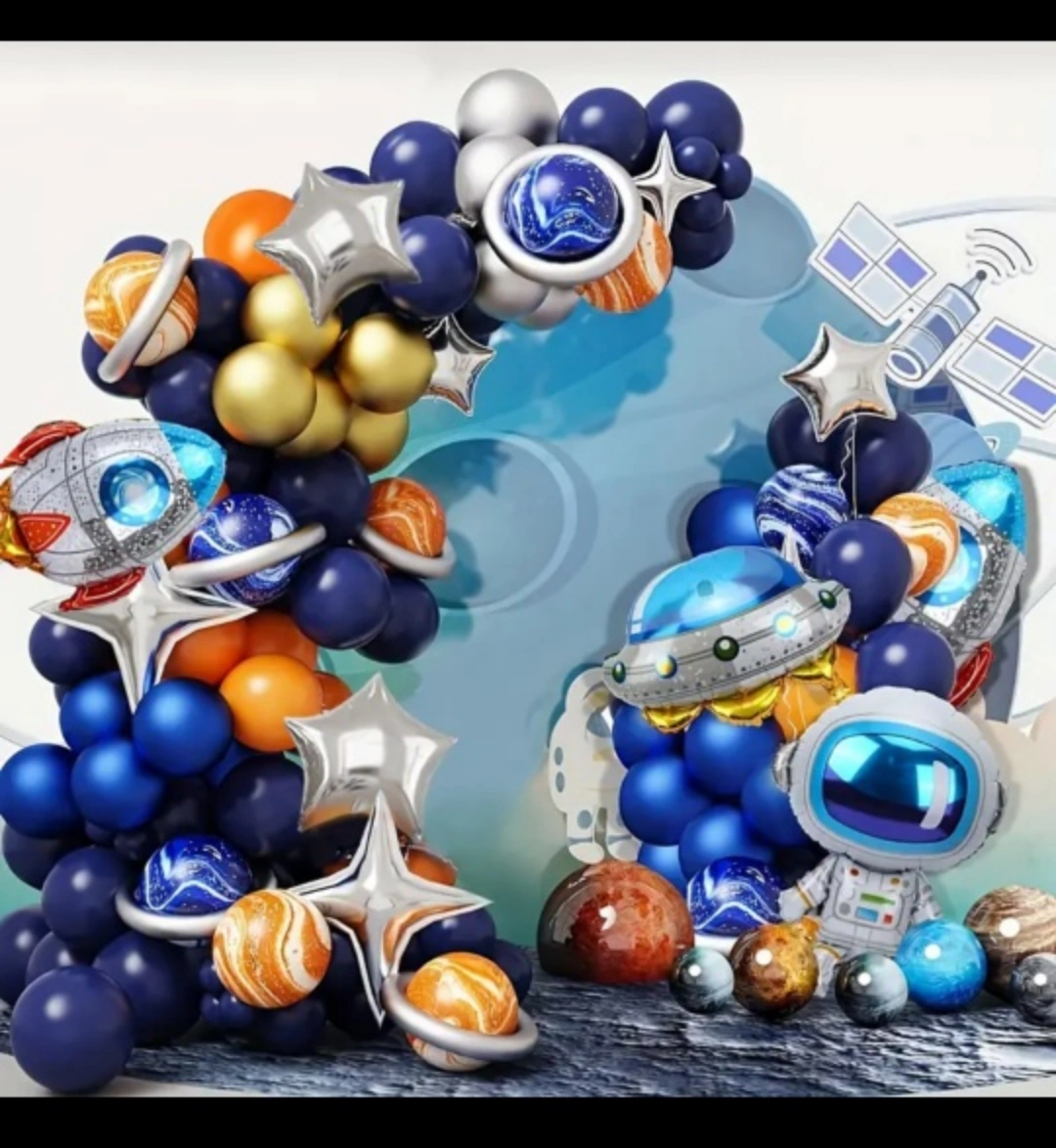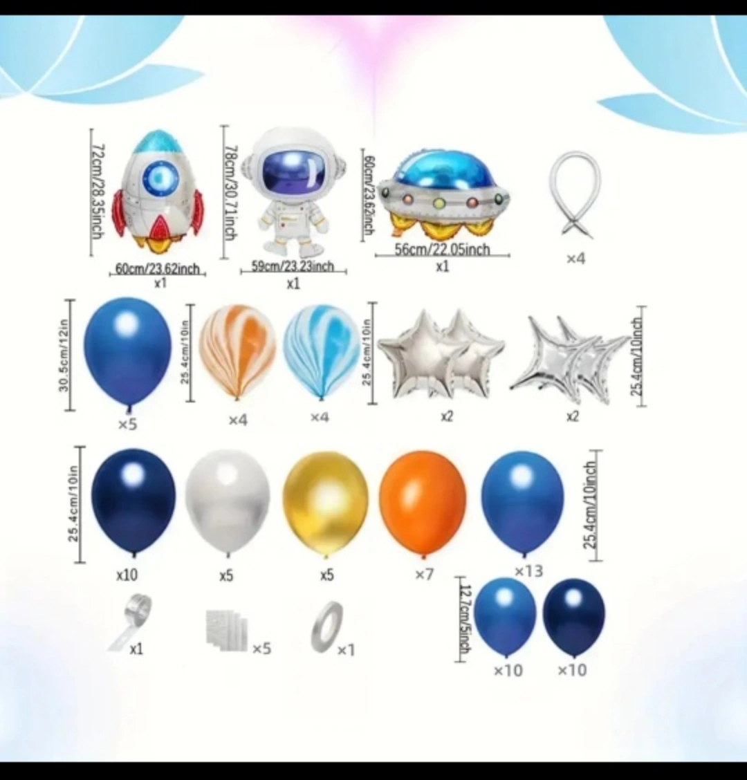 Balloon arch kit. Includes various coloured balloons, astronaut, rocke. Perfect for a space-themed party. Easy to assemble. 91PCS Blue Orange Silvery Space Party Decoration Latex Balloons, Suitable For Birthday, Party, Graduation Ceremony, Anniversary, Baptism, Summer Theme Party, Background, Home Scene Decoration, Valentine's Day, Halloween, Christmas, Thanksgiving Smoke free and pet free home Kindly note all sales are final and no return or refund Please check my other listings aswell😊