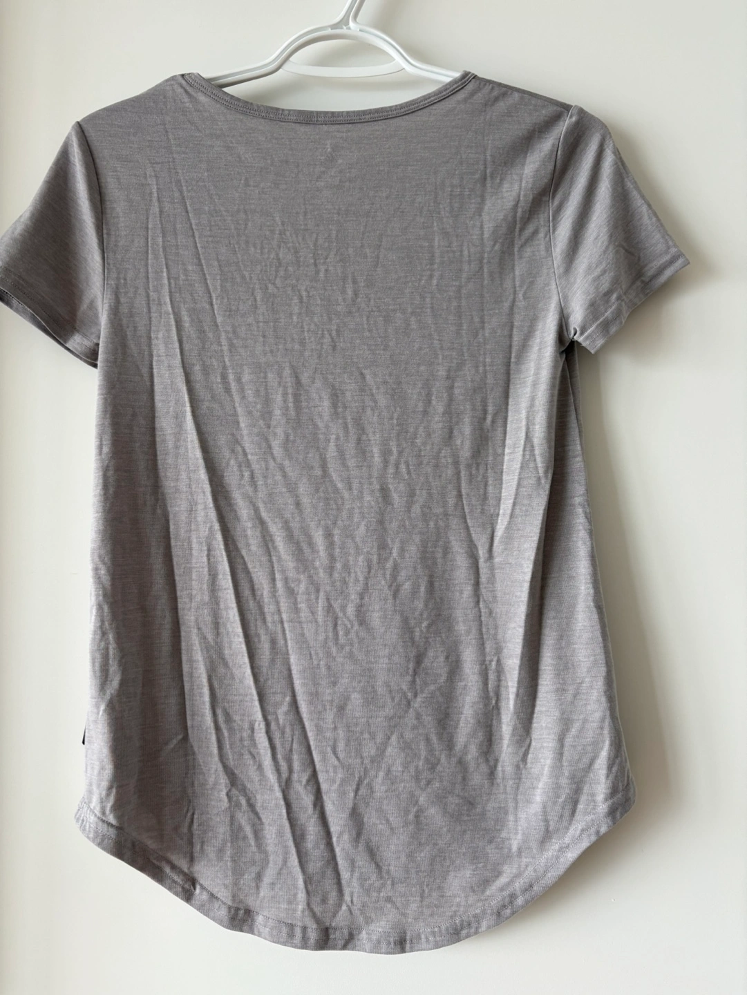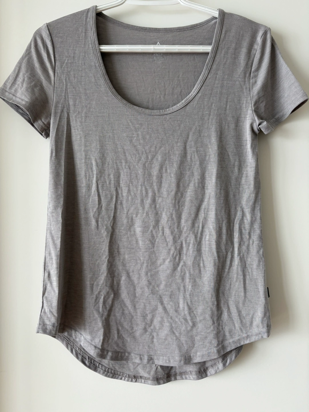 Grey scoop neck t-shirt. Short sleeves. Curved hem. Lightweight and comfortable fabric. Great for everyday wear.