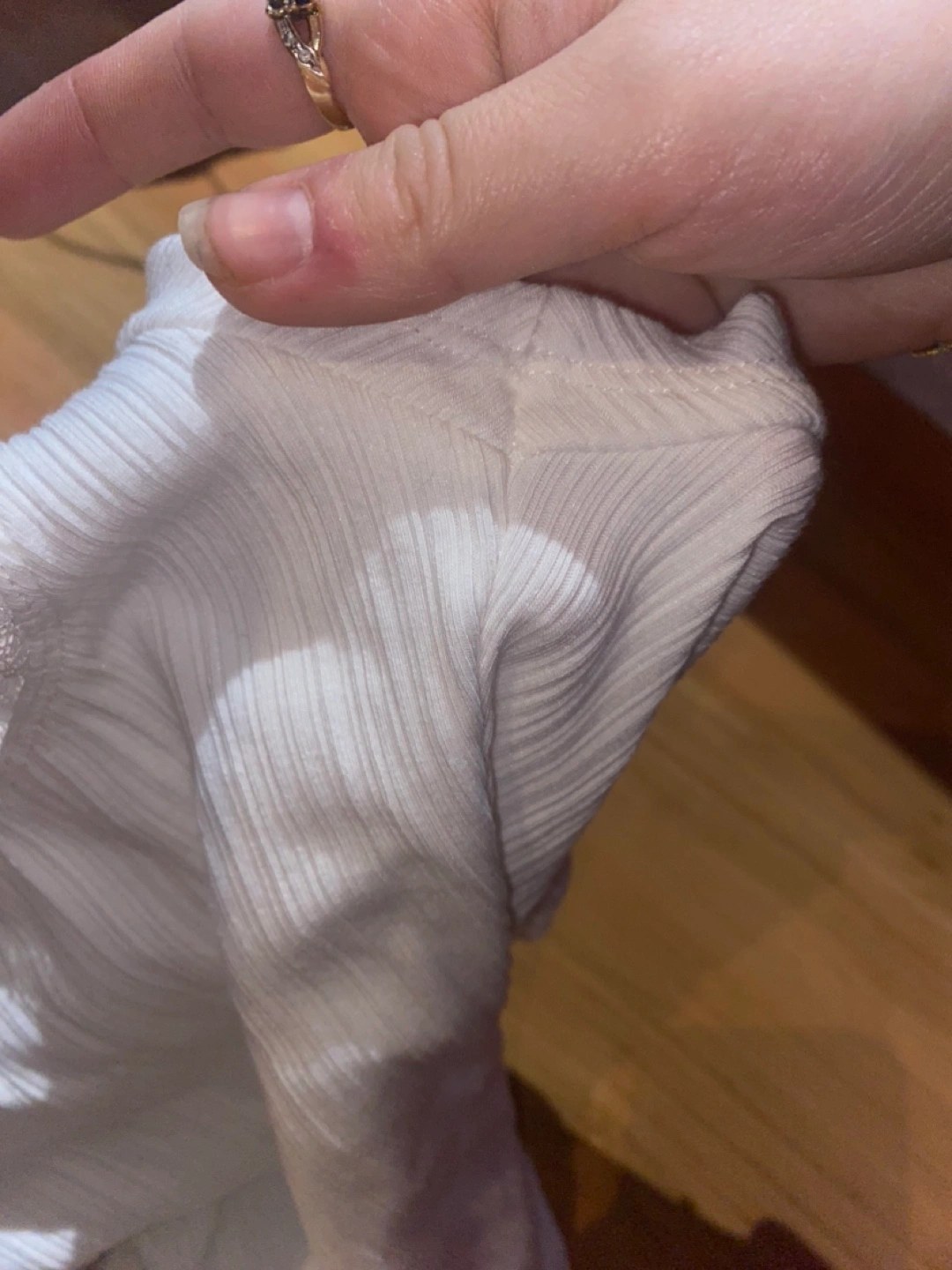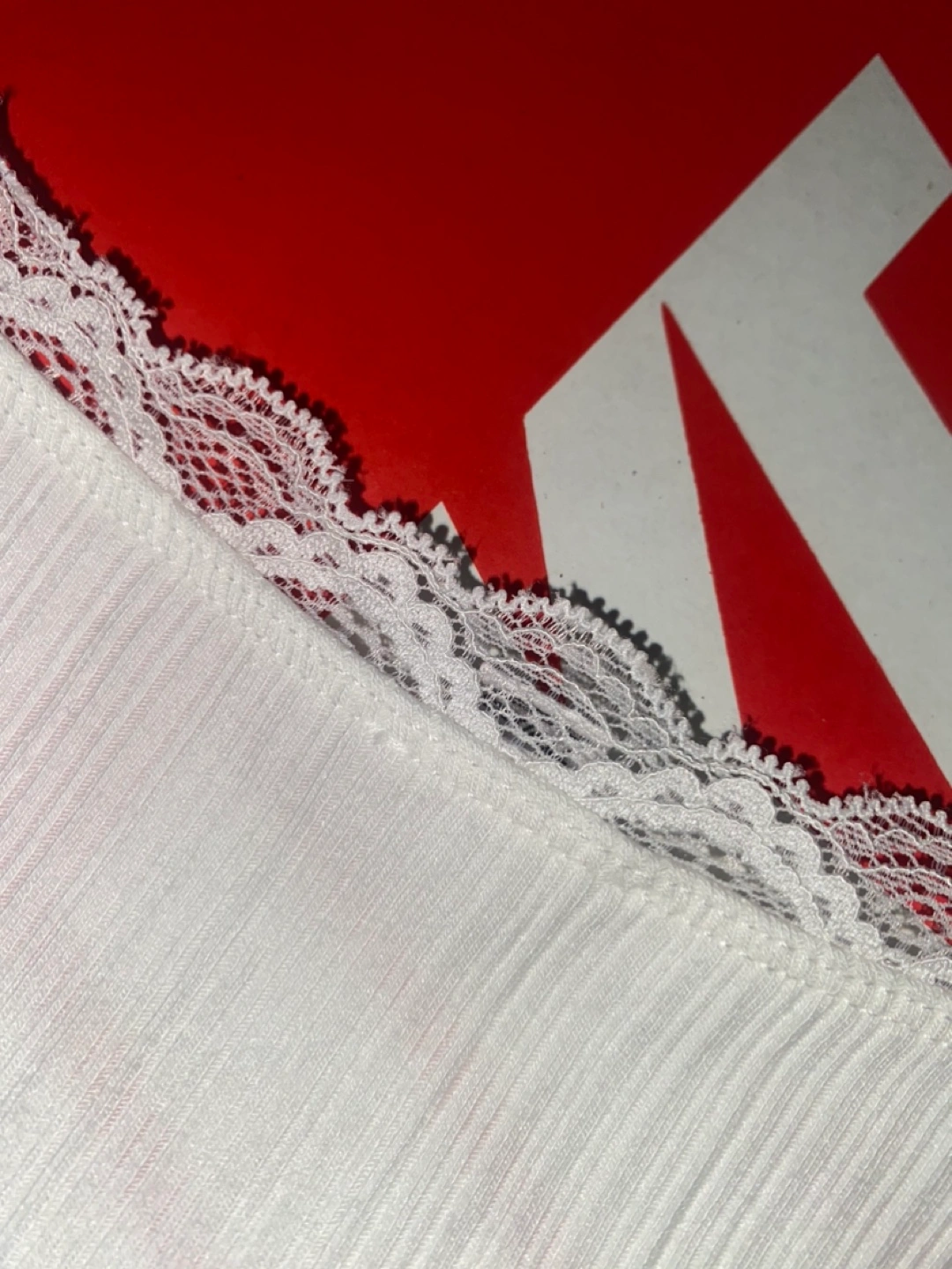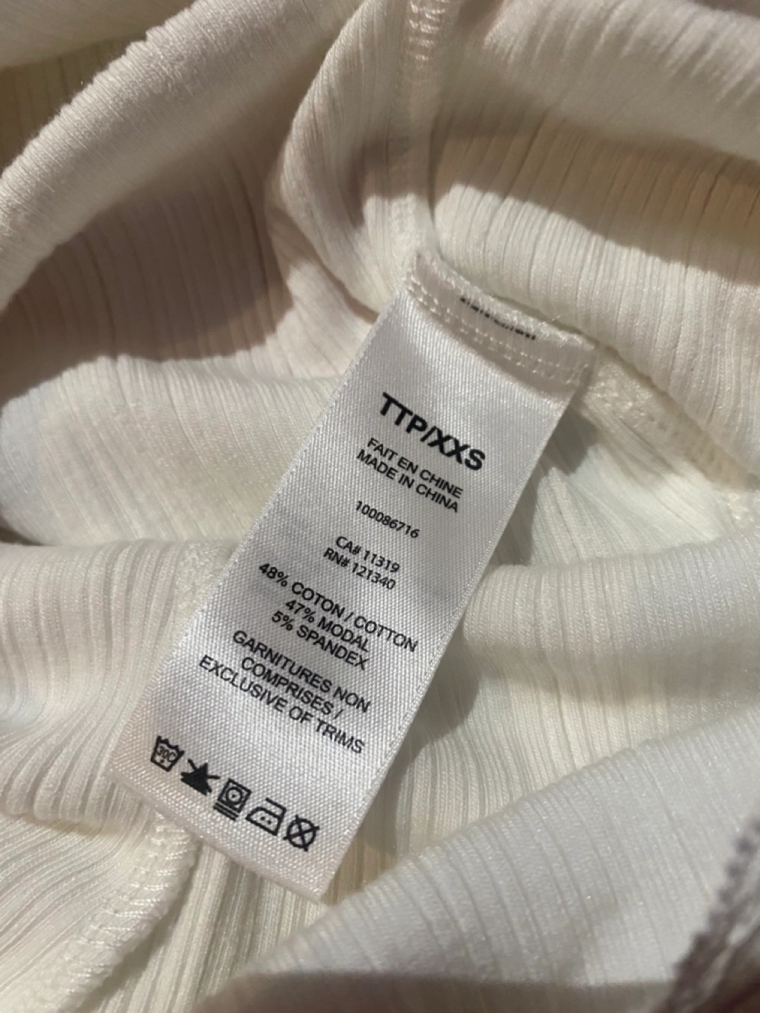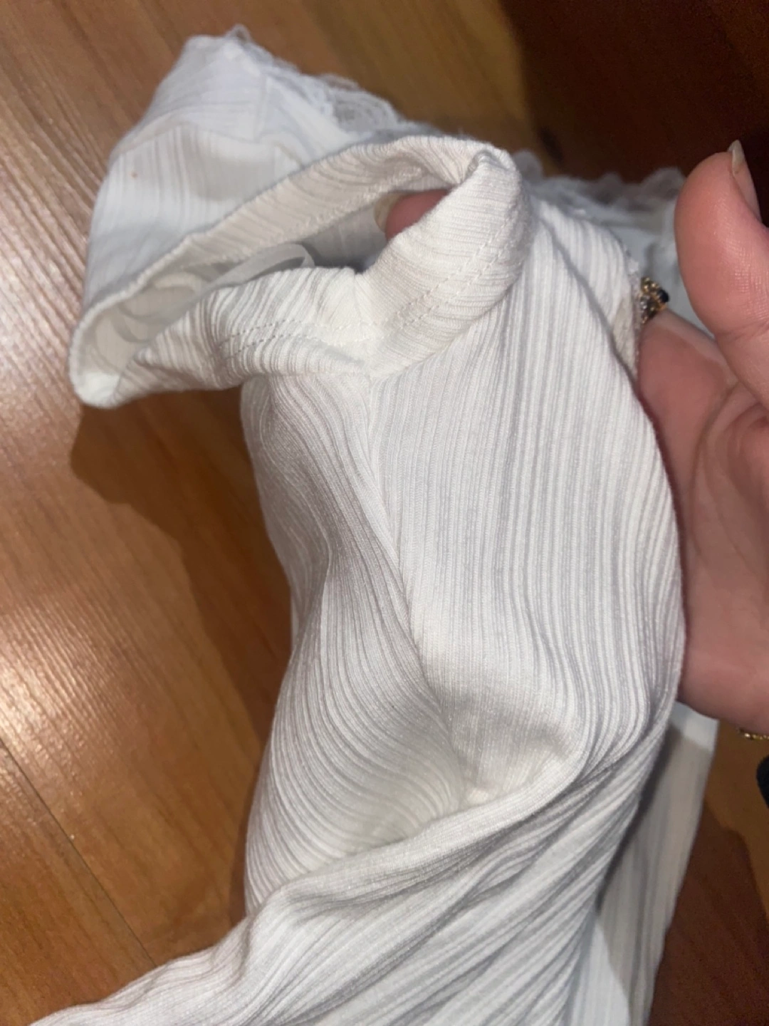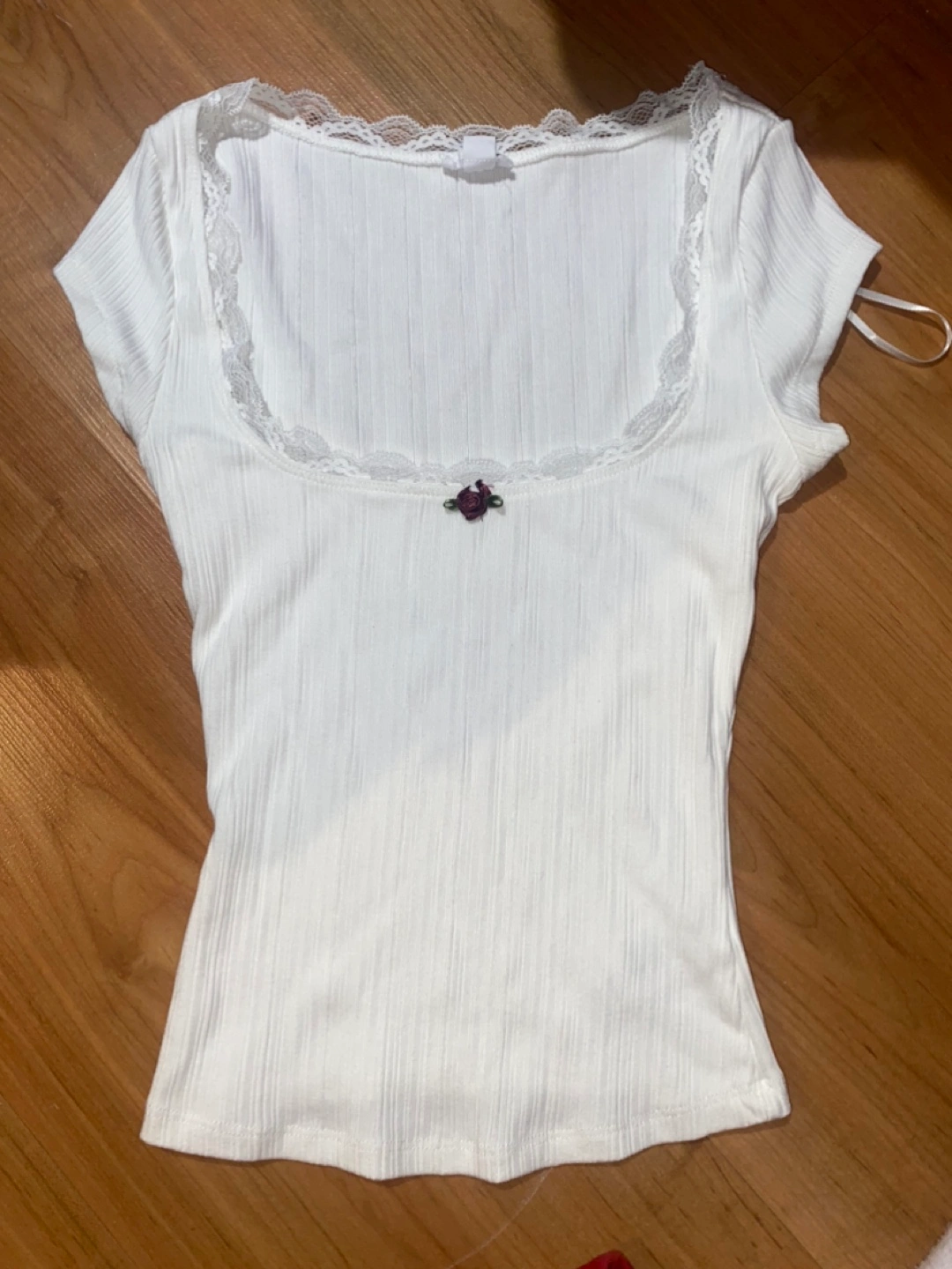 Myla Scoop Neck Lace Trim Rib Tee 48% Cotton 47% Modal 5% Spandex Very Stretchy material. It is a bit slippery on me so I never worn it after purchasing. It is very clean, never worn, colour white. Lighting is bad in my bedroom. No sweat stains or any stains at all. Has a rose in the middle and lace trim. Last photo is Garage Model wearing it. Smoke Free & Pet Free Household. Pick Up Only, No Delivery. Cash Only. Only reach out if interested in purchasing the item. Do not waste my time.