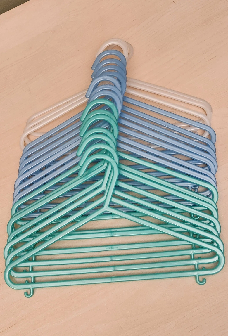 Bundle of pastel coloured plastic hangers. Multiple colours included. Great for closet organization.