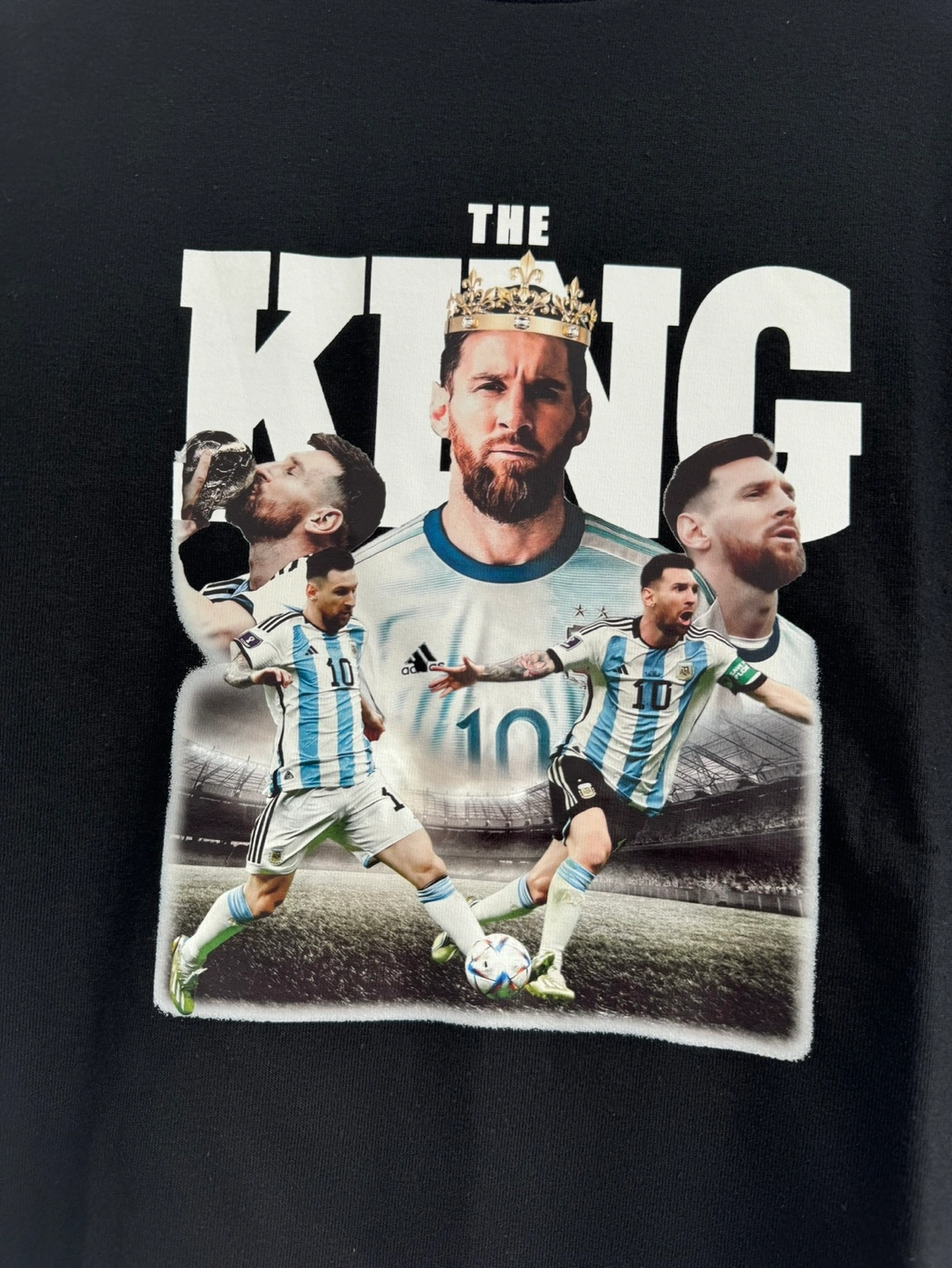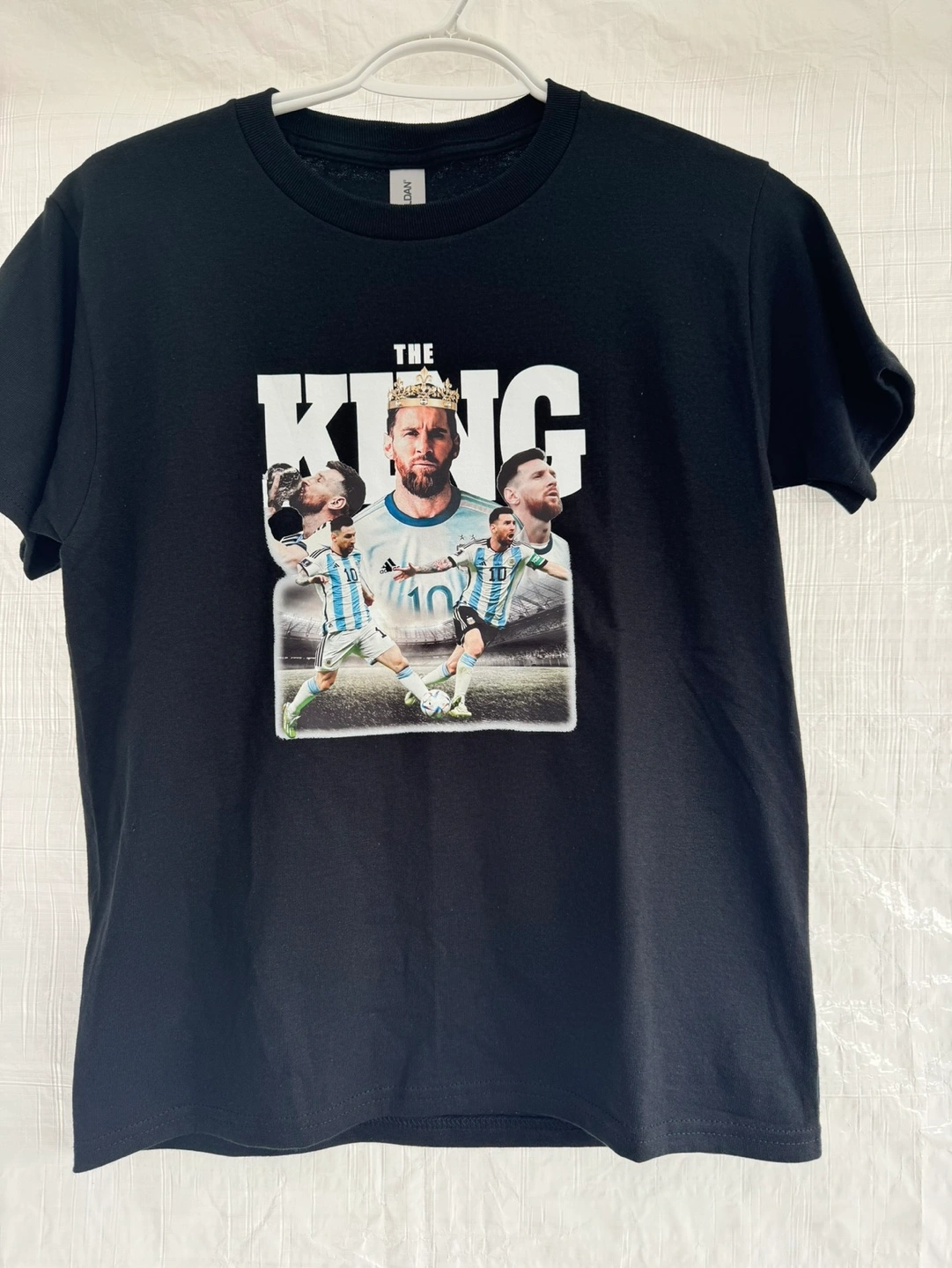 Black t-shirt. Features a graphic design of Lionel Messi, images and text. Sizes kids small to XLArge Adults small to XLArge Pick up in Woodbridge Islington and Rutherford