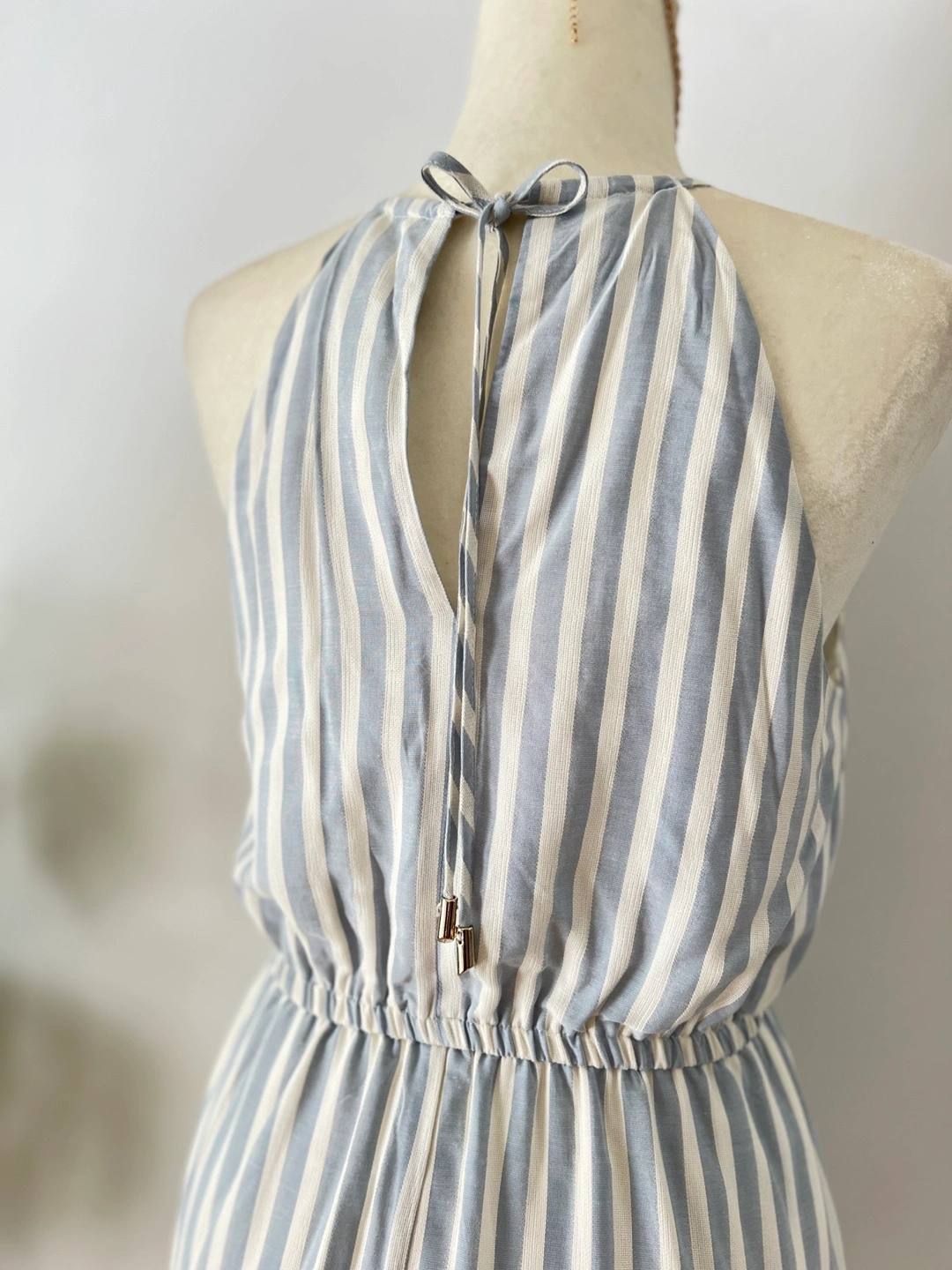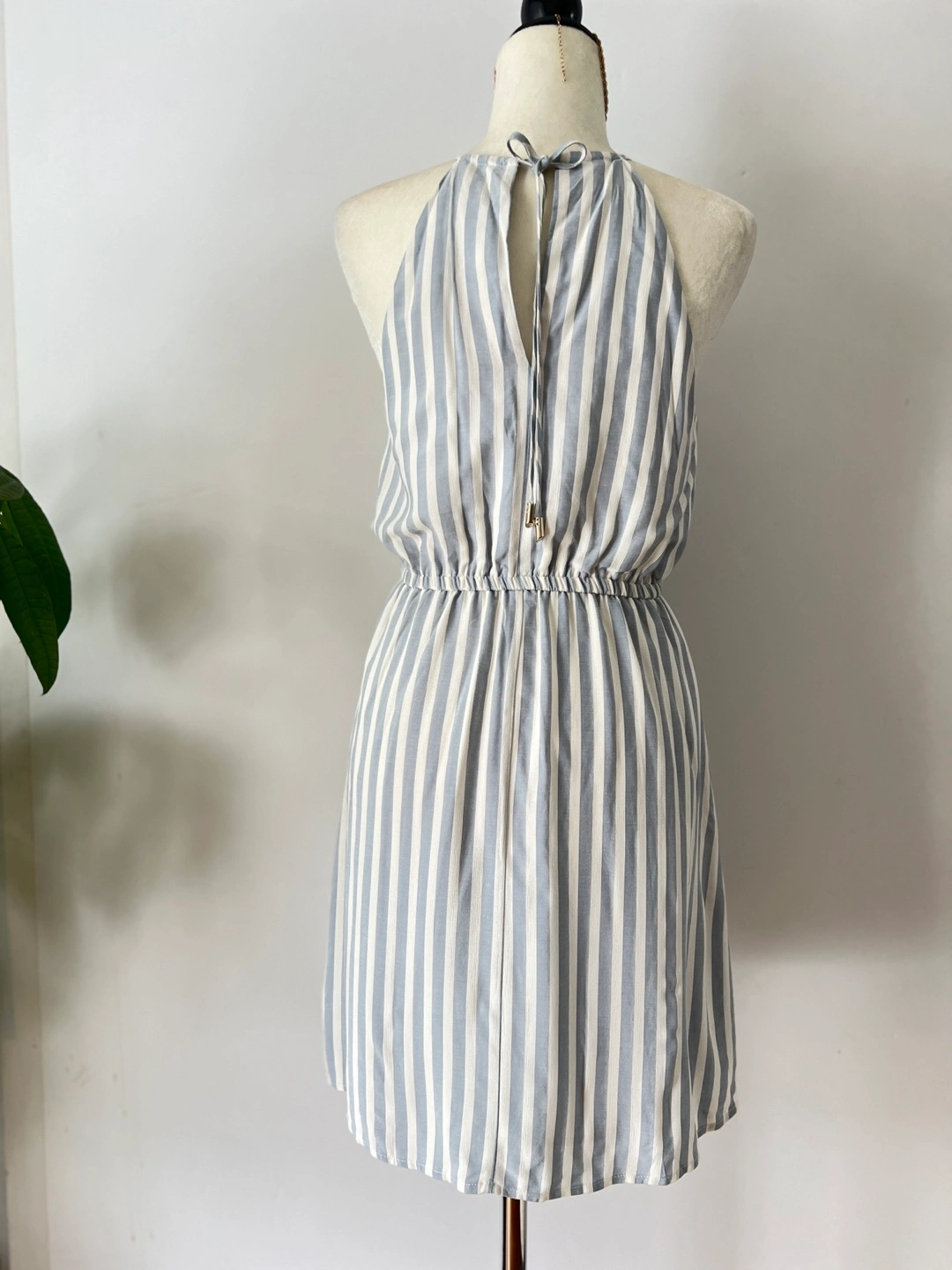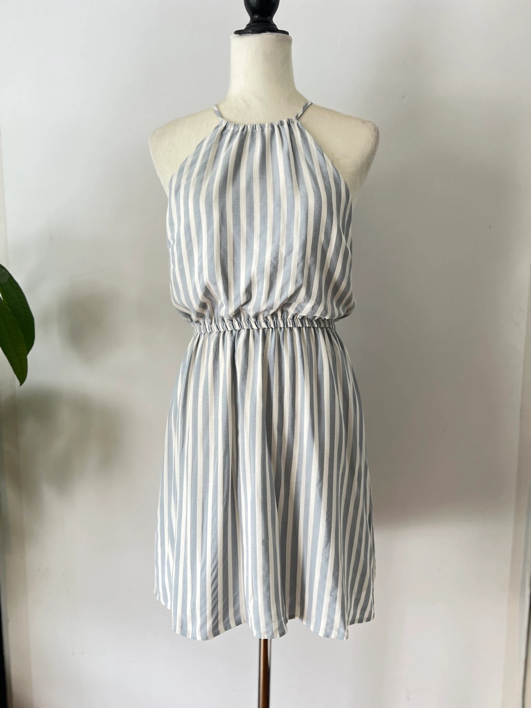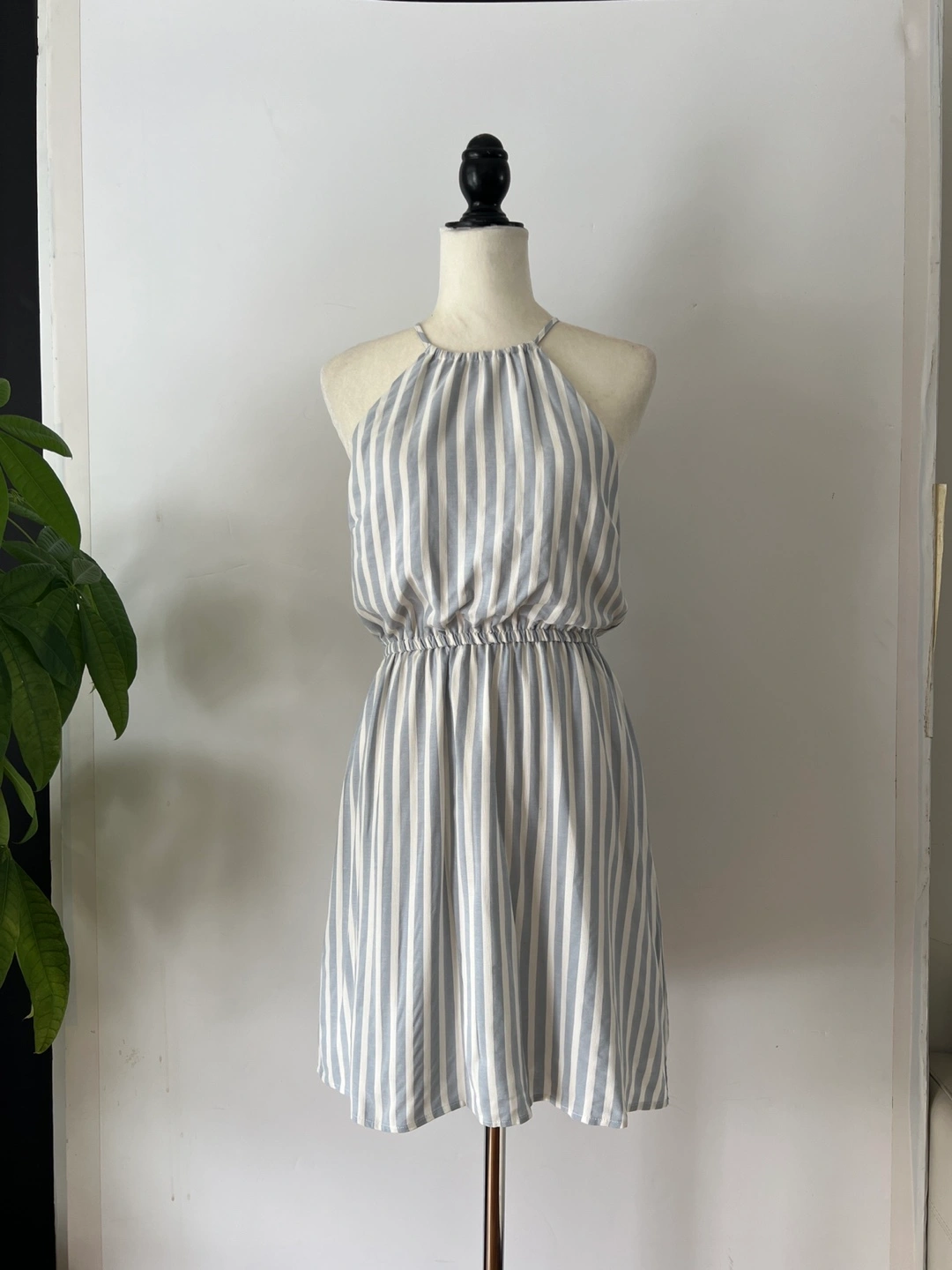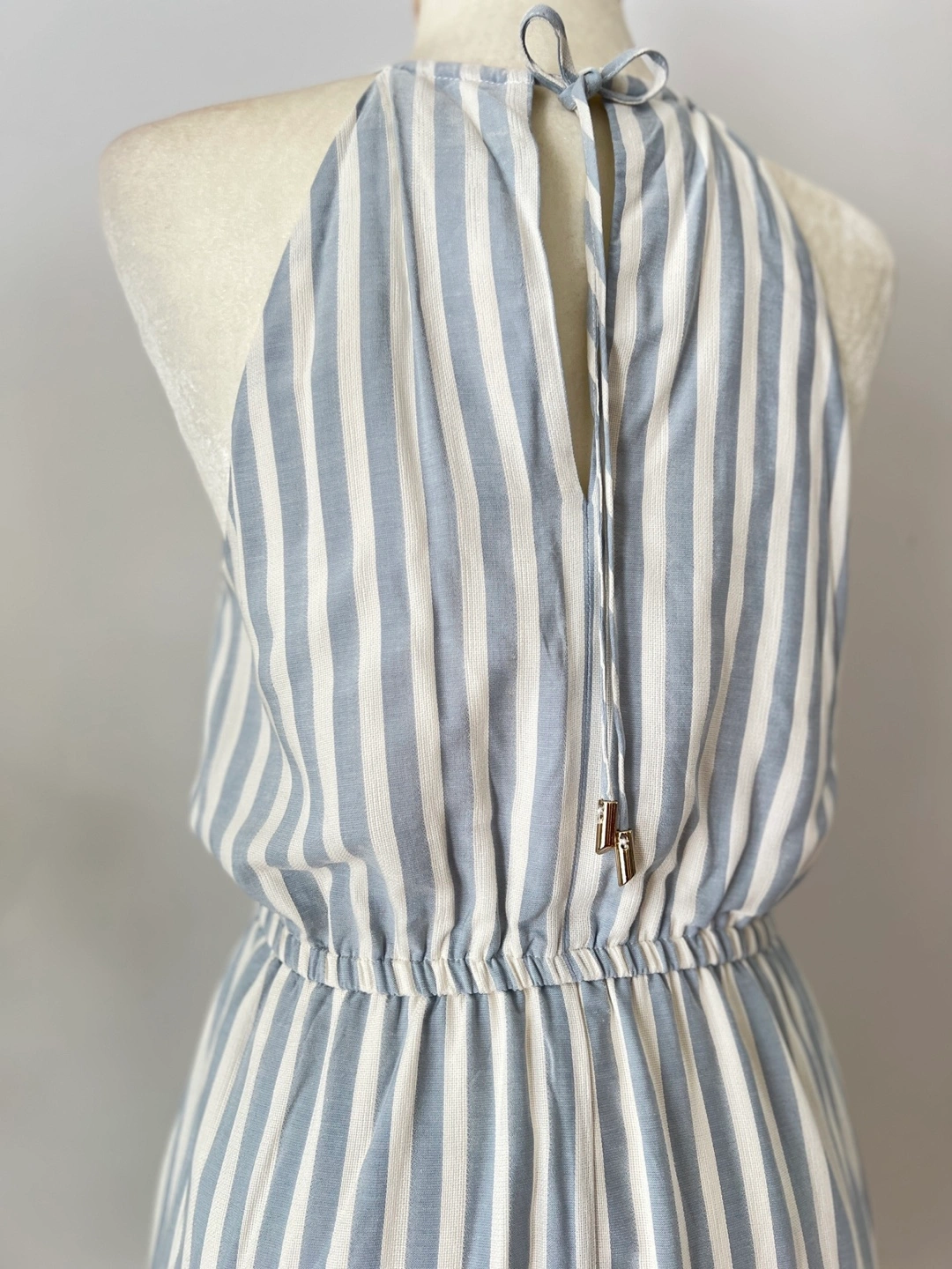 Gorgeous mini dress. Features a halter neck and an elastic waist. Striped pattern in blue and white. Perfect for summer.