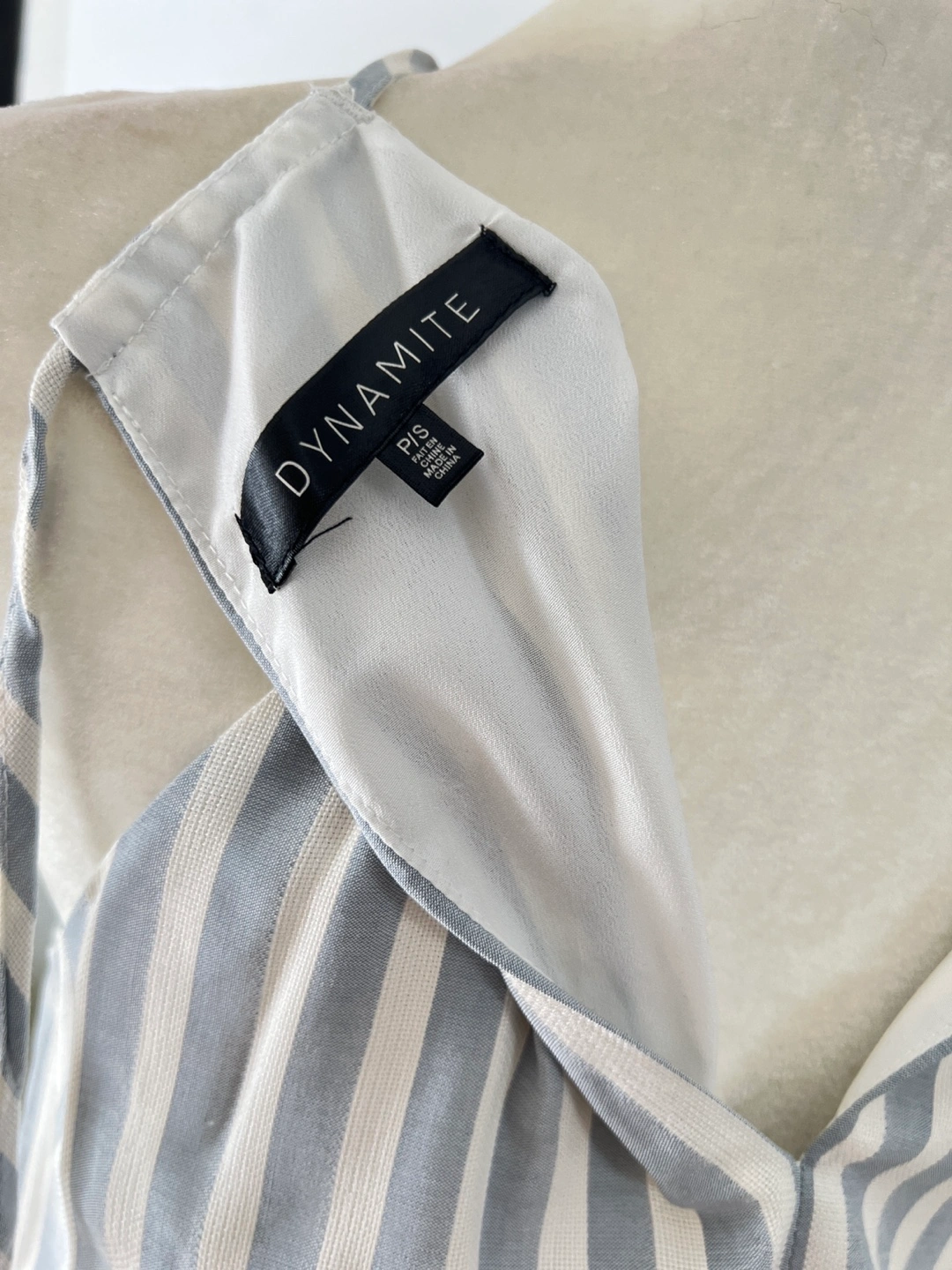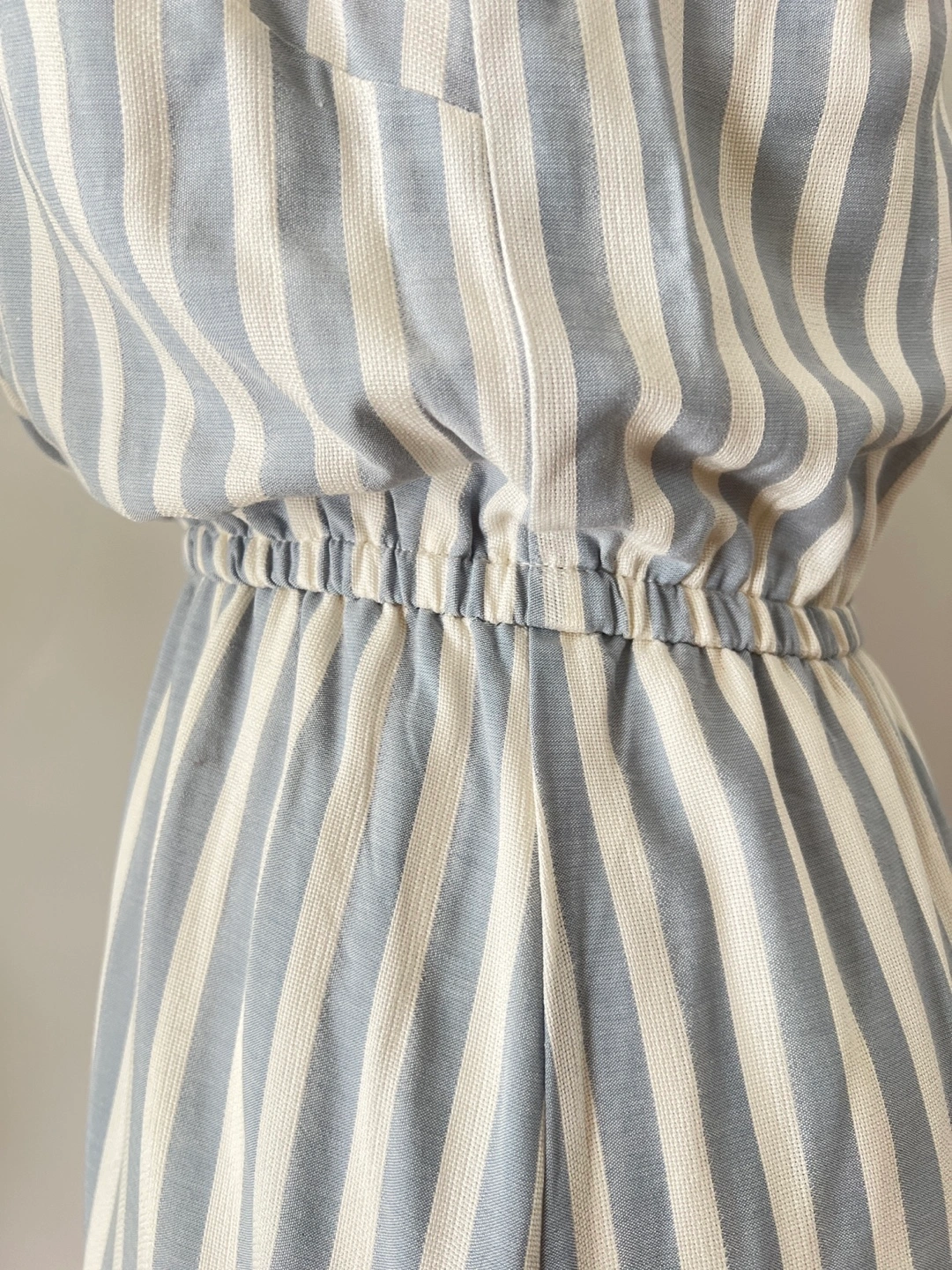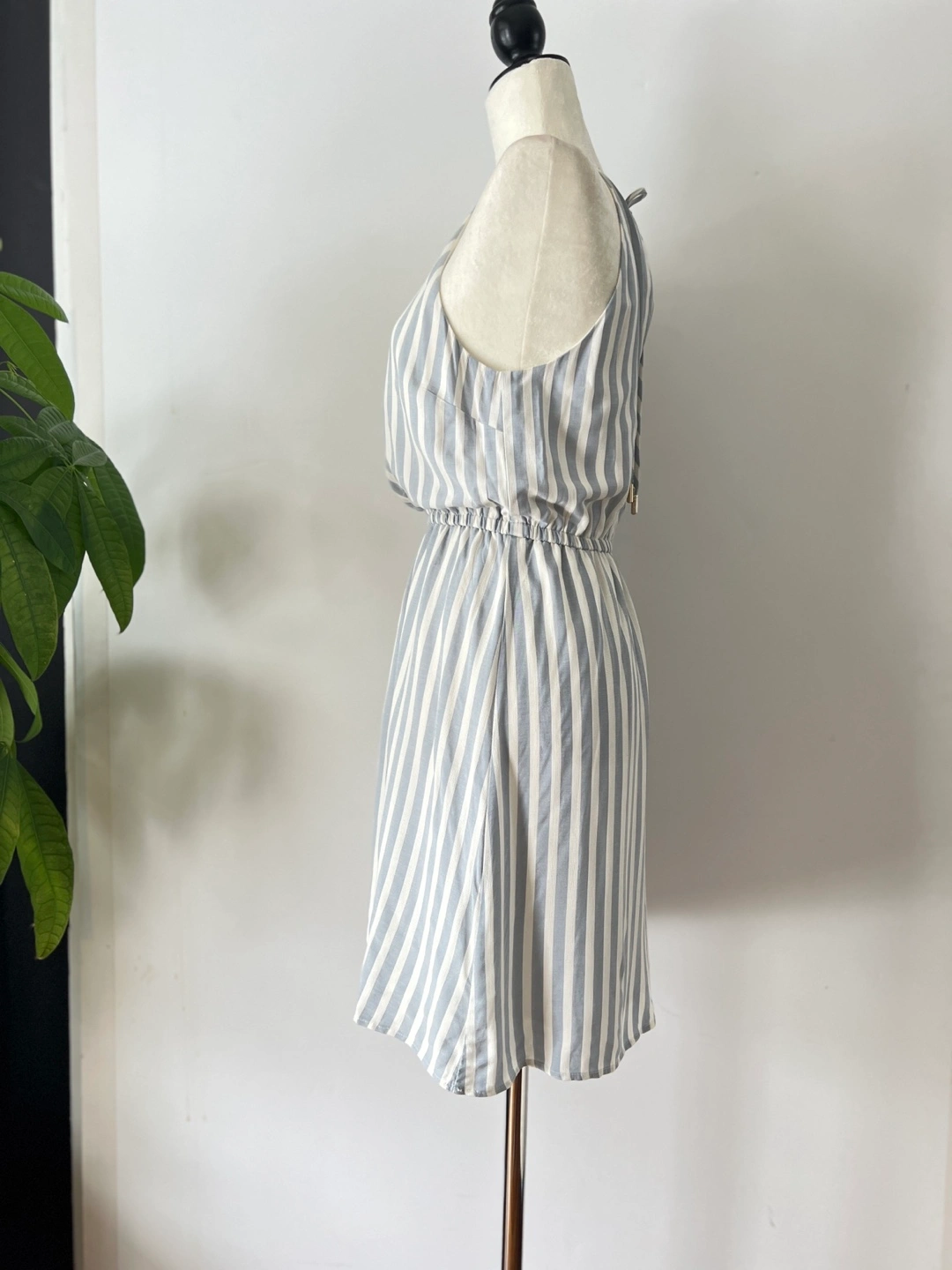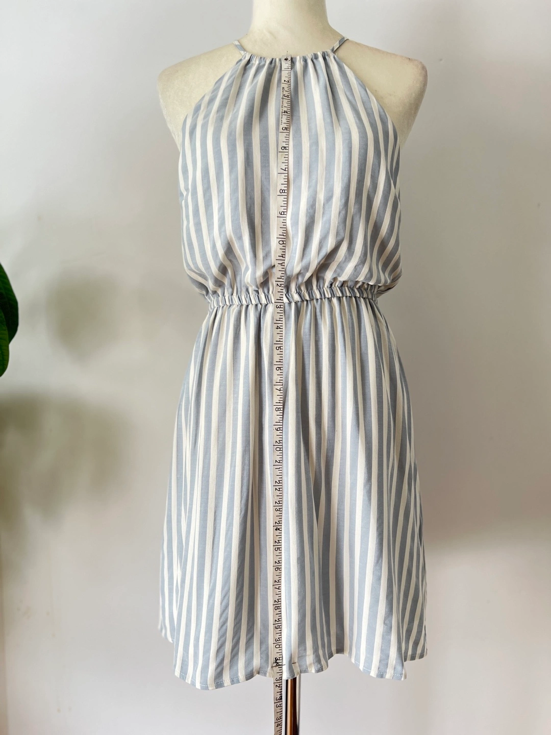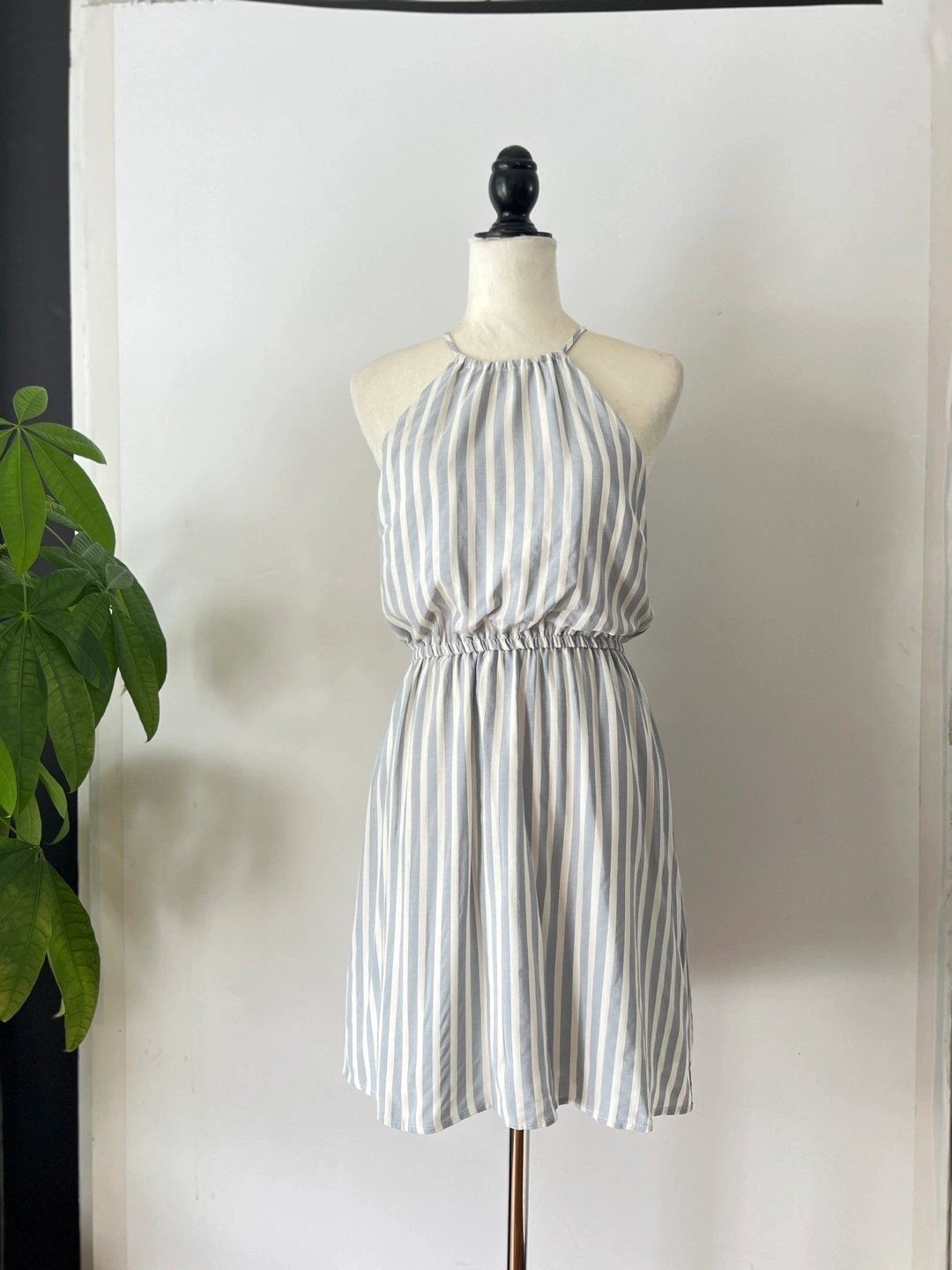 Gorgeous mini dress. Features a halter neck and an elastic waist. Striped pattern in blue and white. Perfect for summer.