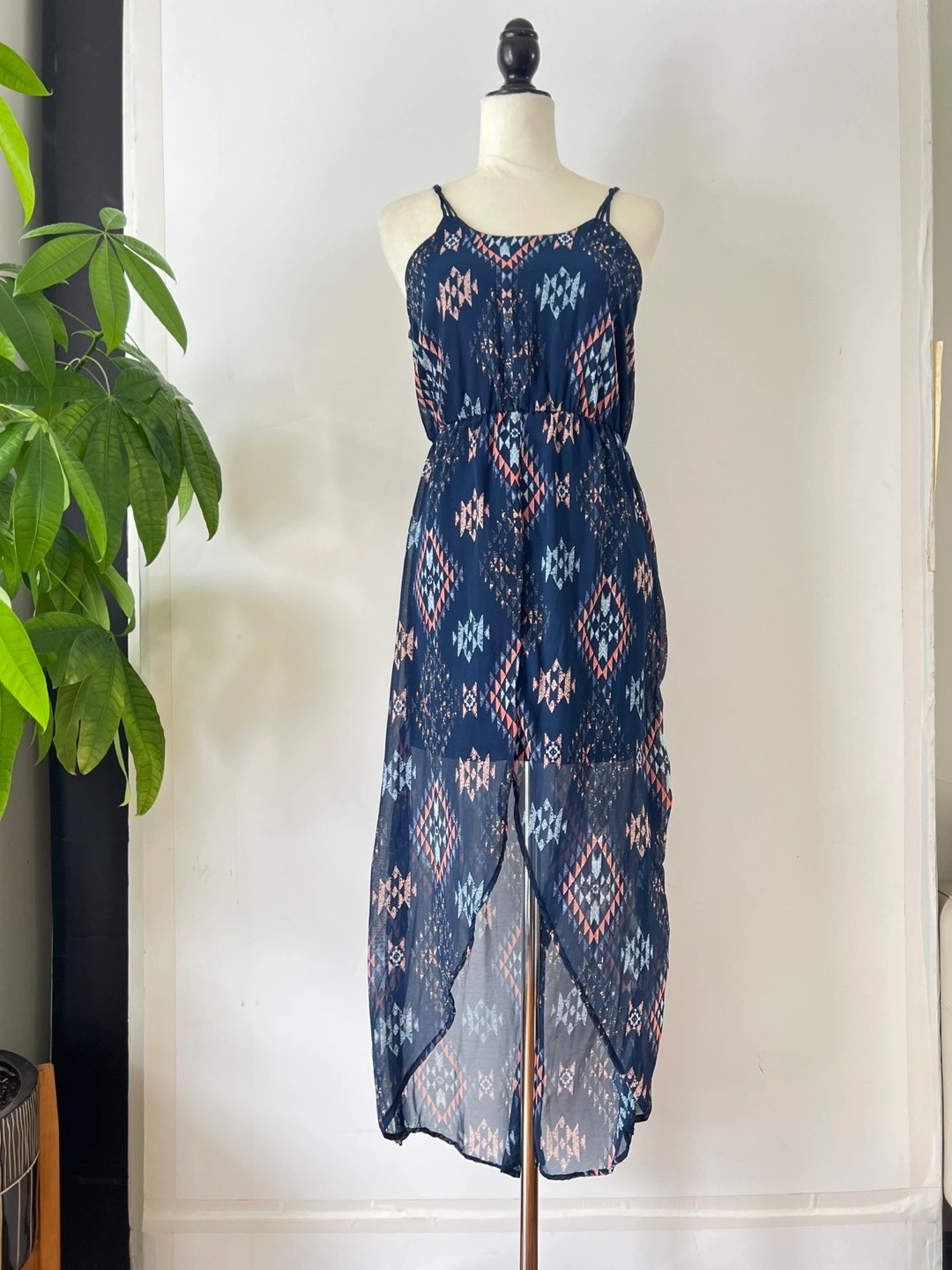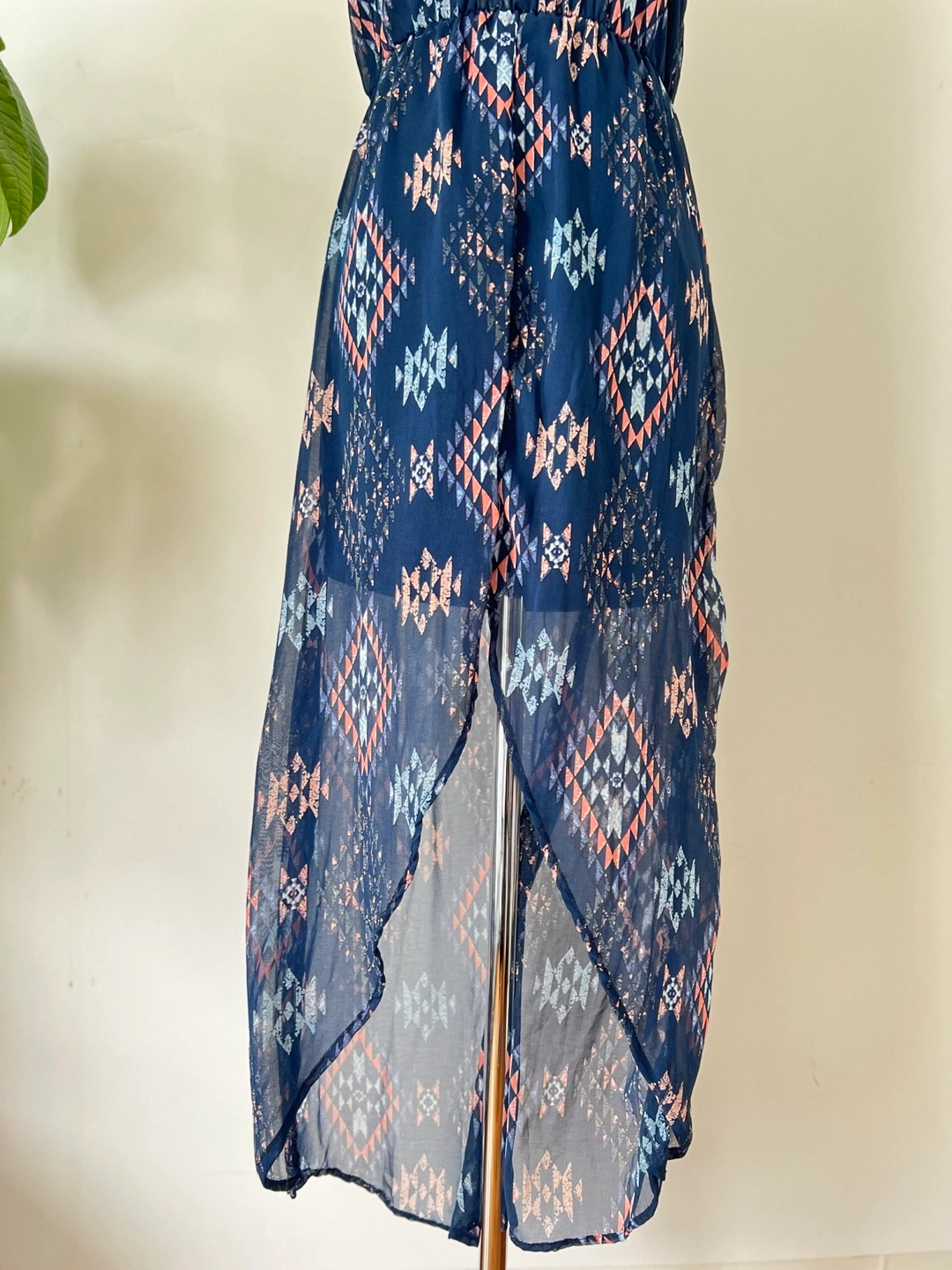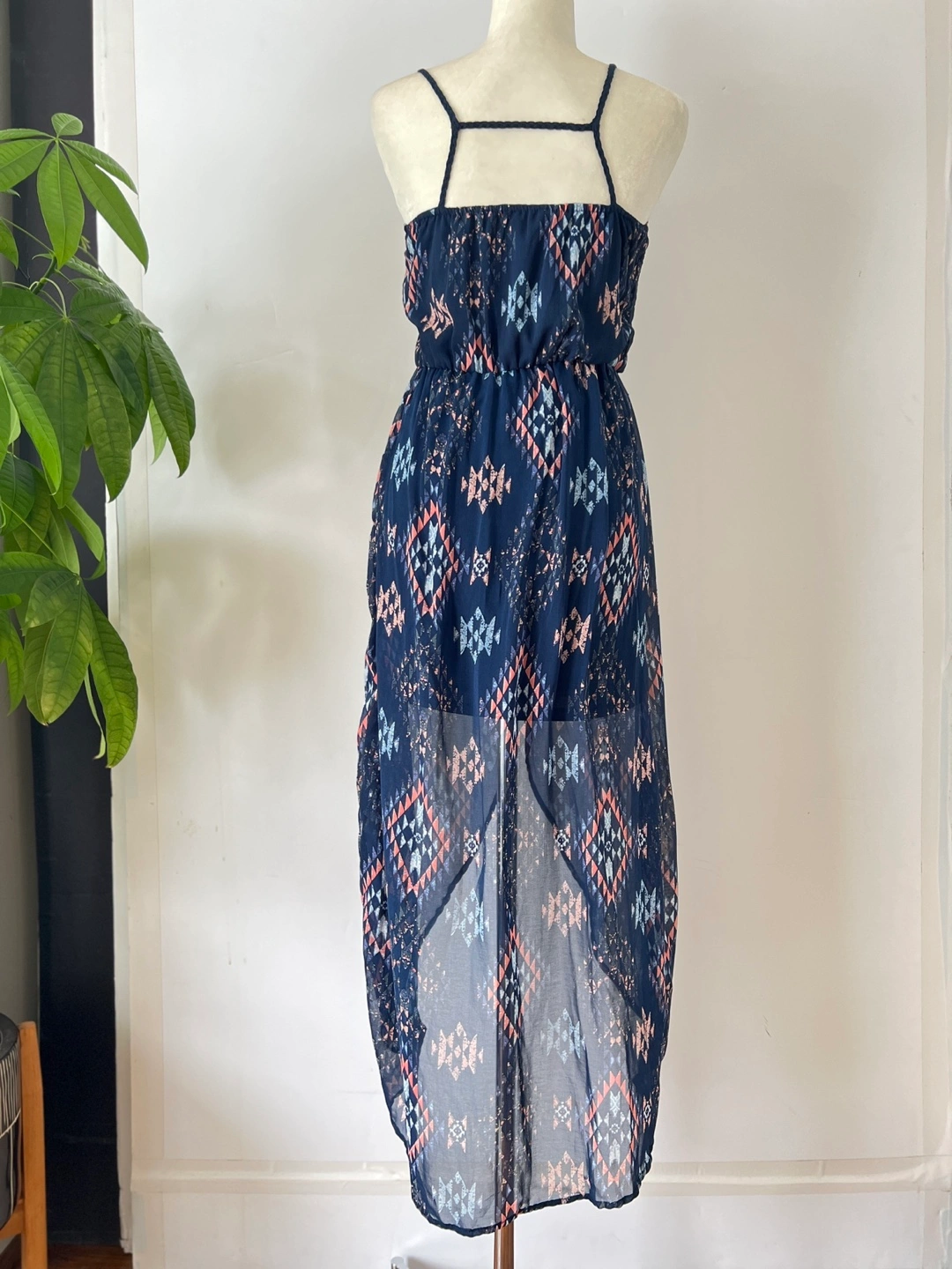 Navy blue sleeveless high-low dress. Features a geometric print and braided straps. Sheer overlay on the bottom.