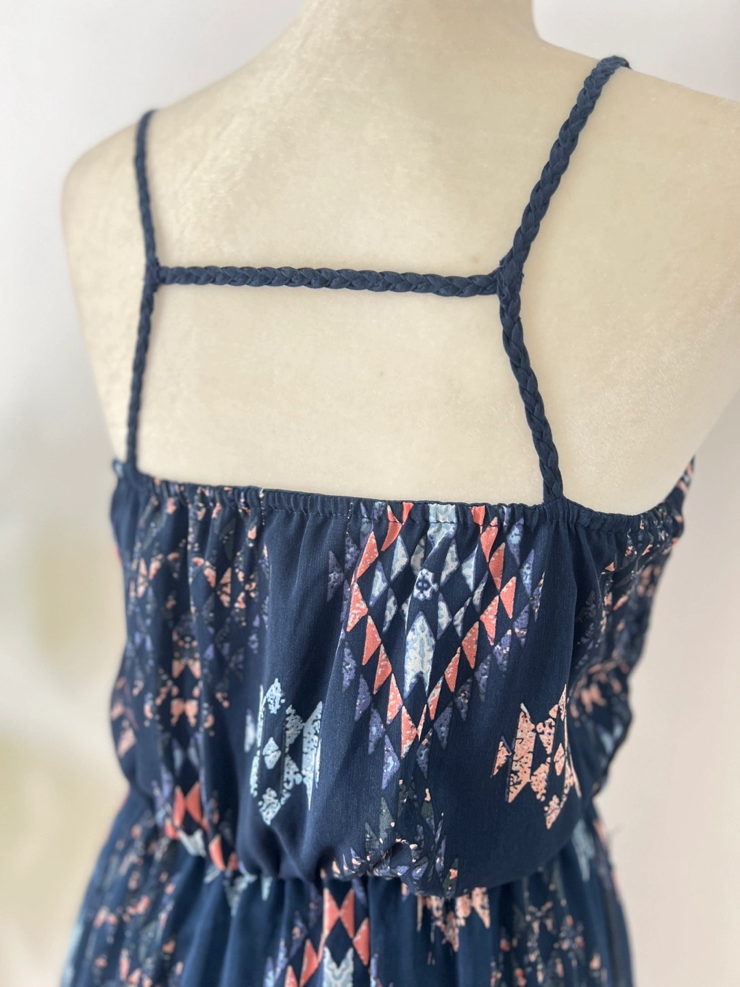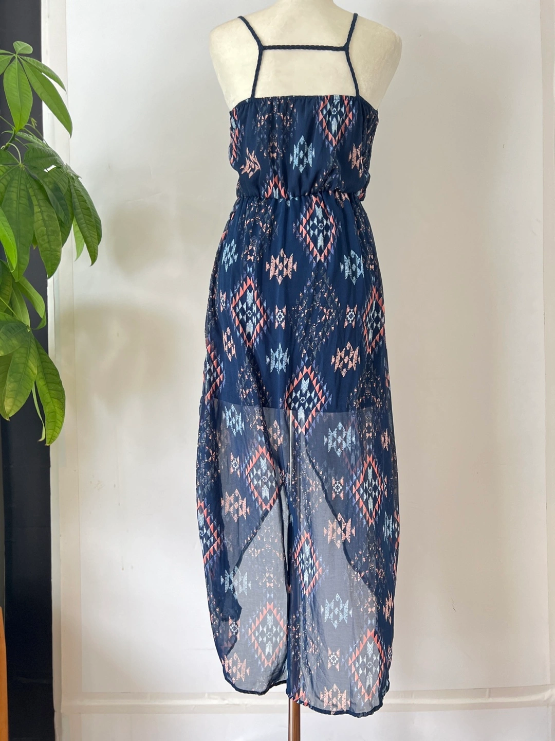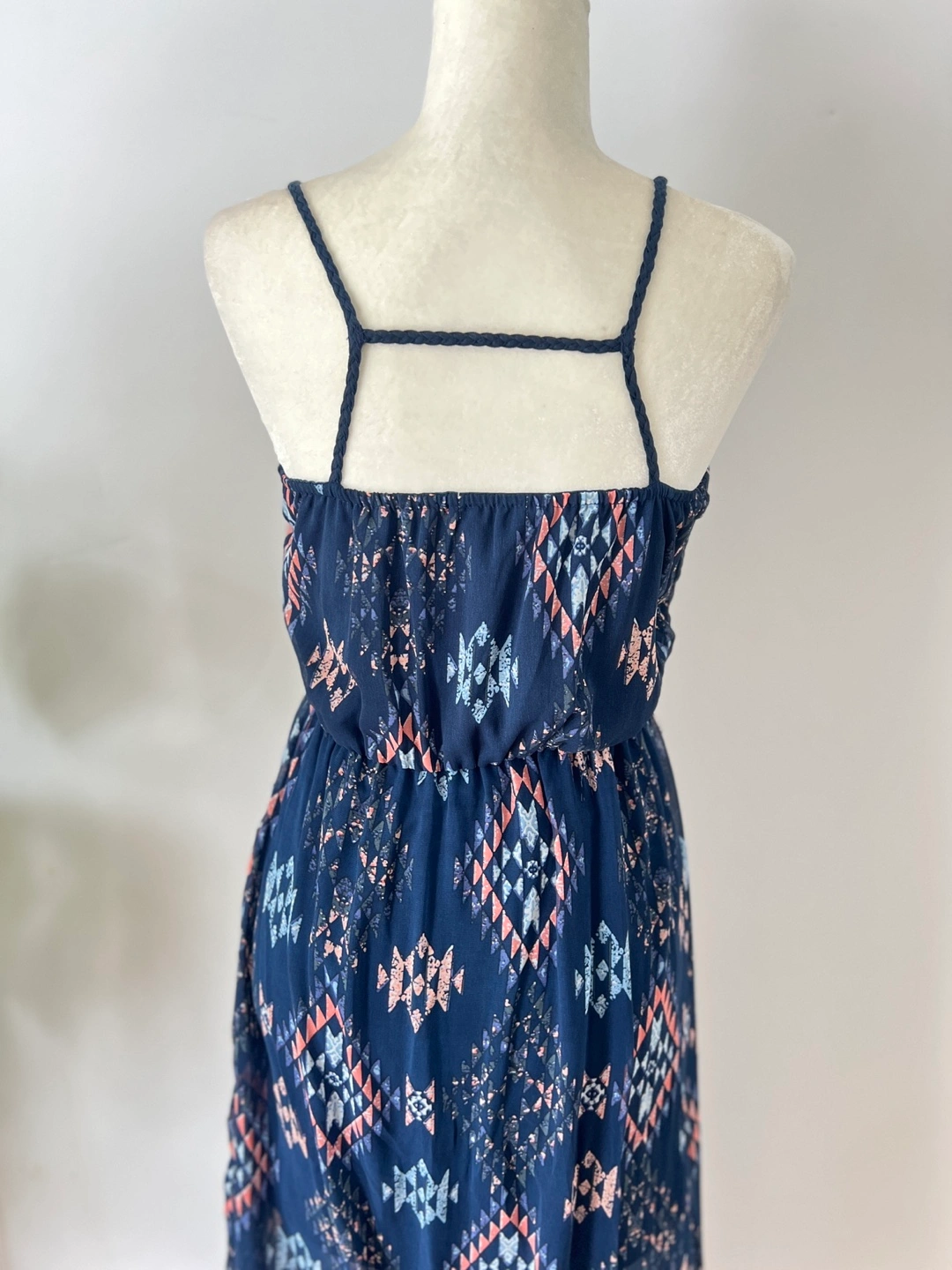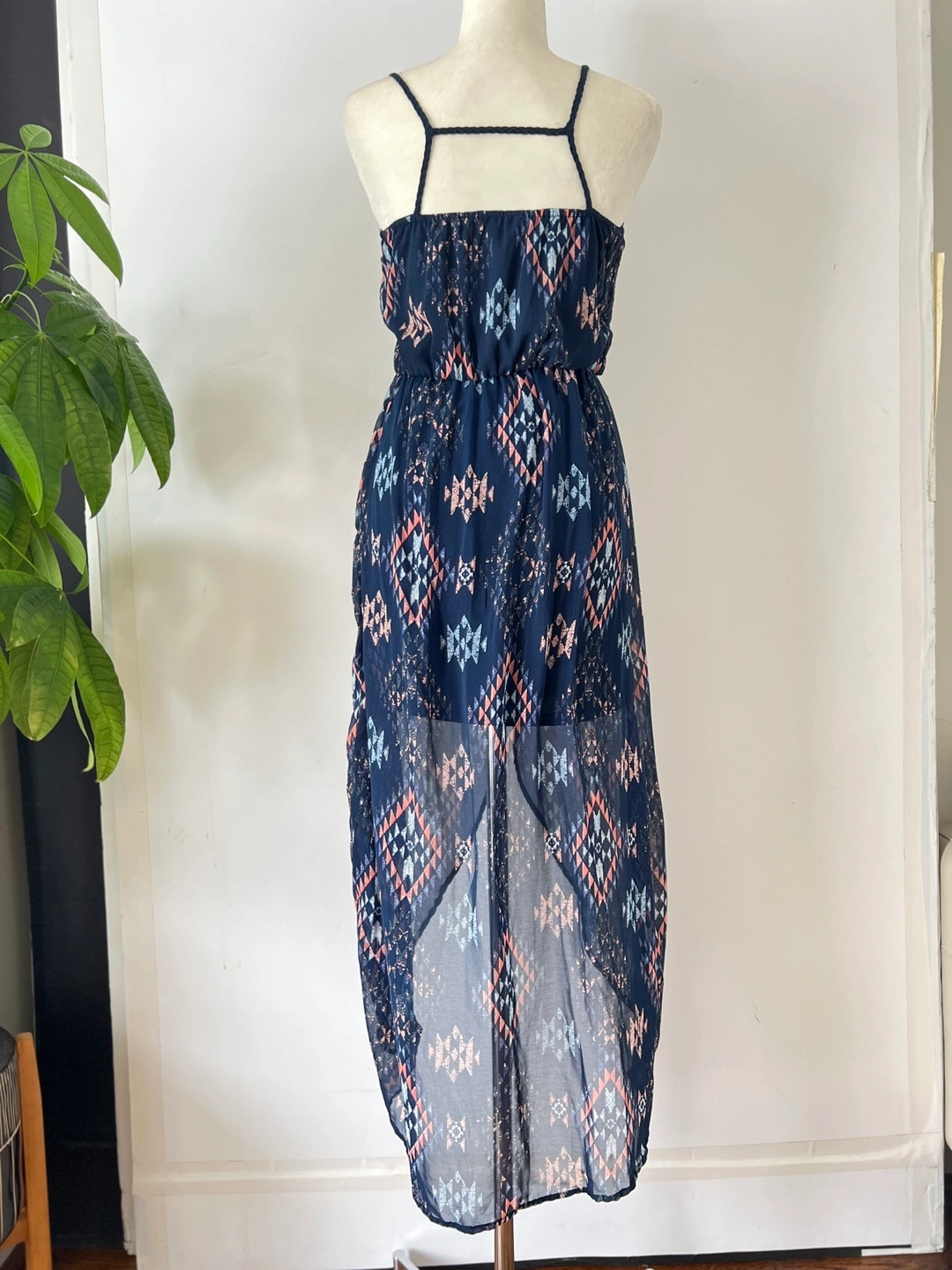 Navy blue sleeveless high-low dress. Features a geometric print and braided straps. Sheer overlay on the bottom.