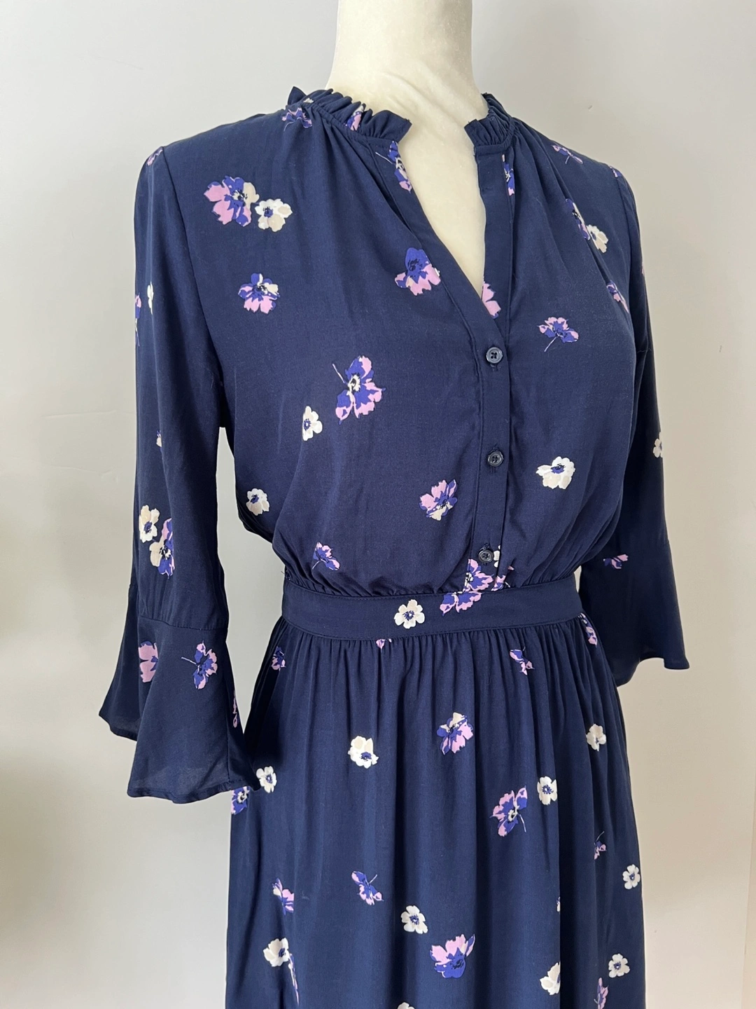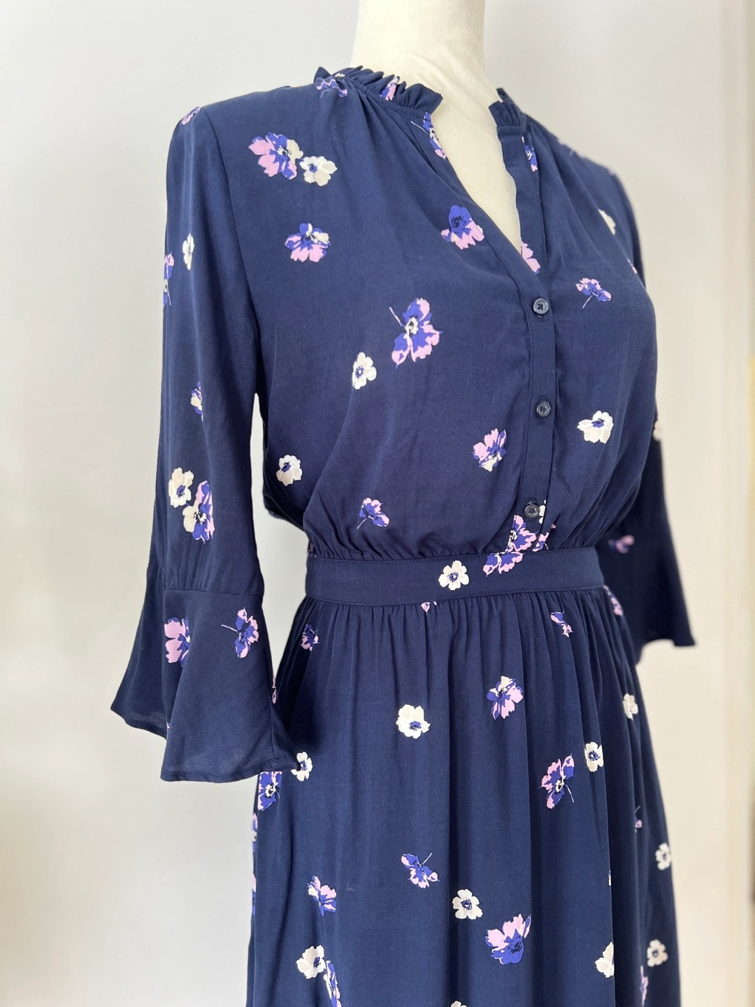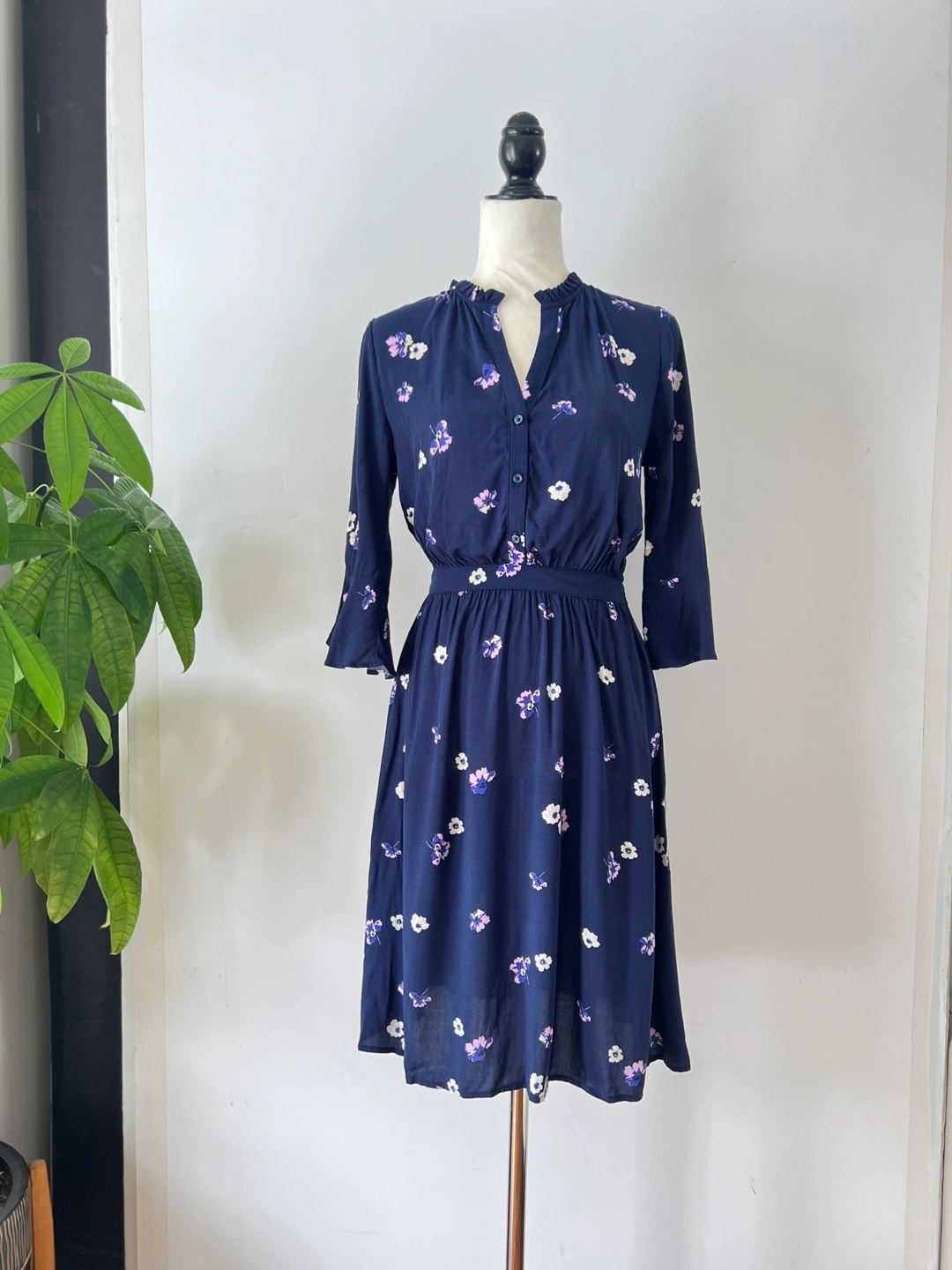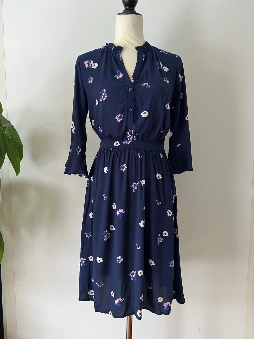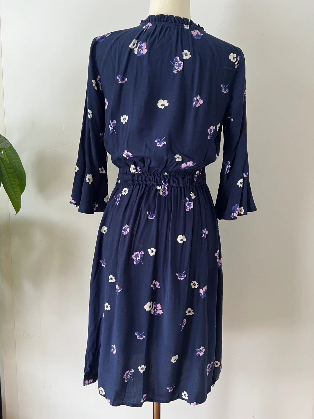 Navy blue mini dress. Features a v-neck, three-quarter tulip sleeves, and an elastic waistband. Small floral print throughout. Button placket.