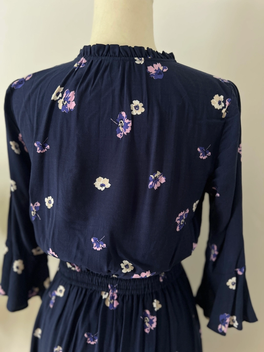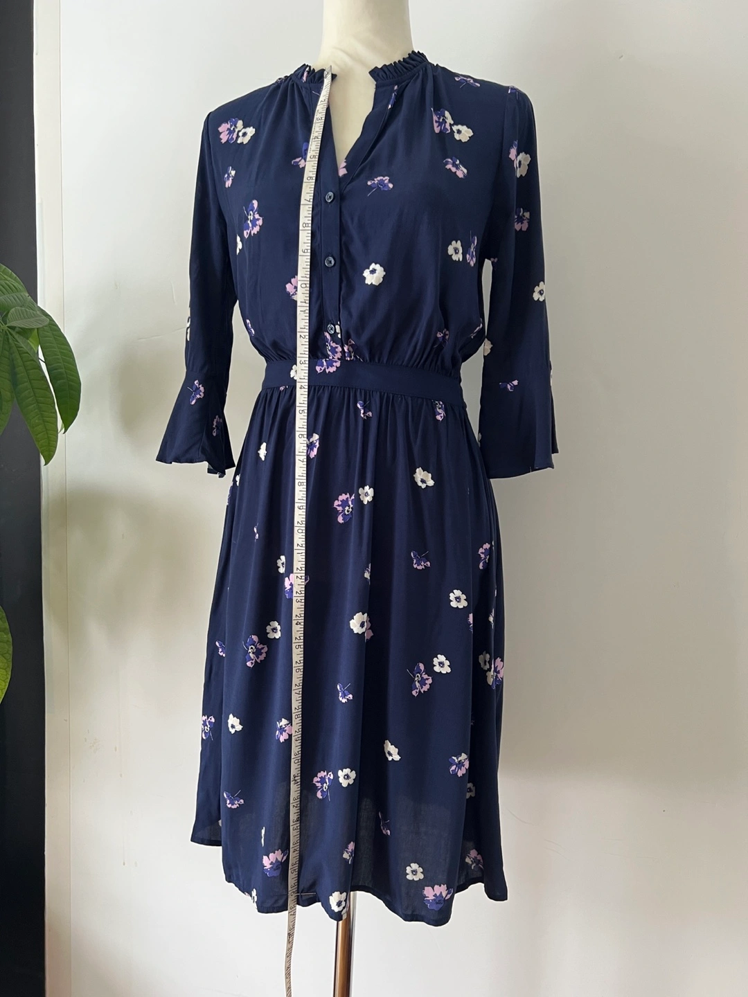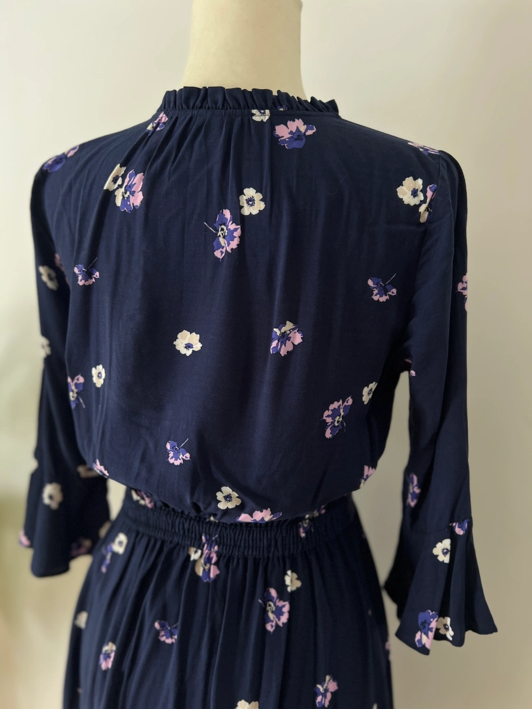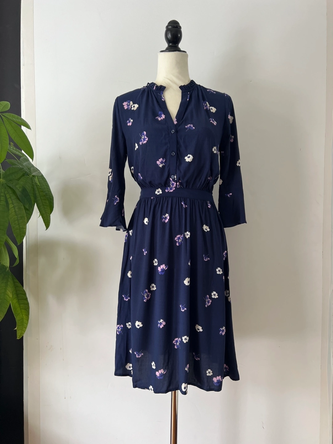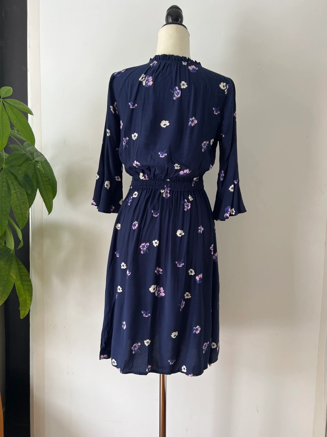 Navy blue mini dress. Features a v-neck, three-quarter tulip sleeves, and an elastic waistband. Small floral print throughout. Button placket.