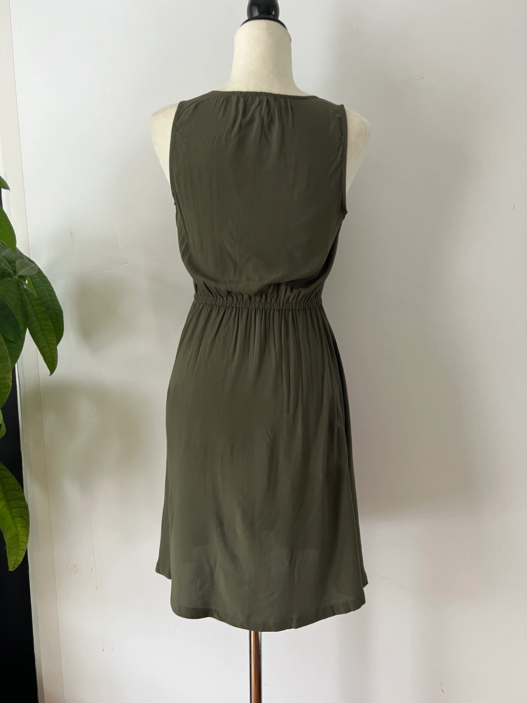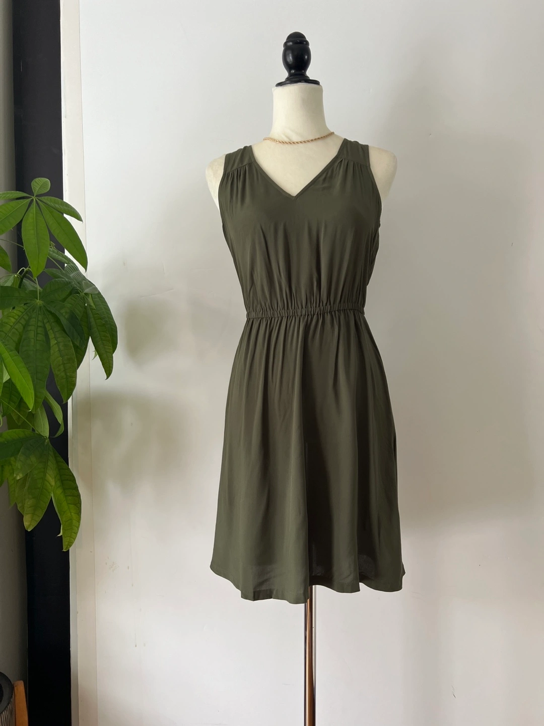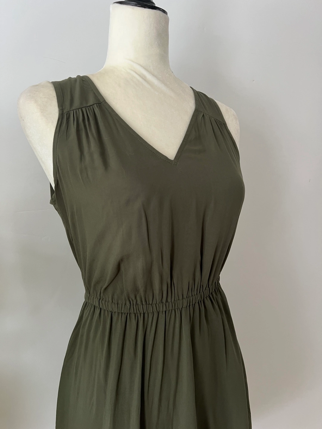 Simple olive green summer dress. V-neckline. Elastic waist. Relaxed fit. Lightweight material. Perfect for warm weather.