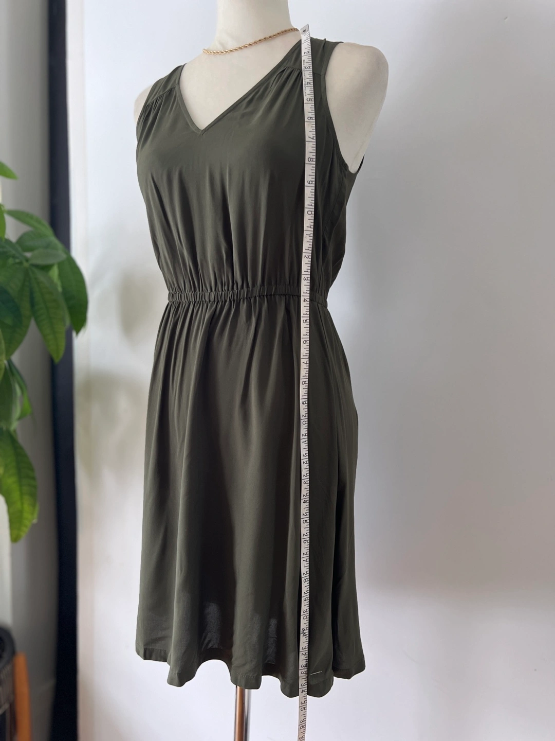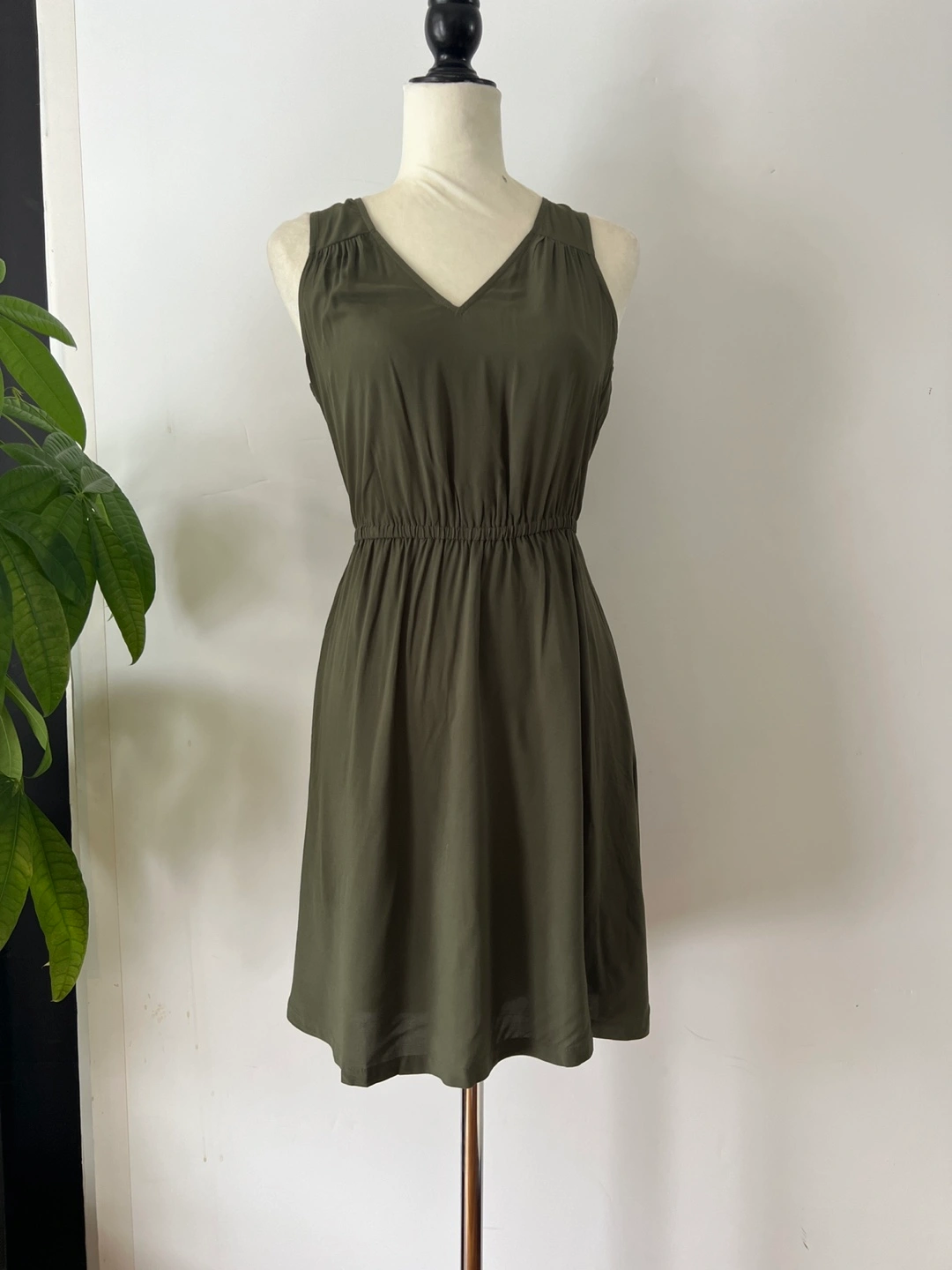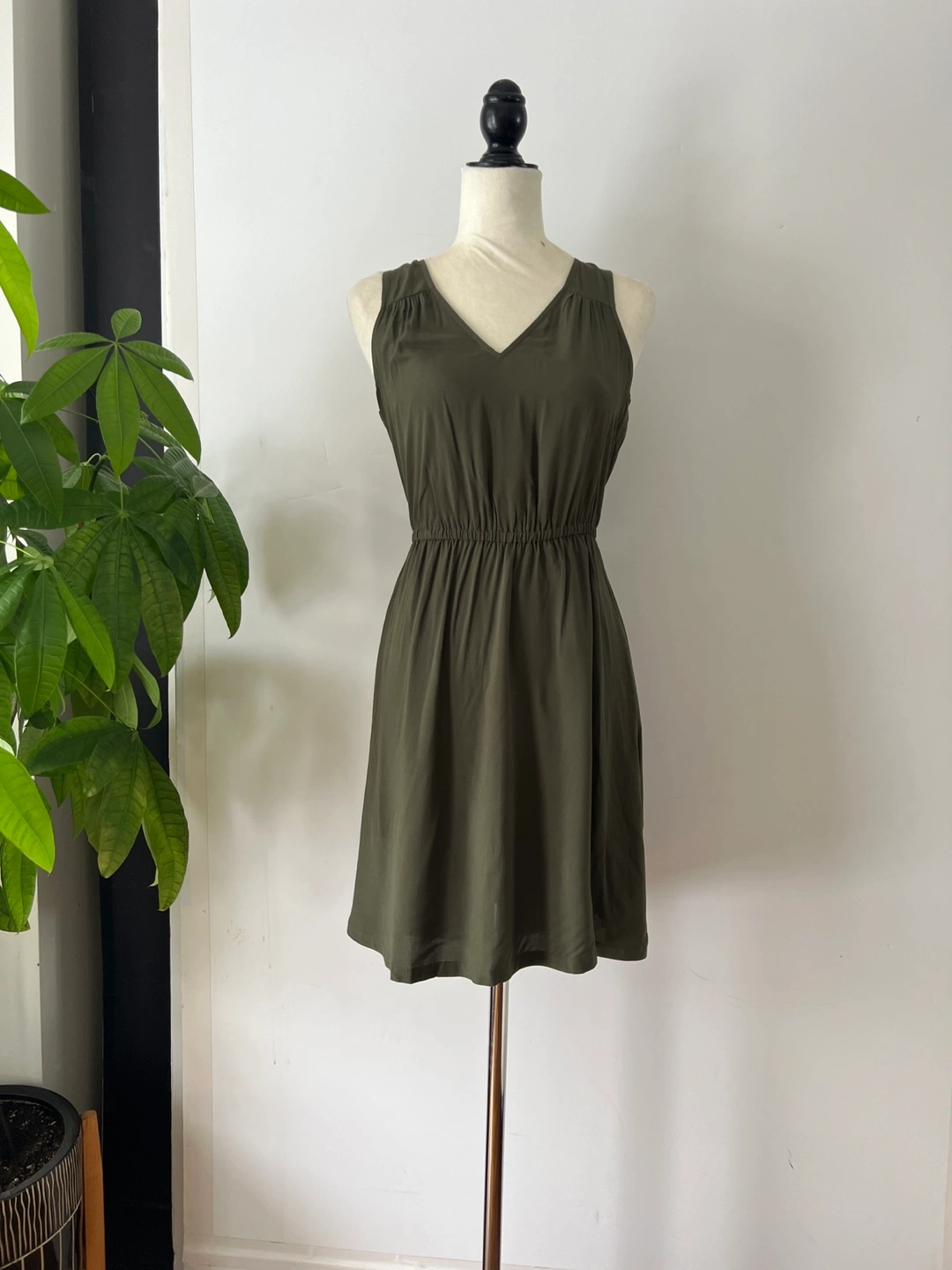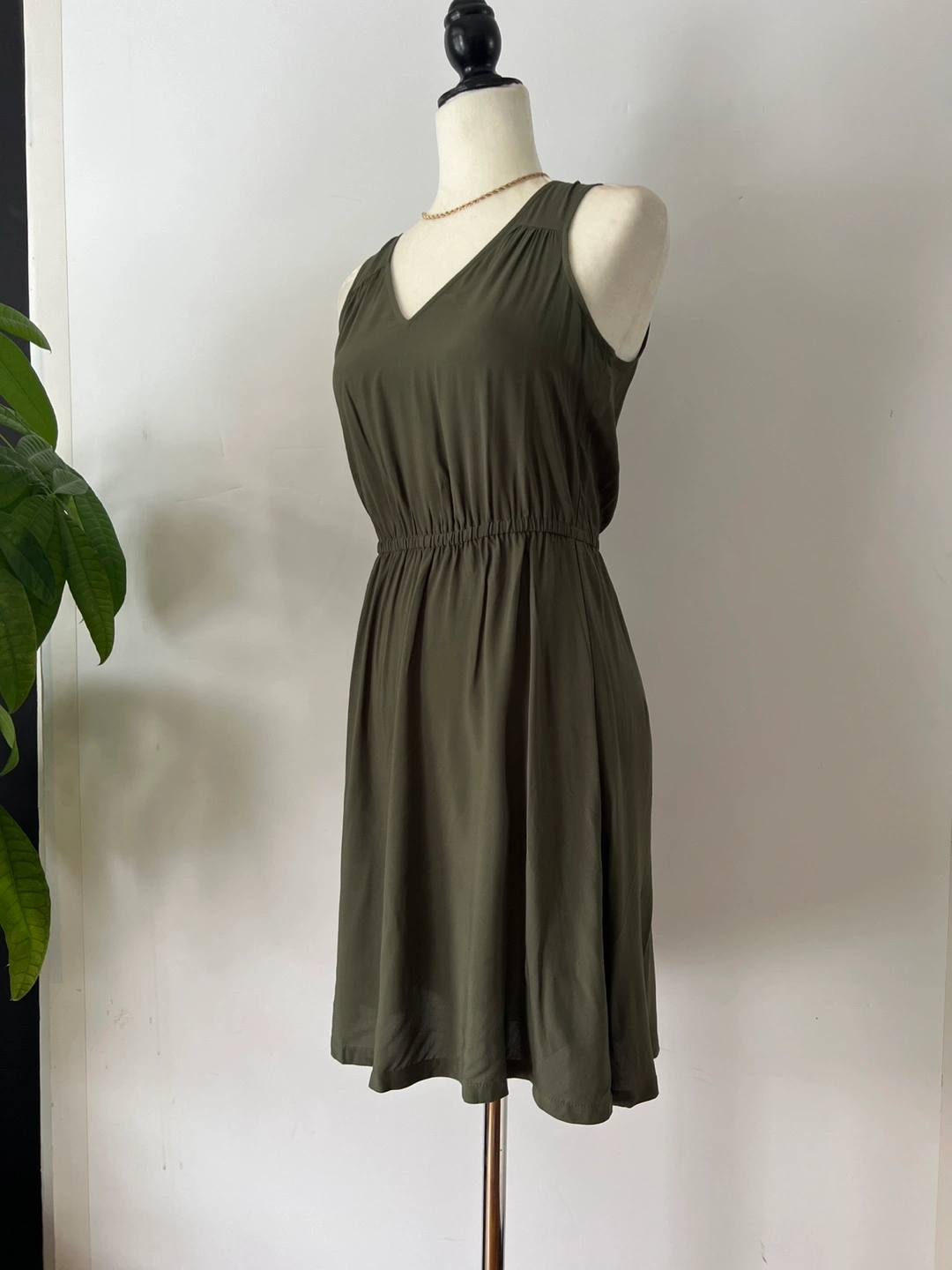 Simple olive green summer dress. V-neckline. Elastic waist. Relaxed fit. Lightweight material. Perfect for warm weather.