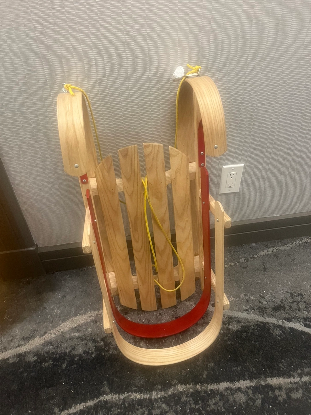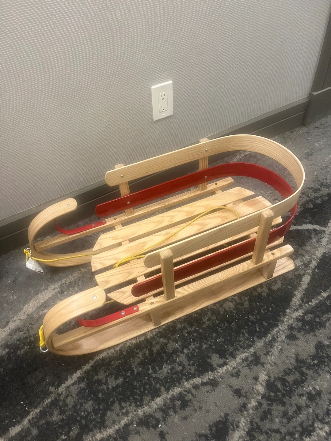 Classic wooden sled, great for kids. Features a curved design and red accents. Durable construction. Ready for snowy adventures!