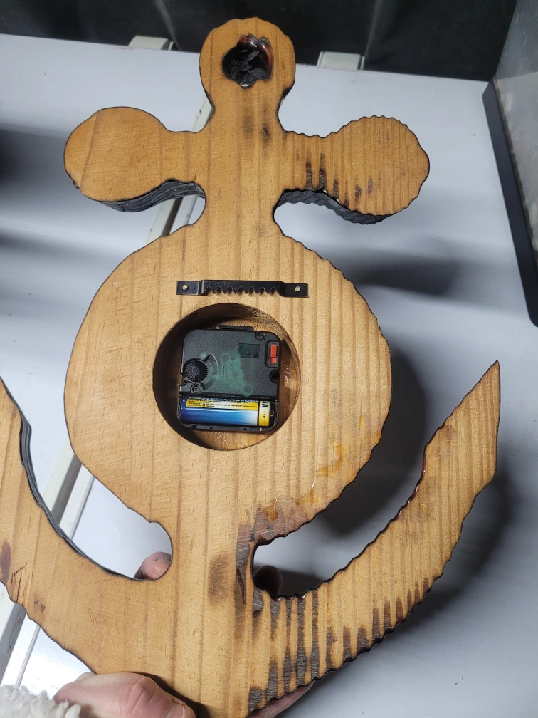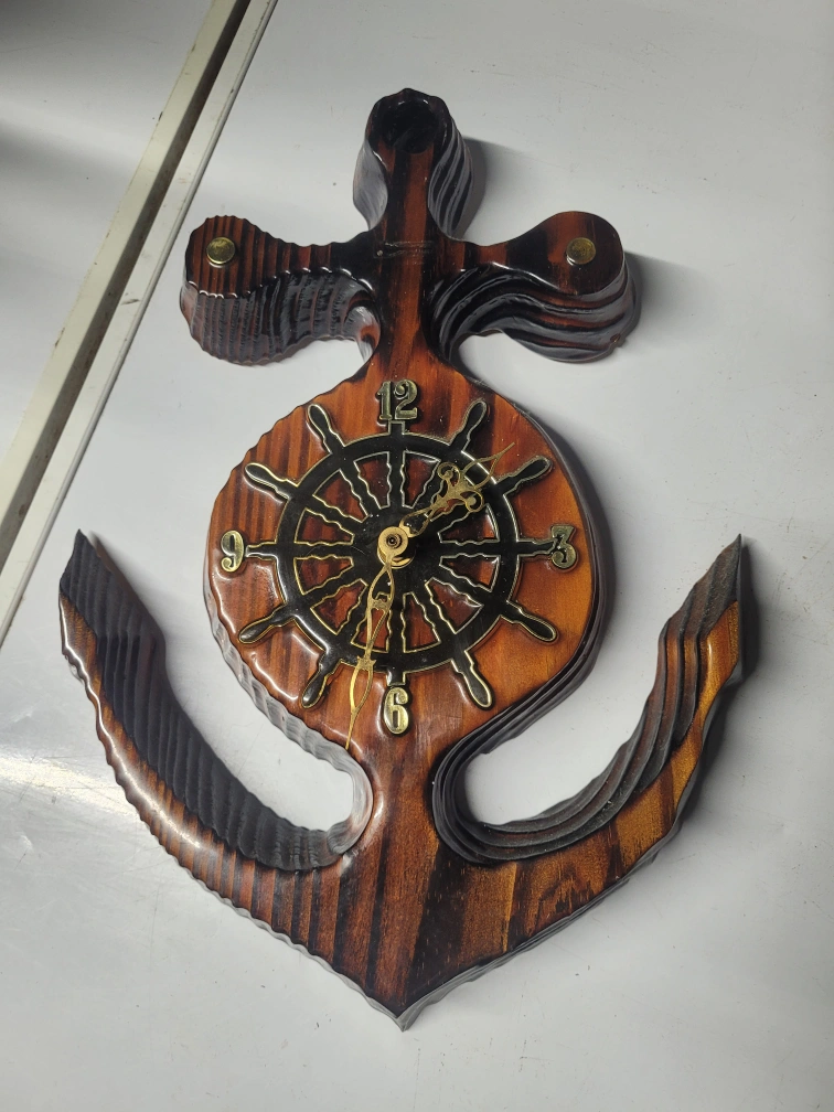 Unique wooden anchor-shaped clock. Features a ship's wheel clock face. Dark wood stain finish. Wall mountable. Requires one AA battery (not included).