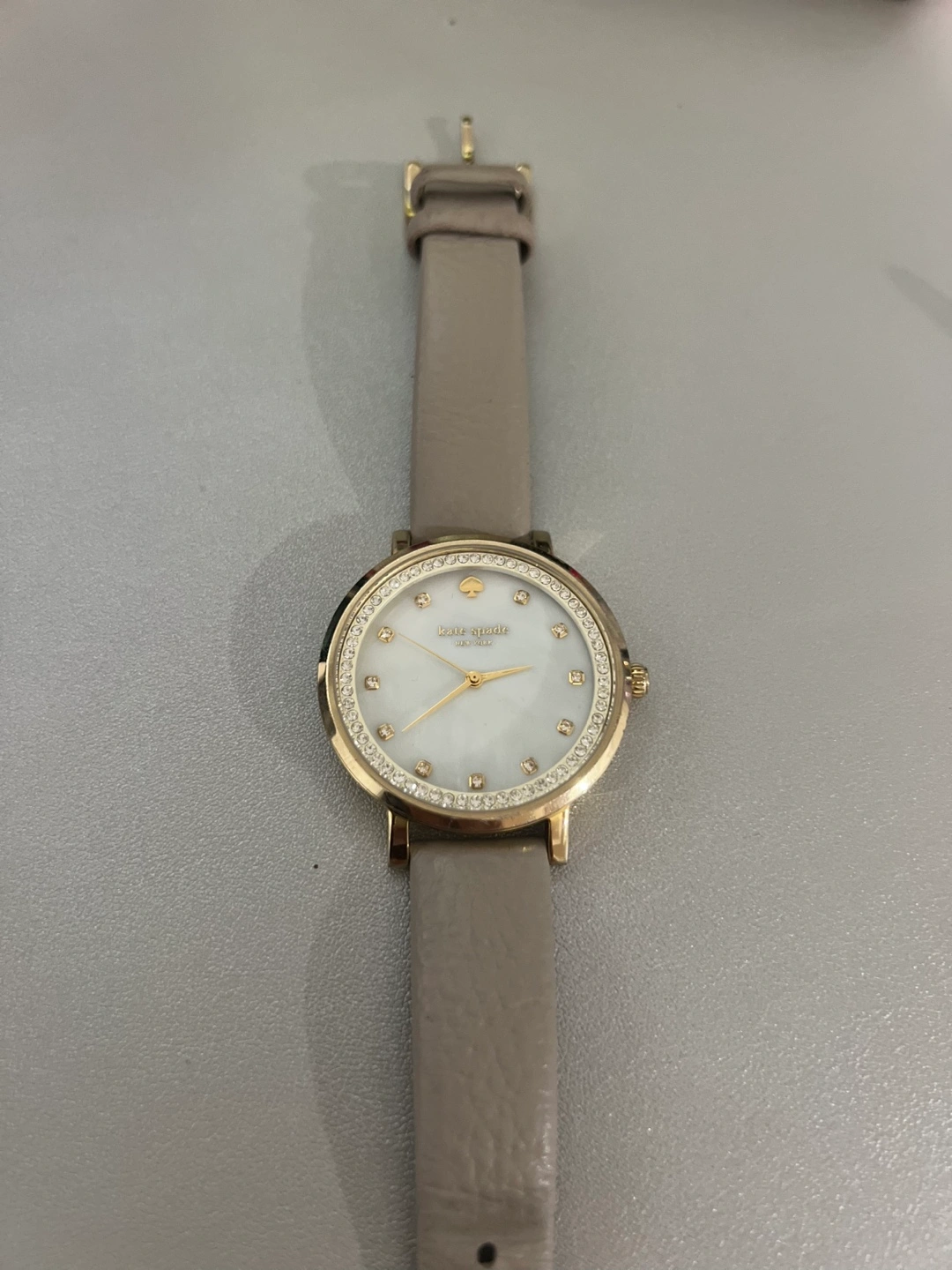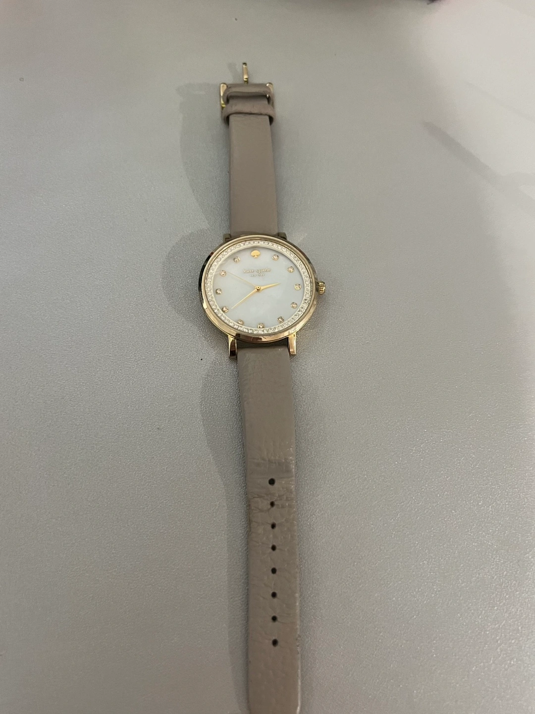 Beautiful women's watch. Features a pearly white face, gold casing, and grey leather band. Crystal accents around the bezel. Simple, elegant design. Perfect for everyday wear.