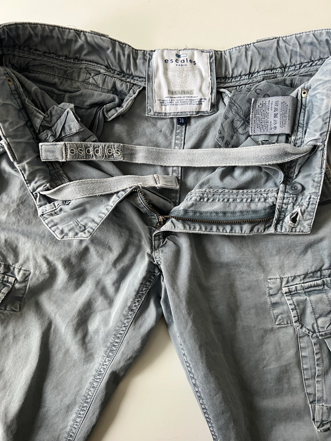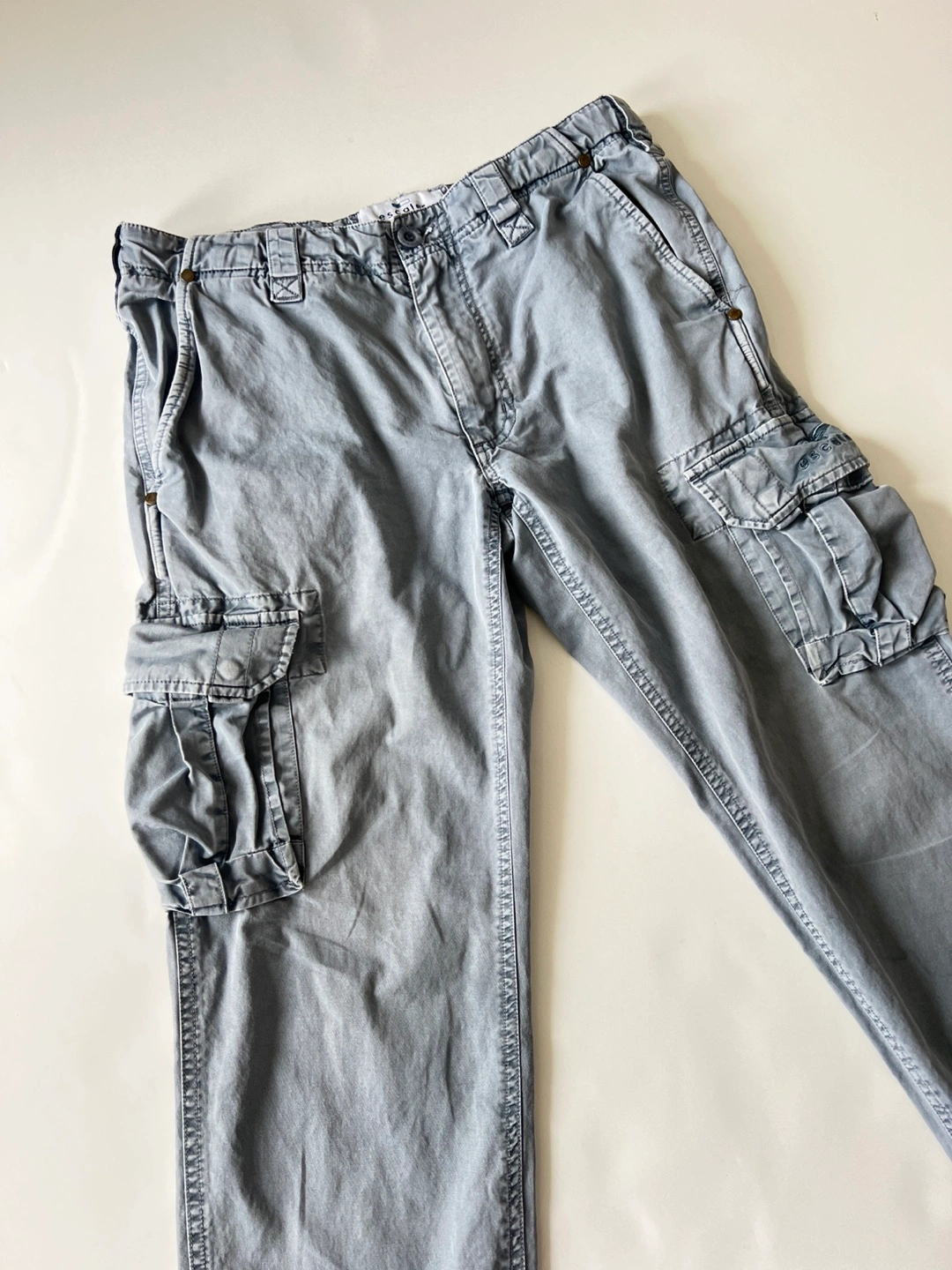 Blue Grey distressed cargo pants. Multiple pockets. Straight leg. Good condition. Very sexy men’s pants.