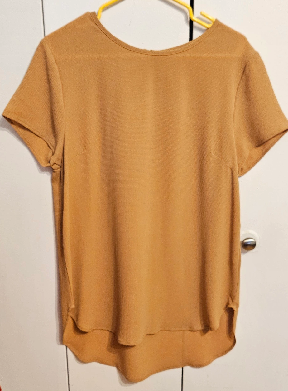 Women's short sleeve blouse. High-low hemline. Relaxed fit. Has a zipper on the top back. Lightweight material. Perfect for office wear/professional wear. Perfect condition, worn once. Color is peachy-orange pick up only*** no meet ups