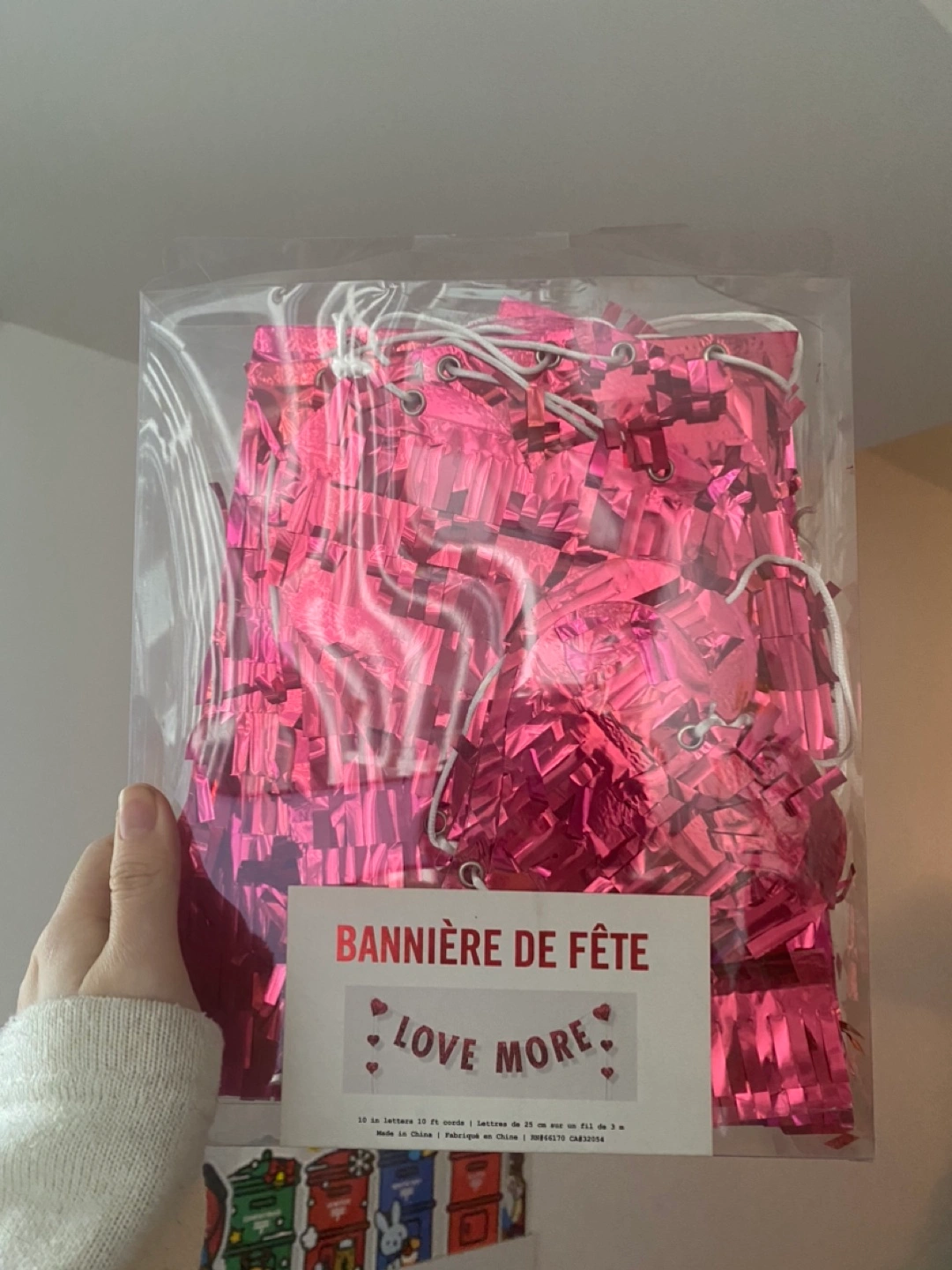 Pink metallic fringe party banner. Says Love More. I can meet at Adelaide east & sherbourne or king station most of the days!