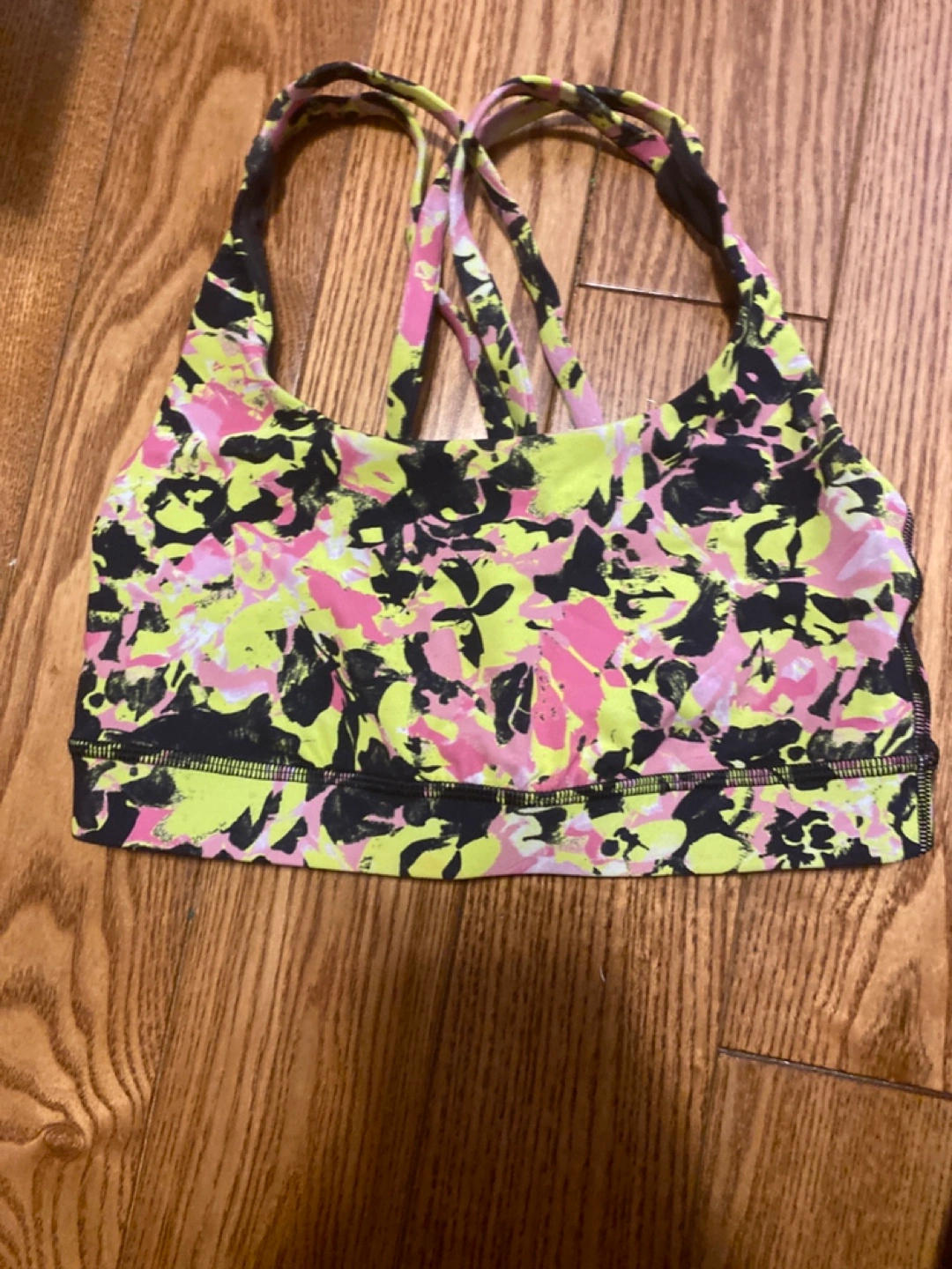 Lululemon Energy bra. Cross-back design. Floral print in pink, yellow, and black. Excellent for low-impact activities.