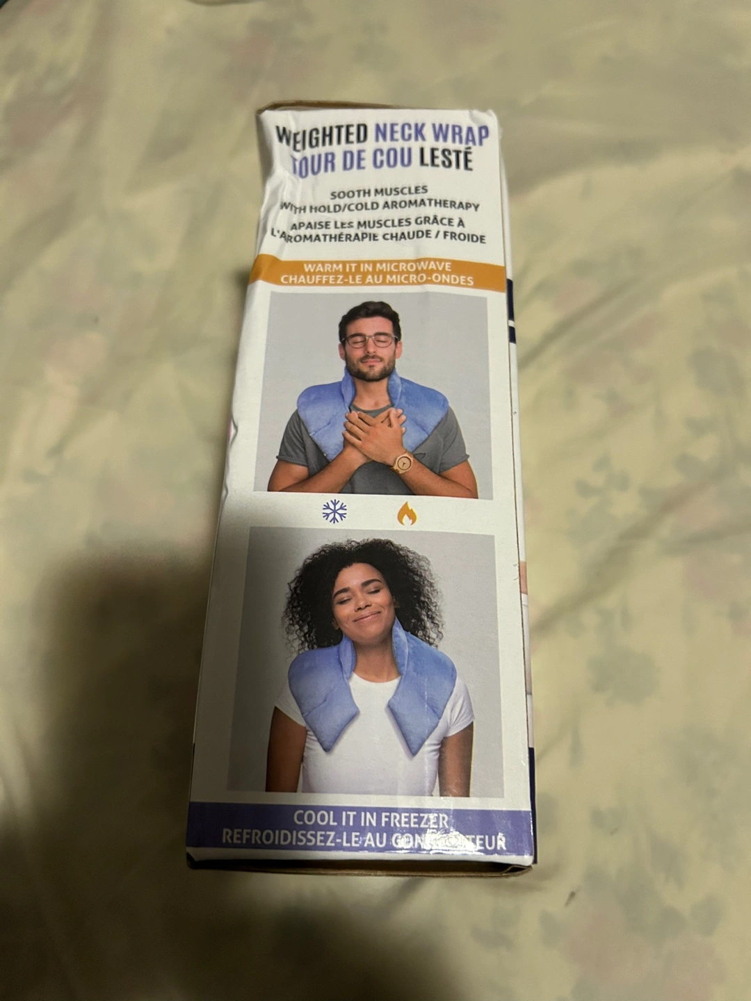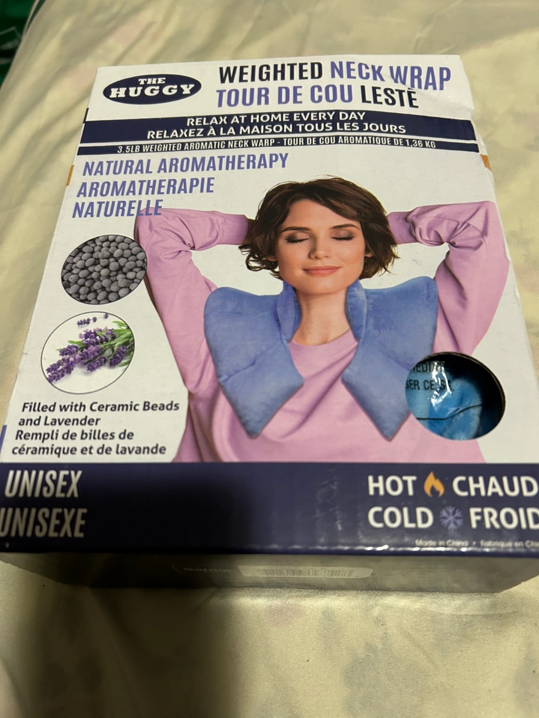 3.5lb weighted neck wrap. Lavender and ceramic beads. Microwave or freezer safe. Unisex. Soothes muscles. box is sealed never opened (small dent on the box upper right corner)
