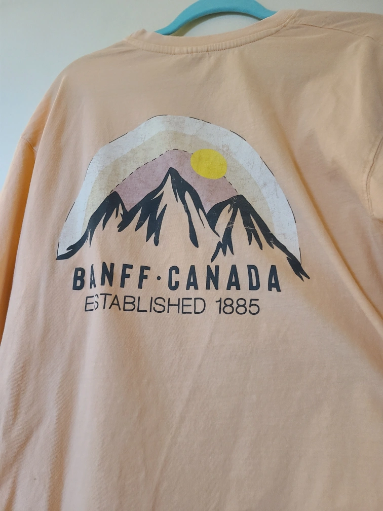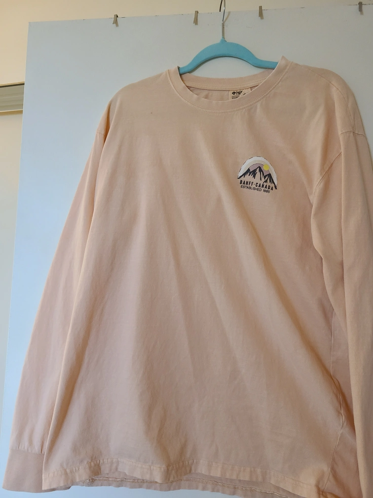 Peach-coloured long-sleeve shirt. Features a graphic design on the back and front. Mountain range design with Banff Canada and established 1885. Downsizing my closet.
