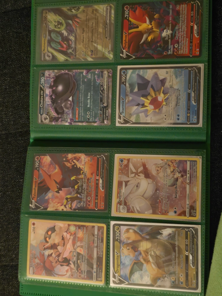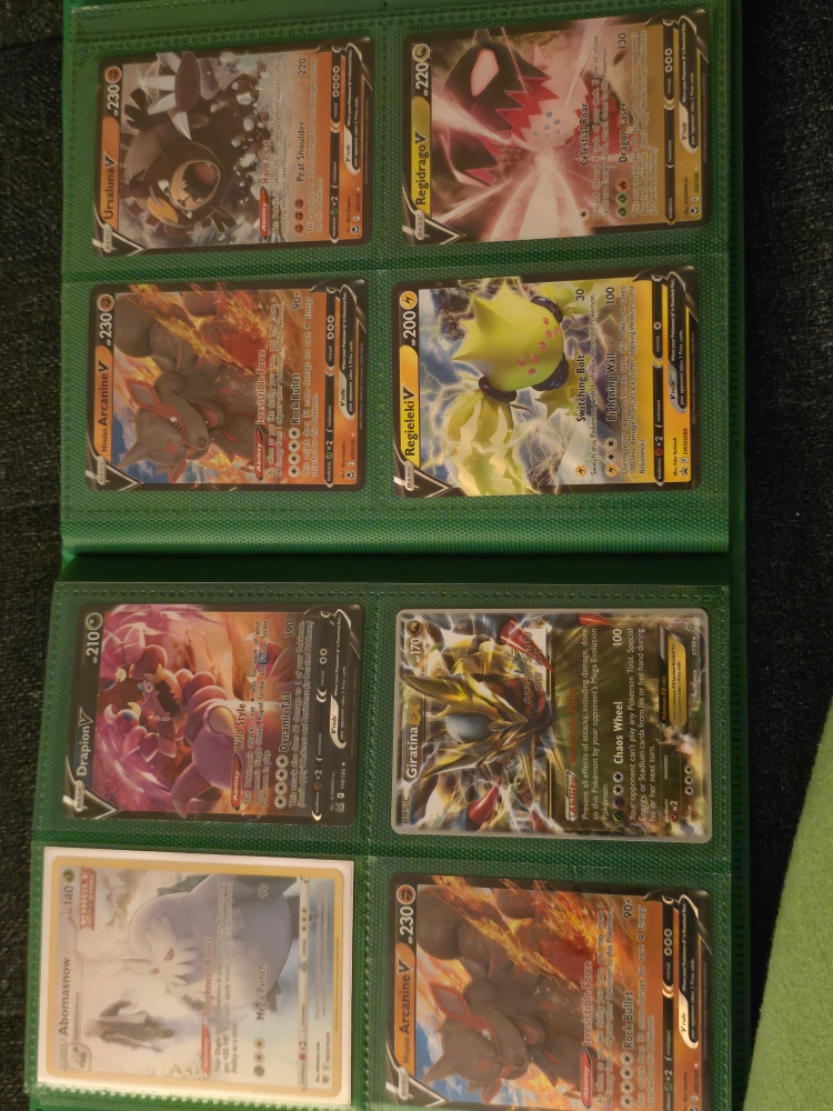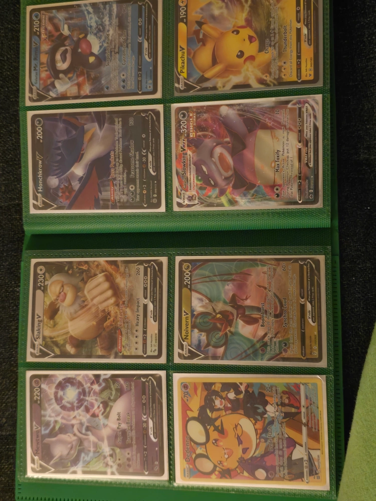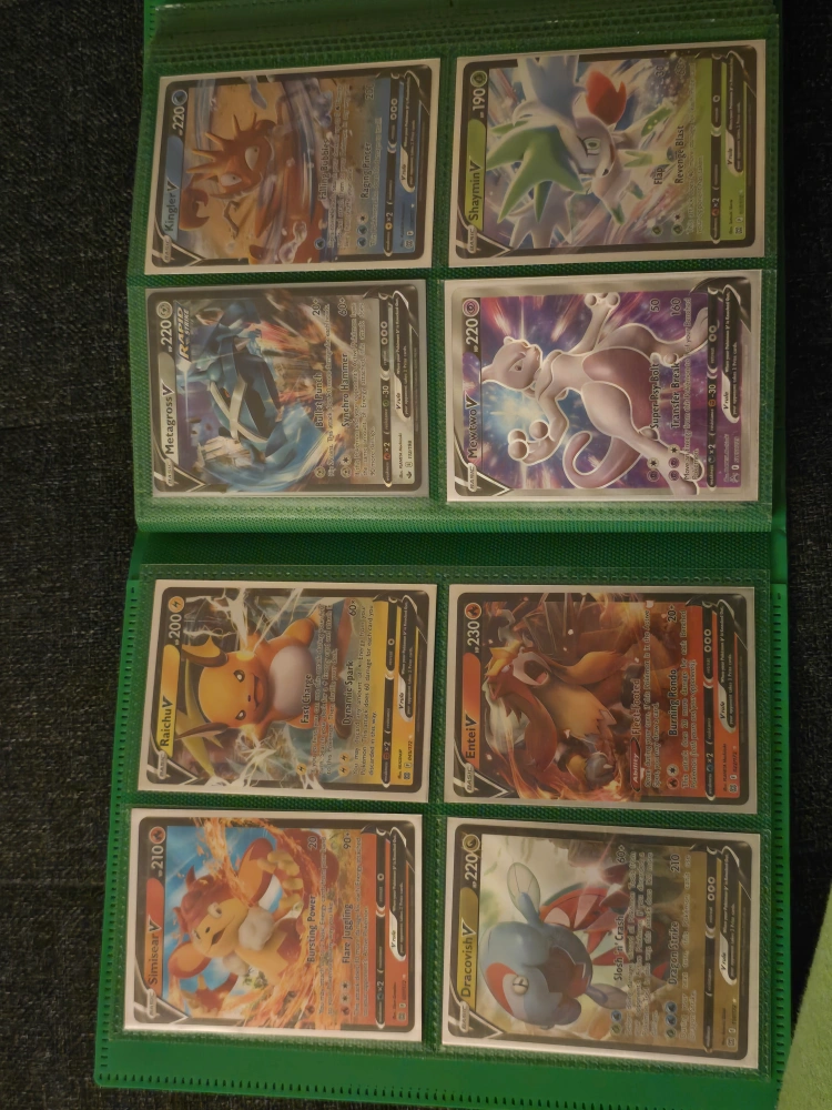 Large collection of Pokemon cards. Includes various V cards and other valuable cards. Great for collectors or players. Cards are in sleeves and pages.