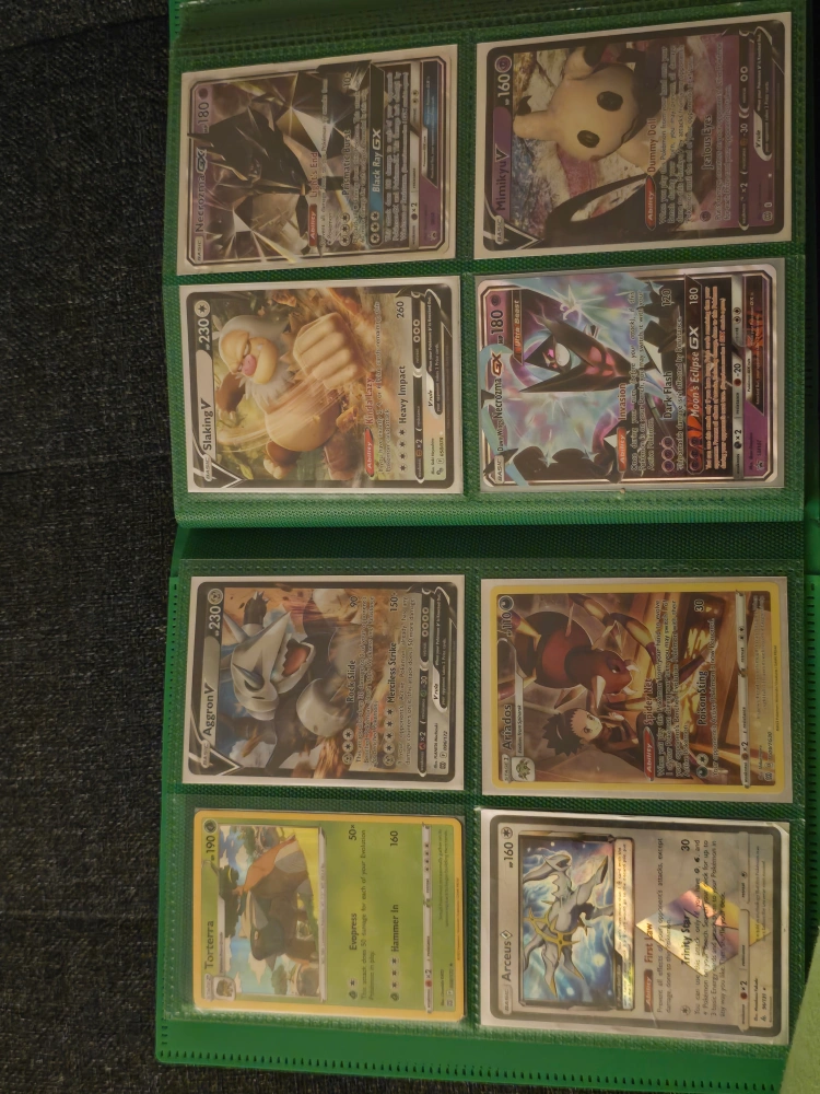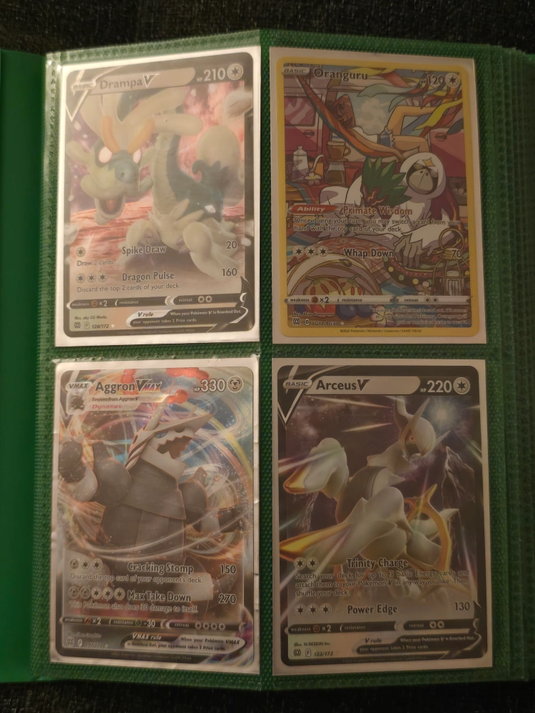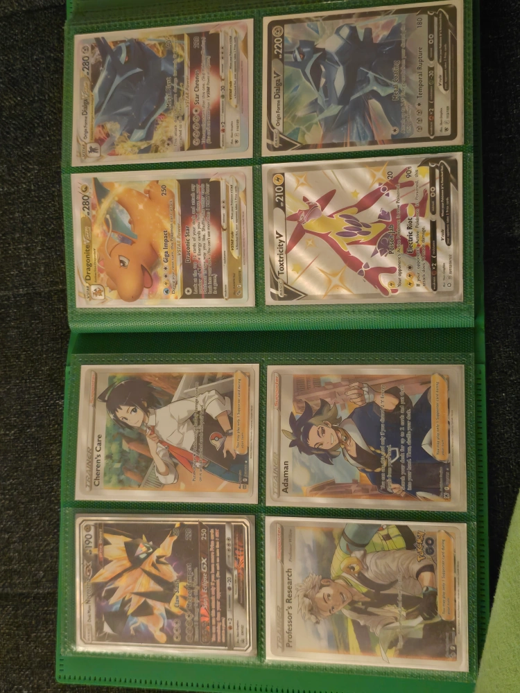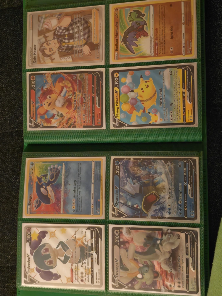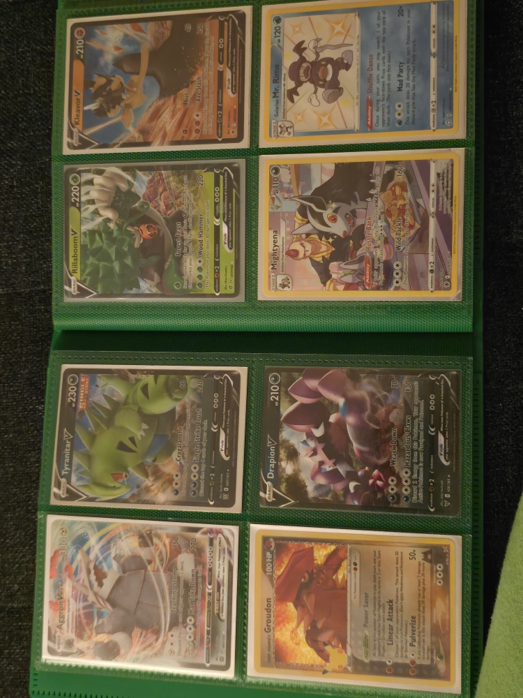 Large collection of Pokemon cards. Includes various V cards and other valuable cards. Great for collectors or players. Cards are in sleeves and pages.