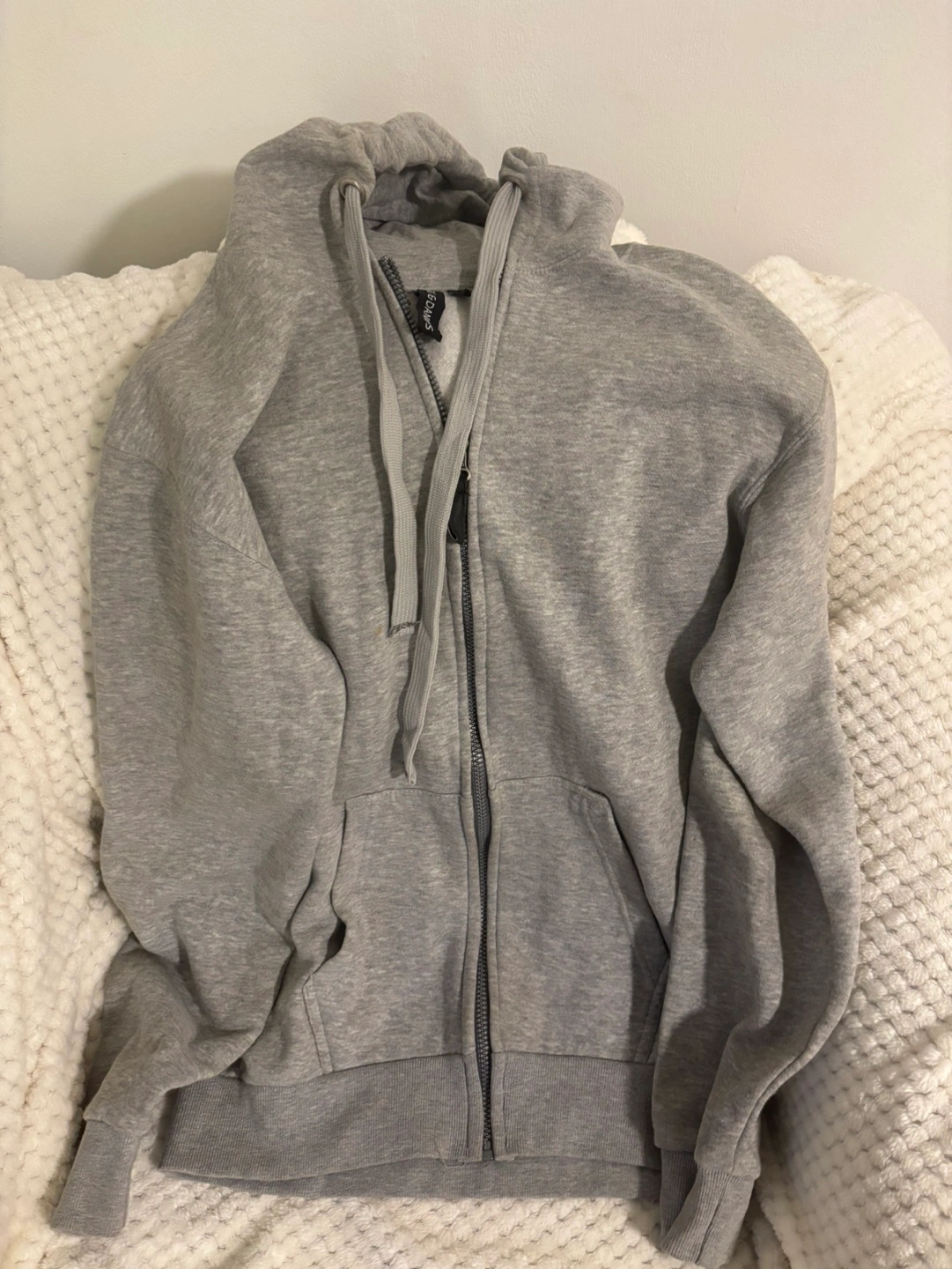 Grey zip-up hoodie. Long sleeves. Front pockets. Drawstring hood.