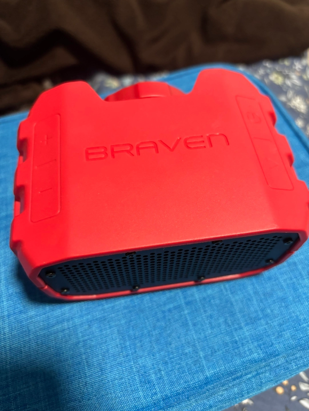 Red portable Bluetooth speaker. Durable and waterproof design. Features multiple buttons and ports. Compact and easily transportable. Model BRV-1s.