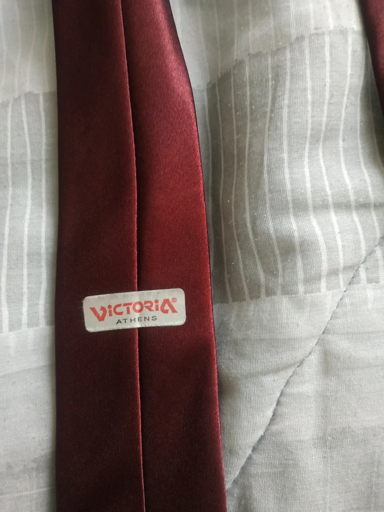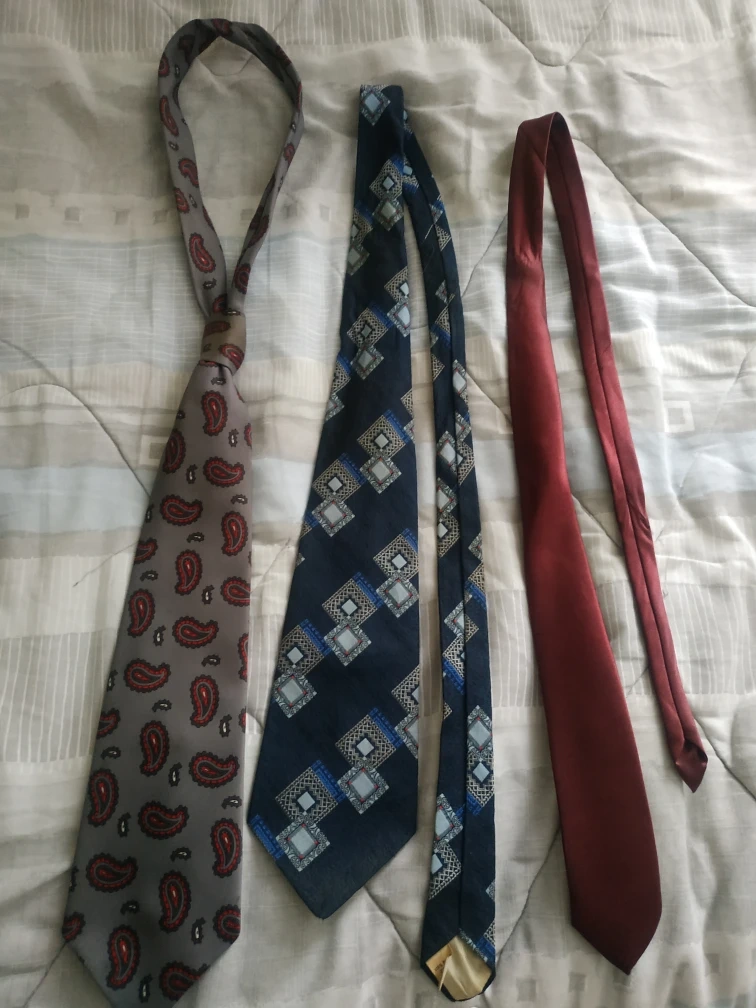Bundle of three vintage ties. One burgundy tie, one navy blue geometric patterned tie, and one grey paisley patterned tie. Varying brands and materials. Will need to be washed/cleaned.