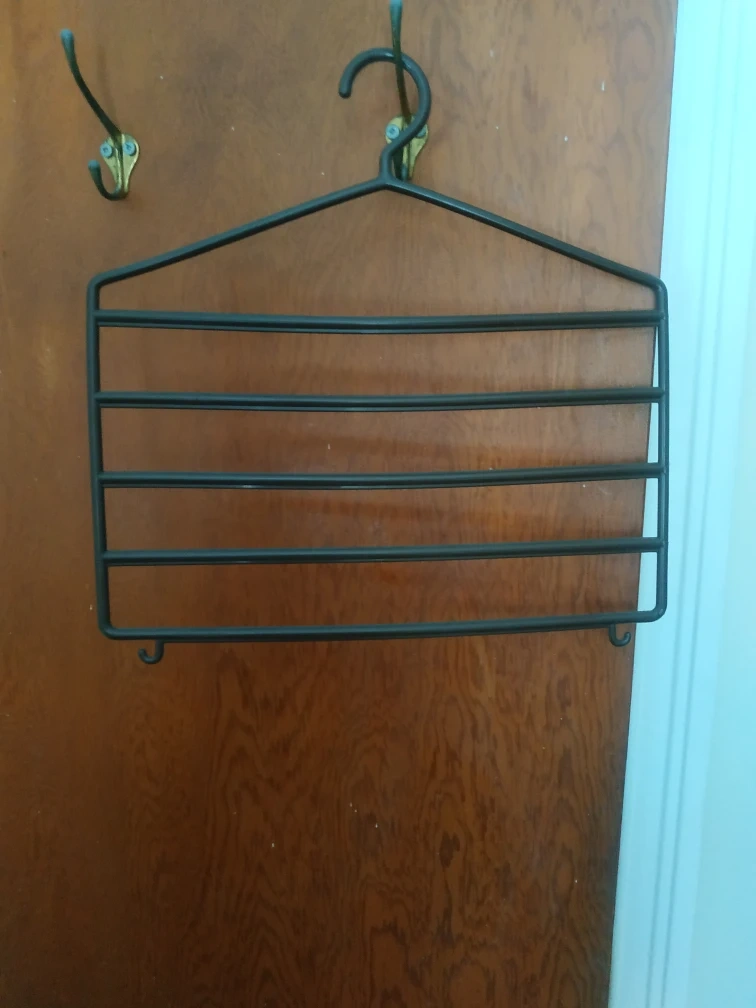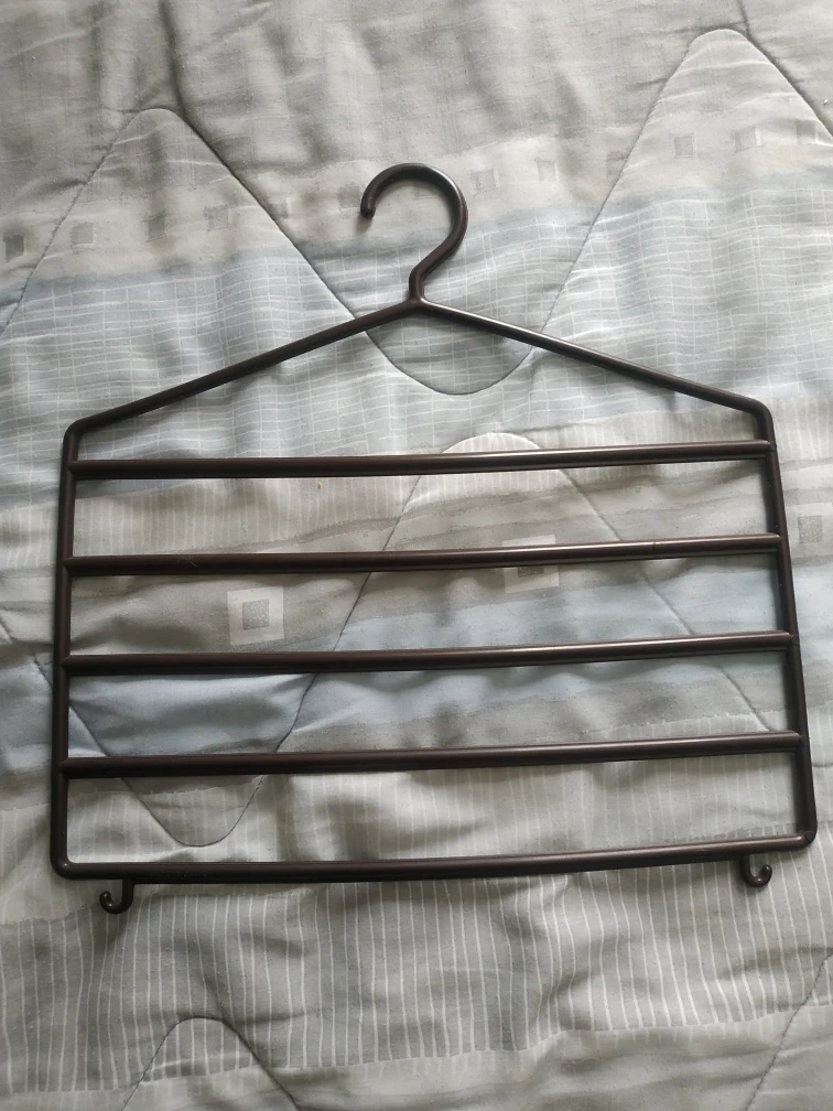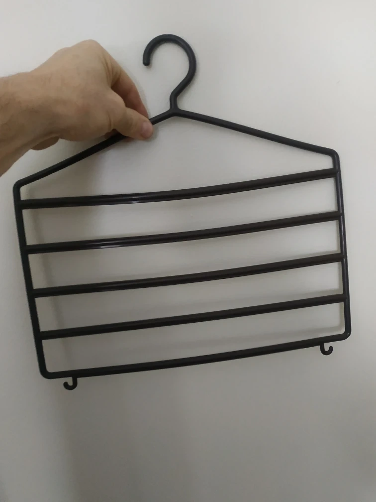Dark brown plastic trouser hanger. Five slots for pants. Hangs on a closet rod. Good for organizing pants.