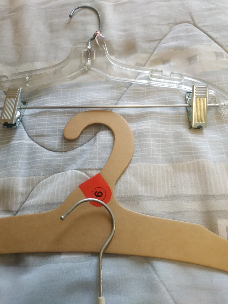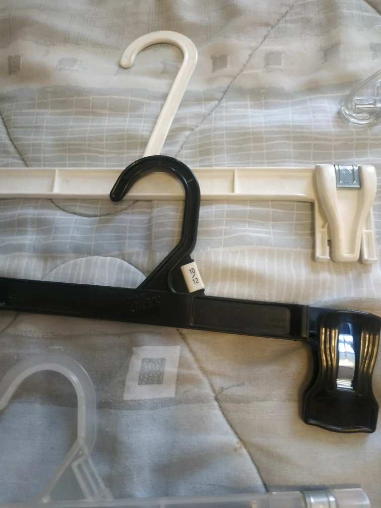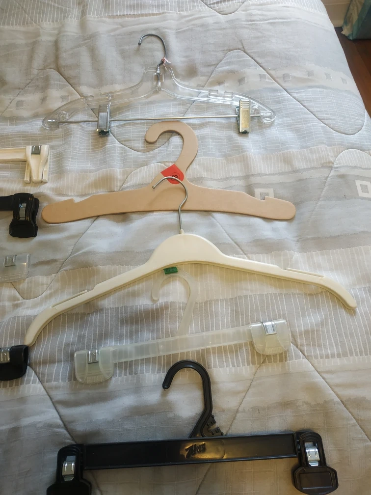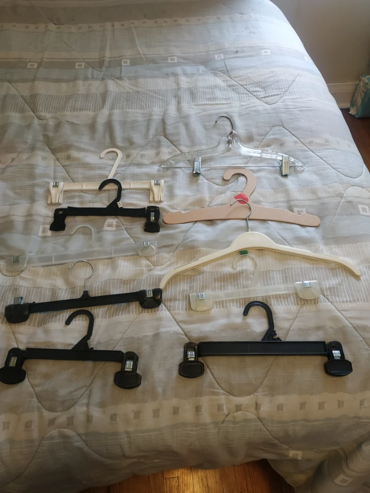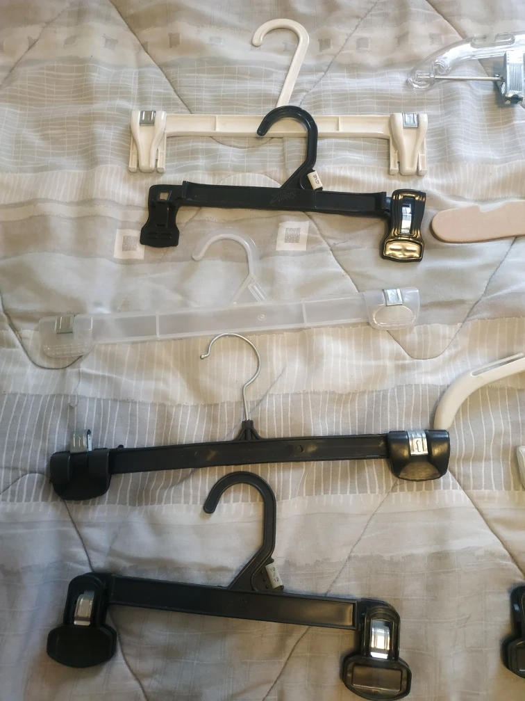 Variety of plastic hangers. Includes clips. Good for storing children's clothes.