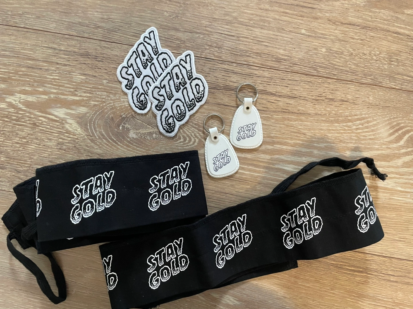 Wrist wraps, keychains, and iron-on patches. Black fabric wrist wraps with white Stay Gold logo. White leather keychains with black Stay Gold logo. White iron-on patches with black Stay Gold logo.