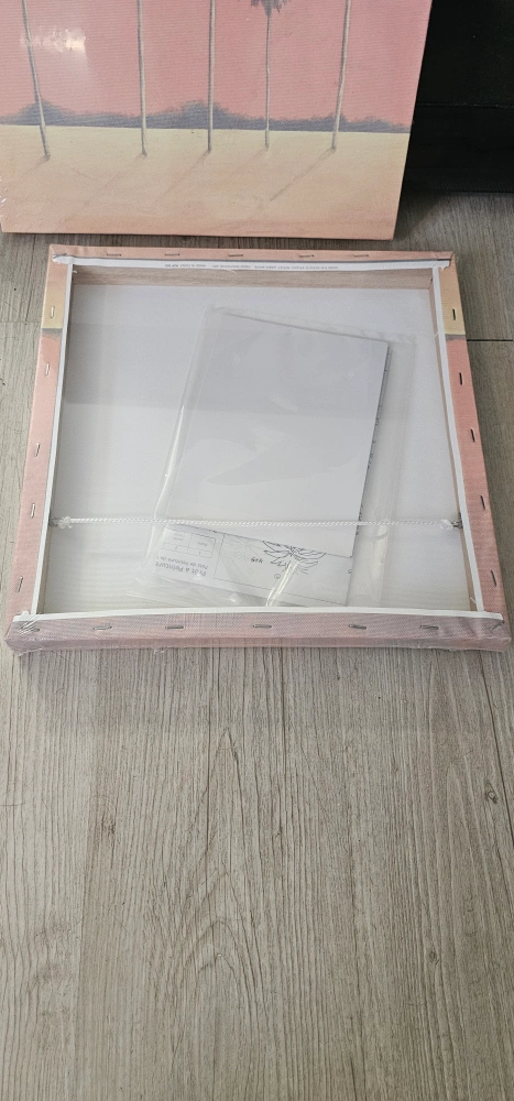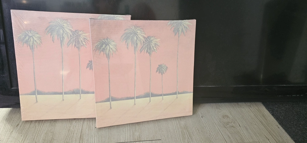 Two matching square canvases. Pink background, palm trees. New, still in packaging. Perfect for home decor.