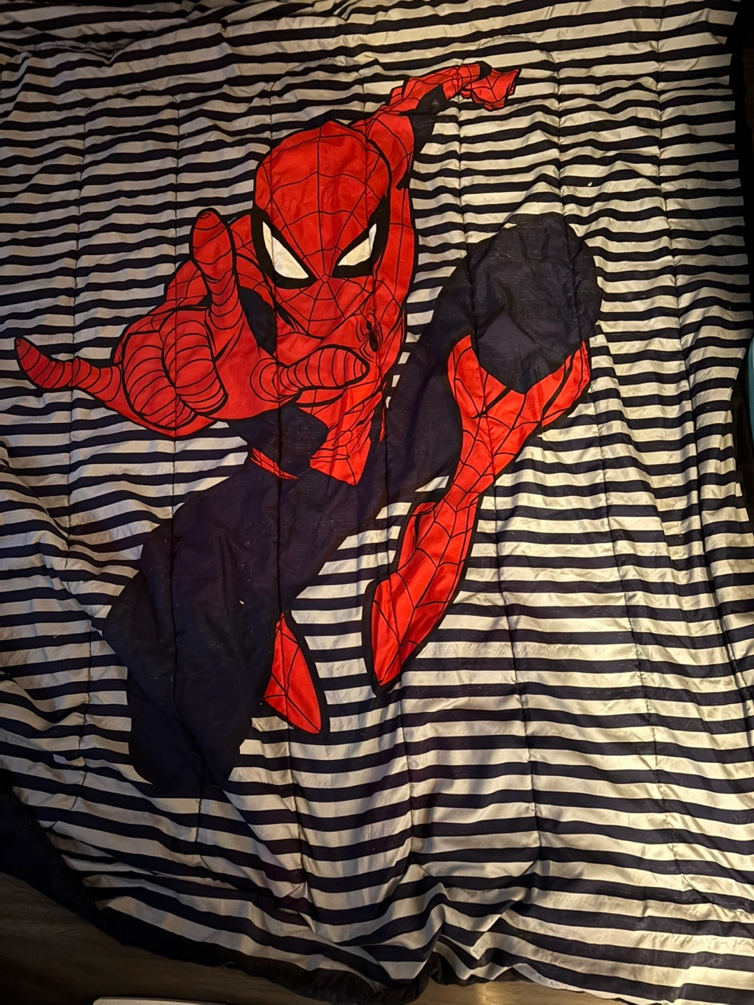 Used Spider-Man comforter. Features a large Spider-Man graphic on a navy and grey striped background. Suitable for a child's bed. Pick up only! Smoke free environment!!